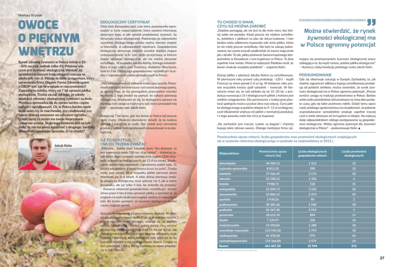 Mariusz Krysiak OWOCE O PIĘKNYM WNĘTRZU Rynek zdrowej żywności w Polsce rośnie o 20– –30% rocznie. Jednak tylko 4% Polaków wie, czym jest żywność ekologiczna. Wartość jej sprzedaży w naszym kraju eksperci szacują na około 600 mln zł. Podaję te dane za raportem, który opracowała firma Organic Farma Zdrowia razem z OBOP-em. Jak to wygląda w rzeczywistości? Zapytaliśmy rolnika, który od 7 lat uprawia jabłka ekologiczne. Trzeba zacząć od tego, że szkoły produkcji zdrowej i ekologicznej żywności są dwie. Pierwsza sprowadza się do upraw bardzo często małych i ogródkowych. Ot, w Polsce bardzo wiele osób sadzi czy to marchewkę, czy rzodkiewkę, czy nawet drzewa owocowe we własnym ogródku. Dzięki temu co sezon ma swoje niepryskane i smaczne owoce. Skala tego działania jest na tyle mała, że nie ma sensu korzystać z drugiego, bardziej zbiurokratyzowanego, sposobu. O co chodzi? Jakub Kelm właściciel ekologicznego sadu www.ecohills.pl EKOLOGICZNY CERTYFIKAT Otóż Unia Europejska jakiś czas temu postanowiła wprowadzić w życie rozporządzenie, które zawiera informacje dotyczące tego, w jaki sposób produkować żywność, by otrzymała status ekologicznej. Potwierdza to odpowiedni certyfikat. Ekologicznego rolnika można również znaleźć w internecie, w odpowiednich rejestrach. Gospodarstwo ekologiczne otrzymuje również wysokie dopłaty mające zrekompensować m.in. tzw. okres przejściowy, w którym trzeba uprawiać ekologicznie, ale nie można otrzymać certyfikatu. W wypadku Jakuba Kelma, którego odwiedziliśmy w jego sadzie pod Trzebnicą, niedaleko Wrocławia, było to 5 lat. Dzisiaj jego gospodarstwo <ecohills.pl> to jeden z największych sadów ekologicznych w Polsce. „Mój tato zajmował się sadem w tradycyjny sposób. Postanowił jednak iść na emeryturę i sad został pod moją opieką. Ja oprócz tego, że mu pomagałem, pracowałem również na etacie. Z tego zrodził się pomysł, by założyć plantację ekologiczną. Wydawało mi się, że ekologiczna uprawa nie wymaga tyle uwagi co tradycyjny sad, który prowadził mój tato” – opowiada nam Jakub Kelm. Rozpoczął 7 lat temu, gdy ten temat w Polsce był jeszcze mało znany. Okoliczni plantatorzy mówili, że to szalony pomysł, i pukali się w czoło. Oni zostali przy normalnej produkcji jabłek. Kelm postanowił zainwestować w tę ekologiczną. ILE TO KOSZTUJE I NA CO TRZEBA UWAŻAĆ „Policzmy… Gdyby mieć kawałek ziemi, bez drzewek, to jest inwestycja rzędu 100 tys. zł za hektar” – tłumaczy Jakub Kelm. Jego rachunek zakłada m.in. kupno 2200 drzewek, oczywiście ekologicznych, po 13 zł za sztukę, zbudowanie wokół nich rusztowań i ogrodzenia wokół sadu. To koszty początkowe. A kiedy można liczyć na zyski? „Trzeba wziąć pod uwagę, że w wypadku jabłek pierwsze plony zbierzemy po 3–4 latach. A żeby dzisiaj plantacja została uznana za ekologiczną, musi upłynąć nie 5, jak w moim przypadku, ale już tylko 4 lata, bo zmieniły się przepisy” – tłumaczy właściciel gospodarstwa <ecohills.pl>. Innymi słowy przez 4 lata trzeba uprawiać jabłka, a sprzedać je, ze względu na mało atrakcyjny wygląd, można co najwyżej na soki. Bo trzeba pamiętać, że żywność ekologiczna bardzo często wygląda gorzej. Sytuację finansową do tej pory ratowały dopłaty. W okresie przejściowym nawet około 2 tys. zł do hektara rocznie, potem niewiele mniej. Niestety, okazuje się, że dopłaty zostały ograniczone i rolnicy, którzy dzisiaj chcą założyć ekologiczny sad jabłkowy, nie mają co na nie liczyć. Jak tłumaczy ministerstwo rolnictwa, to przez olbrzymią skalę nadużyć i plantacje, które zakładane były tylko po to, by wyłudzić dopłaty, a nie wyprodukować owoce. Cierpią na tym prawdziwi rolnicy. Wciąż czekamy na nowe propozycje w tym zakresie. TU CHODZI O SMAK, CZYLI ILE MOŻNA ZAROBIĆ „Dopłaty pomagają, ale nie jest to dla mnie rzecz, bez której sobie nie poradzę. Kiedy jeszcze nie miałem certyfikatu, jeździłem z jabłkami na plac do Jelcza-Laskowic. I tam bardzo wielu odbiorców kupowało ode mnie jabłka, mimo że nie miały jeszcze certyfikatu. Nie były to zakupy jednorazowe, bo często wracali i podkreślali, że owoce mają smak jak z działki. To tak, jakby porównać banana kupionego bezpośrednio w Ekwadorze z tym kupionym w Polsce. To dwa zupełnie inne światy. Mimo to większość Polaków myśli, że banan smakuje wszędzie podobnie” – wyjaśnia Kelm. Dzisiaj jabłka z plantacji Jakuba Kelma są certyfikowane. W pierwszym roku prawie całą produkcję –120 t – kupili Francuzi za nieco ponad 2 zł za kg. W kolejnym roku prawie wszystkie kwiaty zjadł szkodnik – kwieciak. W literaturze mówi się, że sad zakłada się na 15–20 lat, a produkcja wynosząca 15 t ekologicznych jabłek z hektara jest wielkim osiągnięciem. Dla porównania z tradycyjnej plantacji spokojnie można uzyskać dwa razy więcej. Cena jabłka ekologicznego w polskim sklepie to 9–12 zł za kilogram, czyli kilkakrotnie większa niż jabłek z normalnej produkcji. I z tego powodu mało kto chce je kupować. „Na zachodzie jest inaczej. Ludzie są bogatsi i chętniej kupują takie zdrowe owoce. Dlatego tamtejsze firmy zaj- Można stwierdzić, że rynek żywności ekologicznej ma w Polsce ogromny potencjał mujące się przetwarzaniem żywności ekologicznej wręcz zabiegają o to, by kupić tańsze, polskie jabłka ekologiczne” – tłumaczy słabą kondycję polskiego rynku Jakub Kelm. PODSUMOWANIE Gdy się obserwuje sytuację w Europie Zachodniej, to, jak chętnie zagraniczni odbiorcy kupują certyfikowaną produkcję od polskich rolników, można stwierdzić, że rynek żywności ekologicznej ma w Polsce ogromny potencjał. „Proszę zwrócić uwagę na tradycję przetwórstwa w Polsce. Bardzo wiele osób samodzielnie robi przetwory na zimę albo pamięta czasy, gdy się takie przetwory robiło. Dzięki 