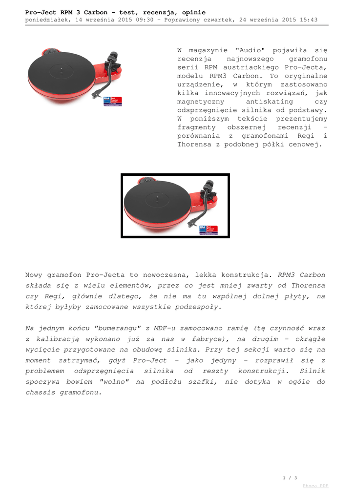 Pro-Ject RPM 3 Carbon - test, recenzja, opinie poniedziałek, 14 września 2015 09:30 - Poprawiony czwartek, 24 września 2015 15:43 W magazynie "Audio" pojawiła się recenzja najnowszego gramofonu serii RPM austriackiego Pro-Jecta, modelu RPM3 Carbon. To oryginalne urządzenie, w którym zastosowano kilka innowacyjnych rozwiązań, jak magnetyczny antiskating czy odsprzęgnięcie silnika od podstawy. W poniższym tekście prezentujemy fragmenty obszernej recenzji porównania z gramofonami Regi i Thorensa z podobnej półki cenowej. Nowy gramofon Pro-Jecta to nowoczesna, lekka konstrukcja. RPM3 Carbon składa się z wielu elementów, przez co jest mniej zwarty od Thorensa czy Regi, głównie dlatego, że nie ma tu wspólnej dolnej płyty, na której byłyby zamocowane wszystkie podzespoły. Na jednym końcu "bumerangu" z MDF-u zamocowano ramię (tę czynność wraz z kalibracją wykonano już za nas w fabryce), na drugim - okrągłe wycięcie przygotowane na obudowę silnika. Przy tej sekcji warto się na moment zatrzymać, gdyż Pro-Ject - jako jedyny - rozprawił się z problemem odsprzęgnięcia silnika od reszty konstrukcji. Silnik spoczywa bowiem "wolno" na podłożu szafki, nie dotyka w ogóle do chassis gramofonu. 1 / 3 Phoca PDF Pro-Ject RPM 3 Carbon - test, recenzja, opinie poniedziałek, 14 września 2015 09:30 - Poprawiony czwartek, 24 września 2015 15:43 Paskowy napęd nie korzysta z dodatkowego subtalerza, otaczając talerz na zewnątrz. W wersji podstawowej nie znajdziemy tam elektronicznego selektora prędkości obrotowej. Pasek należy samodzielnie przekładać na sąsiednie koło napędowe. Wobec konkurentów testu RPM3 Carbon wyróżnił się zastosowaniem ramienia typu S, znanego z droższych gramofonów firmy, wykonanego z plecionki włókna węglowego (co widać gołym okiem), aluminium oraz żywicy, które trzeba było trzykrotnie podgrzewać je w temperaturach między 50 a 120 st. C, pod ciśnieniem sięgającym 100 atmosfer. Efektem tych zabiegów jest znakomita sztywność oraz wewnętrzne tłumienie redukujące rezonanse. Nowością jest również magnetyczny układ antiskatingu, coraz częściej zastępujący tradycyjne systemy oparte na ciężarku. Tak też jest w RPM3 Carbon, mechanizm regulacyjny działa przy tym bardzo precyzyjnie. Przeciwwaga to zdawałoby się zwykły krążek przesuwany po trzpieniu, ale i tu znajdziemy coś specjalnego - elementy mocujące wzbogacono bowiem o wytłumienie TPE. 2 / 3 Phoca PDF Pro-Ject RPM 3 Carbon - test, recenzja, opinie poniedziałek, 14 września 2015 09:30 - Poprawiony czwartek, 24 września 2015 15:43 Pod względem brzmieniowym Pro-Ject uplasował się w środku stawki. Nie zagrał "typowo" analogowo, z drugiej strony unikając nadmiernych ostrości. Charakteryzuje się wysoką dokładnością i neutralnością, którą Rafał Pietrzak z Audio opisał w następujący sposób: dźwięk nie jest jednostronny i jednoznaczny, łatwo w nim poczuć ciepło i doświadczyć delikatności. Wszystko jednak zaczyna się od ciemnego tła, na którym dźwięki zyskują wyrazistość; ponieważ nie są ostre, nie odbieramy tego jako granie nazbyt techniczne i ultraprecyzyjne. Gramofon za dopłatą jedynie 200zł jest dostępny w zestawie z wkładką Ortofon 2M-Silver. Został uhonorowany nagrodą EISA 2015-2016. Cena i specyfikacja Pro-Ject RPM 3 Carbon w sklep.RMS.pl 3 / 3 Phoca PDF