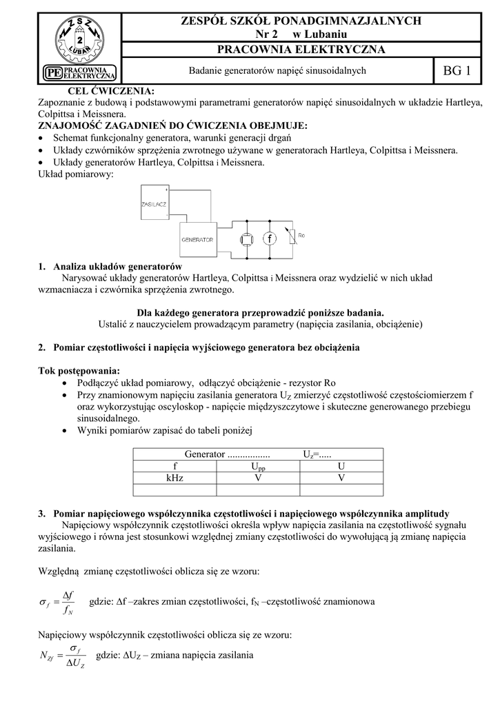 ZESPÓŁ SZKÓŁ PONADGIMNAZJALNYCH Nr 2 w Lubaniu PRACOWNIA ELEKTRYCZNA Badanie generatorów napięć sinusoidalnych BG 1 CEL ĆWICZENIA: Zapoznanie z budową i podstawowymi parametrami generatorów napięć sinusoidalnych w układzie Hartleya, Colpittsa i Meissnera. ZNAJOMOŚĆ ZAGADNIEŃ DO ĆWICZENIA OBEJMUJE: Schemat funkcjonalny generatora, warunki generacji drgań Układy czwórników sprzężenia zwrotnego używane w generatorach Hartleya, Colpittsa i Meissnera. Układy generatorów Hartleya, Colpittsa i Meissnera. Układ pomiarowy: 1. Analiza układów generatorów Narysować układy generatorów Hartleya, Colpittsa i Meissnera oraz wydzielić w nich układ wzmacniacza i czwórnika sprzężenia zwrotnego. Dla każdego generatora przeprowadzić poniższe badania. Ustalić z nauczycielem prowadzącym parametry (napięcia zasilania, obciążenie) 2. Pomiar częstotliwości i napięcia wyjściowego generatora bez obciążenia Tok postępowania: Podłączyć układ pomiarowy, odłączyć obciążenie - rezystor Ro Przy znamionowym napięciu zasilania generatora UZ zmierzyć częstotliwość częstościomierzem f oraz wykorzystując oscyloskop - napięcie międzyszczytowe i skuteczne generowanego przebiegu sinusoidalnego. Wyniki pomiarów zapisać do tabeli poniżej f kHz Generator ................. Upp V Uz=..... U V 3. Pomiar napięciowego współczynnika częstotliwości i napięciowego współczynnika amplitudy Napięciowy współczynnik częstotliwości określa wpływ napięcia zasilania na częstotliwość sygnału wyjściowego i równa jest stosunkowi względnej zmiany częstotliwości do wywołującą ją zmianę napięcia zasilania. Względną zmianę częstotliwości oblicza się ze wzoru: f f fN gdzie: f –zakres zmian częstotliwości, fN –częstotliwość znamionowa Napięciowy współczynnik częstotliwości oblicza się ze wzoru: N Zf f U Z gdzie: UZ – zmiana napięcia zasilania Podobnie - napięciowy współczynnik amplitudy określa wpływ napięcia zasilania na amplitudę drgań generatora i równa jest stosunkowi względnej zmiany amplitudy sygnału wyjściowego do wywołującą ją zmianę napięcia zasilania. Względną zmianę amplitudy oblicza się ze wzoru: U U UN gdzie: U –zakres zmian napięcia wyjściowego, UN –wyjściowe napięcie znamionowa Napięciowy współczynnik amplitudy oblicza się ze wzoru: N ZU U U Z gdzie: UZ – zmiana napięcia zasilania Tok postępowania: Podłączyć układ pomiarowy, odłączyć obciążenie - rezystor Ro Włączyć generator do zasilacza ustawionego na napięcie znamionowe zasilania generatora Zmniejszać napięcie zasilania i odczytywać amplitudę oraz częstotliwość drgań generatora do momentu zaniku drgań Ustawić zasilanie na napięcie znamionowa Zwiększać napięcie zasilania i odczytywać amplitudę oraz częstotliwość drgań generatora do momentu zaniku drgań lub do maksymalnego napięcia zasilania Wyniki pomiarów zapisać do tabeli Obliczyć napięciowy współczynnik częstotliwości i napięciowy współczynnik amplitudy UZ [V] Uwy [V] f [kHz] UZ=UN= 4. Badanie wpływu obciążenia na amplitudę i częstotliwość drgań generatora i wyznaczanie rezystancji wyjściowej generatora Tok postępowania: Podłączyć układ pomiarowy z obciążeniem - rezystor Ro Włączyć generator do zasilacza ustawionego na napięcie znamionowe zasilania generatora Zmniejszać rezystancję obciążenia do zaniku drgań zapisują jednocześnie w tabeli częstotliwość i napięcie wyjściowe generatora. Zwrócić uwagę przy pomiarze, w którym napięcie wyjściowe będzie równe połowie napięcia wyjściowego bez obciążenia. Przy tym ustawieniu rezystancja obciążenia równa jest rezystancji wyjściowej generatora. RO Uwy fwy V kHz 0 UwyN/2=....... Pytania kontrolne: 1. Podaj ogólną budowę generatora LC 2. Jakie są i na czym polegają warunki generacji drgań 3. Narysuj układy generatorów Hartleya, Copittsa i Meissnera. Opracowania: 1. Na podstawie uzyskanych danych narysuj charakterystyki Uwy=f(Uz), f=f(Uz), Uwy=f(RO), f=f(RO).