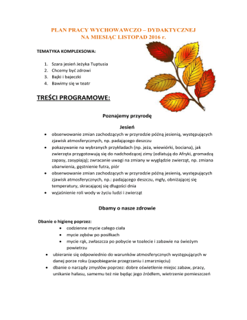 PLAN PRACY WYCHOWAWCZO – DYDAKTYCZNEJ NA MIESIĄC LISTOPAD 2016 r. TEMATYKA KOMPLEKSOWA: 1. 2. 3. 4. Szara jesień Jeżyka Tuptusia Chcemy być zdrowi Bajki i bajeczki Bawimy się w teatr TREŚCI PROGRAMOWE: Poznajemy przyrodę Jesień obserwowanie zmian zachodzących w przyrodzie późną jesienią, występujących zjawisk atmosferycznych, np. padającego deszczu pokazywanie na wybranych przykładach (np. jeża, wiewiórki, bociana), jak zwierzęta przygotowują się do nadchodzącej zimy (odlatują do Afryki, gromadzą zapasy, zasypiają); zwracanie uwagi na zmiany w wyglądzie zwierząt, np. zmiana ubarwienia, gęstnienie futra, piór obserwowanie zmian zachodzących w przyrodzie późną jesienią, występujących zjawisk atmosferycznych, np.: padającego deszczu, mgły, obniżającej się temperatury, skracającej się długości dnia wyjaśnienie roli wody w życiu ludzi i zwierząt Dbamy o nasze zdrowie Dbanie o higienę poprzez: codzienne mycie całego ciała mycie zębów po posiłkach mycie rąk, zwłaszcza po pobycie w toalecie i zabawie na świeżym powietrzu ubieranie się odpowiednio do warunków atmosferycznych występujących w danej porze roku (zapobieganie przegrzaniu i zmarznięciu) dbanie o narządy zmysłów poprzez: dobre oświetlenie miejsc zabaw, pracy, unikanie hałasu, samemu też nie będąc jego źródłem, wietrzenie pomieszczeń Zdrowa żywność spożywanie zdrowej żywności: warzyw, owoców, mięsa, nabiału (ograniczanie spożycia słodyczy, chipsów), picie kompotów, soków (ograniczenie napojów gazowanych) przezwyciężanie niechęci do nieznanych potraw Nasza sprawność ruchowa wspomaganie rozwoju ruchowego zacieśnianie kontaktów interpersonalnych z grupą poprzez wspólne organizowanie swobodnych zabaw ruchowych uczestniczenie w zabawach organizowanych w terenie Wzbudzanie zainteresowania literaturą słuchanie wierszy, opowiadań odpowiadanie na pytania dotyczące utworu literackiego recytowanie krótkich wierszy indywidualnie i zespołowo Wzbudzanie zainteresowania teatrem Udział w przedstawieniach teatralnych oglądanie przedstawień teatralnych dla dzieci w przedszkolu, wyjaśnienie znaczenia wyrazów: scena, aktor, widownia. dzielenie się swoimi odczuciami na temat obejrzanego przedstawienia przygotowanie scenek dramowych w sali, zabawy w teatr.