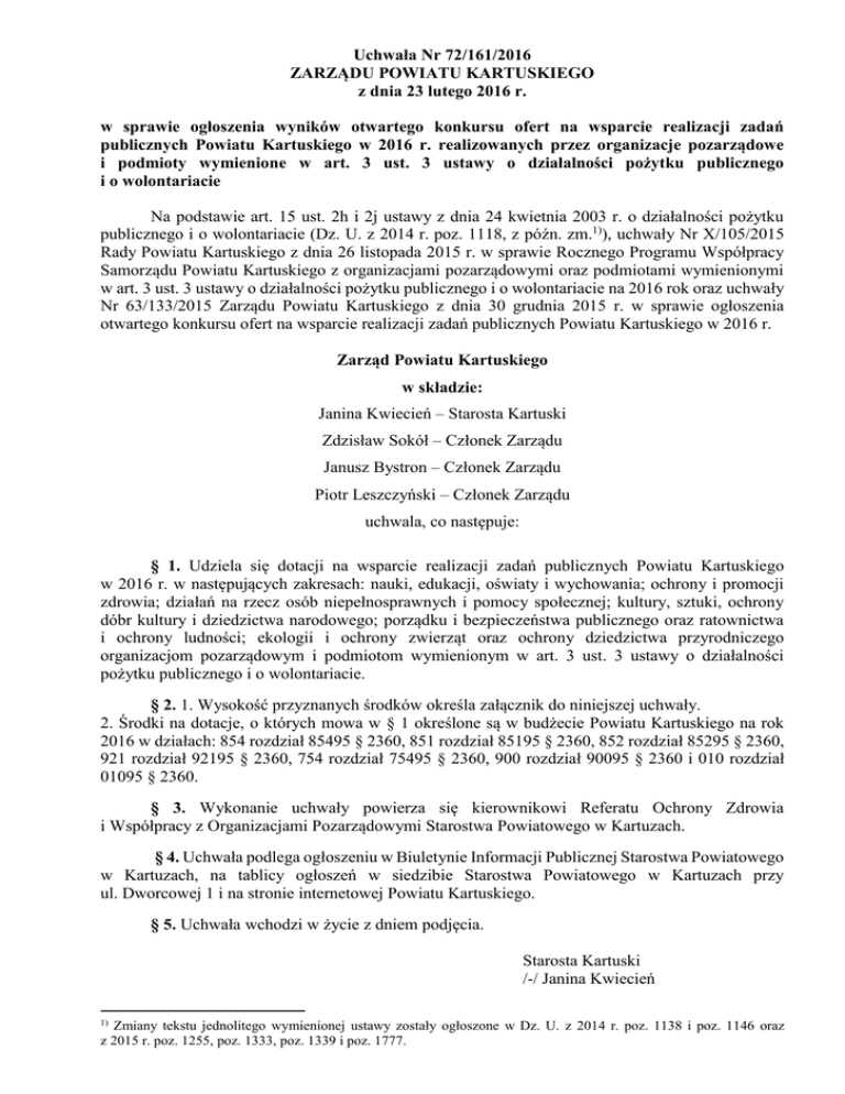 Uchwała Nr 72/161/2016 ZARZĄDU POWIATU KARTUSKIEGO z dnia 23 lutego 2016 r. w sprawie ogłoszenia wyników otwartego konkursu ofert na wsparcie realizacji zadań publicznych Powiatu Kartuskiego w 2016 r. realizowanych przez organizacje pozarządowe i podmioty wymienione w art. 3 ust. 3 ustawy o działalności pożytku publicznego i o wolontariacie Na podstawie art. 15 ust. 2h i 2j ustawy z dnia 24 kwietnia 2003 r. o działalności pożytku publicznego i o wolontariacie (Dz. U. z 2014 r. poz. 1118, z późn. zm.1)), uchwały Nr X/105/2015 Rady Powiatu Kartuskiego z dnia 26 listopada 2015 r. w sprawie Rocznego Programu Współpracy Samorządu Powiatu Kartuskiego z organizacjami pozarządowymi oraz podmiotami wymienionymi w art. 3 ust. 3 ustawy o działalności pożytku publicznego i o wolontariacie na 2016 rok oraz uchwały Nr 63/133/2015 Zarządu Powiatu Kartuskiego z dnia 30 grudnia 2015 r. w sprawie ogłoszenia otwartego konkursu ofert na wsparcie realizacji zadań publicznych Powiatu Kartuskiego w 2016 r. Zarząd Powiatu Kartuskiego w składzie: Janina Kwiecień – Starosta Kartuski Zdzisław Sokół – Członek Zarządu Janusz Bystron – Członek Zarządu Piotr Leszczyński – Członek Zarządu uchwala, co następuje: § 1. Udziela się dotacji na wsparcie realizacji zadań publicznych Powiatu Kartuskiego w 2016 r. w następujących zakresach: nauki, edukacji, oświaty i wychowania; ochrony i promocji zdrowia; działań na rzecz osób niepełnosprawnych i pomocy społecznej; kultury, sztuki, ochrony dóbr kultury i dziedzictwa narodowego; porządku i bezpieczeństwa publicznego oraz ratownictwa i ochrony ludności; ekologii i ochrony zwierząt oraz ochrony dziedzictwa przyrodniczego organizacjom pozarządowym i podmiotom wymienionym w art. 3 ust. 3 ustawy o działalności pożytku publicznego i o wolontariacie. § 2. 1. Wysokość przyznanych środków określa załącznik do niniejszej uchwały. 2. Środki na dotacje, o których mowa w § 1 określone są w budżecie Powiatu Kartuskiego na rok 2016 w działach: 854 rozdział 85495 § 2360, 851 rozdział 85195 § 2360, 852 rozdział 85295 § 2360, 921 rozdział 92195 § 2360, 754 rozdział 75495 § 2360, 900 rozdział 90095 § 2360 i 010 rozdział 01095 § 2360. § 3. Wykonanie uchwały powierza się kierownikowi Referatu Ochrony Zdrowia i Współpracy z Organizacjami Pozarządowymi Starostwa Powiatowego w Kartuzach. § 4. Uchwała podlega ogłoszeniu w Biuletynie Informacji Publicznej Starostwa Powiatowego w Kartuzach, na tablicy ogłoszeń w siedzibie Starostwa Powiatowego w Kartuzach przy ul. Dworcowej 1 i na stronie internetowej Powiatu Kartuskiego. § 5. Uchwała wchodzi w życie z dniem podjęcia. Starosta Kartuski /-/ Janina Kwiecień Zmiany tekstu jednolitego wymienionej ustawy zostały ogłoszone w Dz. U. z 2014 r. poz. 1138 i poz. 1146 oraz z 2015 r. poz. 1255, poz. 1333, poz. 1339 i poz. 1777. 1) Załącznik do uchwały nr 72/161/2016 Zarządu Powiatu Kartuskiego z dnia 23 lutego 2016 r. Zarząd Powiatu Kartuskiego ogłasza wyniki otwartego konkursu ofert na wsparcie realizacji zadań publicznych Powiatu Kartuskiego w 2016 r. realizowanych przez organizacje pozarządowe i podmioty wymienione w art. 3 ust. 3 ustawy o działalności pożytku publicznego i o wolontariacie 1) Zadania publiczne w zakresie nauki, edukacji, oświaty i wychowania preferowane w formie wykładów i innych form doskonalenia, warsztatów, happeningów, wycieczek edukacyjnych, obozów – jako działania zintegrowane Wysokość przyznanych środków publicznych Zadanie a) wspieranie działań wychowawczych, edukacyjnych, promujących wartości i postawy społecznie pożyteczne poprzez organizację aktywnych form spędzania czasu wolnego, ze szczególnym uwzględnieniem okresu ferii letnich i zimowych Poznajemy stare Ziemie Słowian Stowarzyszenie Nauczycieli Zachodnich – „Warsztaty edukacyjne w Języka Kaszubskiego drodze” – cykl wykładów oraz wanoga 1. 3 828,00 zł „Remusowi Drëszë” na historyczne zachodnie rubieże Kaszub, do Szczecina i Gryfic/Greisfaldu Lp. Nazwa organizacji Nazwa zadania 2. Stowarzyszenie na rzecz Pomocy Niepełnosprawnym Wychowankom Specjalnego Ośrodka Szkolno – Wychowawczego „Czas wolny wychowanka” 2 057,00 zł 3. Kartuski Klub Szachowy ORMUZD „Intelektualna i sportowa rozrywka formą popularyzacji zdrowego stylu życia wśród dzieci i młodzieży” 0,00 zł 4. Stowarzyszenie Odtwórców Historycznych Drużyny „Niflheim” Żywe lekcje historii w kartuskich gimnazjach „Poznajemy świat dawnych mieszkańców Pomorza – wikingów” 2 250,00 zł 5. Stowarzyszenie Edukacja Plus Integracja „Planszówki w Baninie – Kontynuacja” 1 200,00 zł 6. Stowarzyszenie „Borowy Las dla Przyszłości” „Letnie spotkania zdolnych” 17 415,00 zł 7. Stowarzyszenie „Pod Wspólnym Niebem” „Mali Odkrywcy” 1 250,00 zł Zadanie b) zadania i projekty edukacyjne przeciwdziałające uzależnieniom dzieci i młodzieży od narkotyków, alkoholu, tytoniu, internetu i innych oraz ryzykownych zachowań seksualnych połączone z edukacją rodziców 8. Fundacja Kultury BO-REK „Złe wspomnienia – profilaktyka” 4 000,00 zł Zadanie c) działania edukacyjne i wychowawcze o zasięgu ponadgminnym mające na celu integrację społeczną osób pełno i niepełnosprawnych, zwiększenie tolerancji wobec niepełnosprawności Polski Związek Niewidomych Wyjazd rekreacyjno-krajoznawczy 9. 3 000,00 zł Okręg Pomorski „Lubuskie warte zachodu” „Współdziałamy razem – integracyjne „Rozwiń Skrzydła” 10. 2 000,00 zł działania uczniów z powiatu” Stowarzyszenie Rozwoju „Nasze marzenia” 11. 2 000,00 zł Sołectwa Mściszewice Zadanie d) działania wychowawcze, edukacyjne i międzygeneracyjne wzmacniające więzi międzypokoleniowe – kształtowanie postaw patriotycznych, pielęgnowanie tradycji lokalnych i narodowych, rozwijanie aktywności obywatelskiej, pielęgnowanie polskości oraz rozwoju 