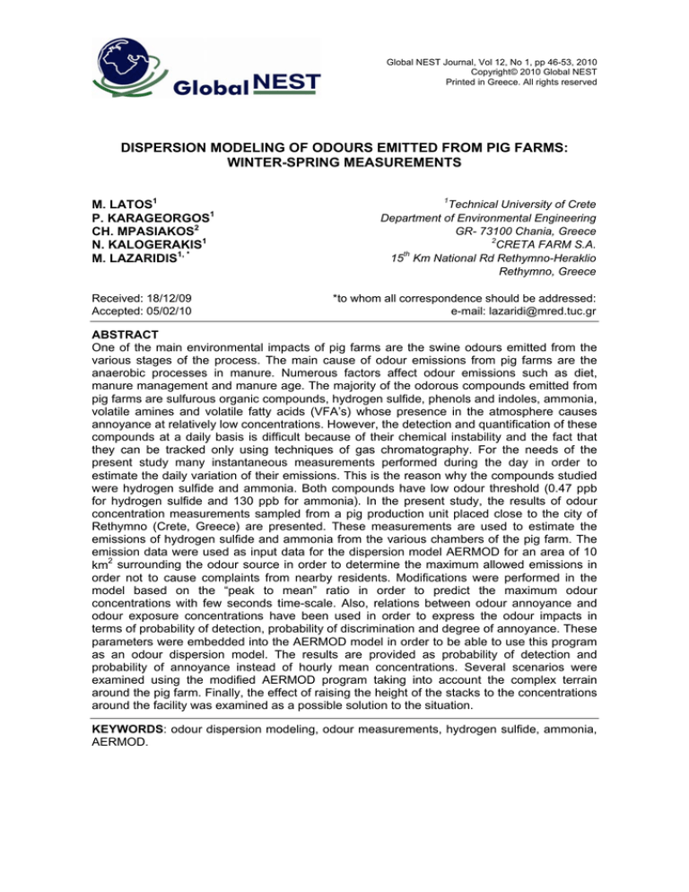 Global NEST Journal, Vol 12, No 1, pp 46-53, 2010 Copyright© 2010 Global NEST Printed in Greece. All rights reserved DISPERSION MODELING OF ODOURS EMITTED FROM PIG FARMS: WINTER-SPRING MEASUREMENTS M. LATOS1 P. KARAGEORGOS1 CH. MPASIAKOS2 N. KALOGERAKIS1 M. LAZARIDIS1, * Received: 18/12/09 Accepted: 05/02/10 1 Technical University of Crete Department of Environmental Engineering GR- 73100 Chania, Greece 2 CRETA FARM S.A. th 15 Km National Rd Rethymno-Heraklio Rethymno, Greece *to whom all correspondence should be addressed: e-mail: [email protected] ABSTRACT One of the main environmental impacts of pig farms are the swine odours emitted from the various stages of the process. The main cause of odour emissions from pig farms are the anaerobic processes in manure. Numerous factors affect odour emissions such as diet, manure management and manure age. The majority of the odorous compounds emitted from pig farms are sulfurous organic compounds, hydrogen sulfide, phenols and indoles, ammonia, volatile amines and volatile fatty acids (VFA’s) whose presence in the atmosphere causes annoyance at relatively low concentrations. However, the detection and quantification of these compounds at a daily basis is difficult because of their chemical instability and the fact that they can be tracked only using techniques of gas chromatography. For the needs of the present study many instantaneous measurements performed during the day in order to estimate the daily variation of their emissions. This is the reason why the compounds studied were hydrogen sulfide and ammonia. Both compounds have low odour threshold (0.47 ppb for hydrogen sulfide and 130 ppb for ammonia). In the present study, the results of odour concentration measurements sampled from a pig production unit placed close to the city of Rethymno (Crete, Greece) are presented. These measurements are used to estimate the emissions of hydrogen sulfide and ammonia from the various chambers of the pig farm. The emission data were used as input data for the dispersion model AERMOD for an area of 10 km2 surrounding the odour source in order to determine the maximum allowed emissions in order not to cause complaints from nearby residents. Modifications were performed in the model based on the “peak to mean” ratio in order to predict the maximum odour concentrations with few seconds time-scale. Also, relations between odour annoyance and odour exposure concentrations have been used in order to express the odour impacts in terms of probability of detection, probability of discrimination and degree of annoyance. These parameters were embedded into the AERMOD model in order to be able to use this program as an odour dispersion model. The results are provided as probability of detection and probability of annoyance instead of hourly mean concentrations. Several scenarios were examined using the modified AERMOD program taking into account the complex terrain around the pig farm. Finally, the effect of raising the height of the stacks to the concentrations around the facility was examined as a possible solution to the situation. KEYWORDS: odour dispersion modeling, odour measurements, hydrogen sulfide, ammonia, AERMOD. DISPERSION MODELING OF ODOURS EMITTED FROM PIG FARMS 47 1. INTRODUCTION Odours emitted from piggeries are becoming a significant source of environmental annoyance. Odour-related complaints from communities surrounding these facilities have been constantly increasing during the last decade. The odour generated from piggeries is a result of the decomposition of manure and waste food. Odour from freshly excreted manure is generally less offensive than odour released from anaerobically decomposing manure. The odour composition depends on several factors such as the type of operations and the stage of animal growth. The main odorous compounds emitted are sulphur or nitrogen containing compounds (hydrogen sulphide, methyl mercaptan, dimethyl disulfide, carbon sulfide, ammonia, amines, indole and skatole). The resulting odour is a mixture of these compounds, however the most significant odorous compounds are hydrogen sulfide and ammonia The main impact from the existence of H2S and NH3 in the atmosphere is the annoyance caused to humans. The detection and perception of odours by humans is an extremely complex process. The main factors determining whether an odour causes annoyance are the concentration of the odorous compound in the air, the “odour quality”, the odour appearance frequency and the odour duration (US EPA, 2006). Atmospheric dispersion modeling has been applied for the assessment of odour impacts in several cases using mainly Gaussian models such as the Industrial Source Complex (ISC) model. Dispersion modeling can effectively be used in two different ways: firstly to assess the dispersion of odours and to correlate with complaints and secondly, in a reverse mode, to estimate the maximum odour emissions which can be permitted from a site in order to prevent odour complaints occurring (McIntyre, 2000). In this case, the model outputs are hourly concentrations which is a non representative time-scale, because only a few seconds are enough to cause human annoyance. For this reason, a “peak to mean” ratio is used to predict the maximum odour concentrations (Piringer et al., 2007; Smith, 1973). Also, recent studies provide relations between odour annoyance and odour exposure concentrations in order to express the odour impacts in terms of probability of detection and degree of annoyance (Henshaw et al., 2006; Nicell, 2003). The methodology presented in the current study indicates the need to use these dose-response relationships in conjunction with dispersion modeling. The utter goal is to estimate the probability of response and degree of annoyance of the communities surrounding piggeries instead of the hourly mean concentrations. In the current study the focus is on the specification of the main parameters that we have to take