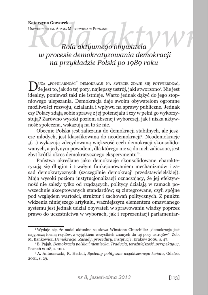 Rola aktywn Katarzyna Goworek Uniwersytet im. Adama Mickiewicza w Poznaniu Rola aktywnego obywatela w procesie demokratyzowania demokracji na przykładzie Polski po 1989 roku D „popularność” demokracji na świecie zdaje się potwierdzać, że jest to, jak do tej pory, najlepszy ustrój, jaki stworzono1. Nie jest idealny, ponieważ taki nie istnieje. Warto jednak dążyć do jego stopniowego ulepszania. Demokracja daje swoim obywatelom ogromne możliwości rozwoju, działania i wpływu na sprawy publiczne. Jednak czy Polacy zdają sobie sprawę z jej potencjału i czy w pełni go wykorzystują? Zarówno wysoki poziom absencji wyborczej, jak i niska aktywność społeczna, wskazują na to że nie. Obecnie Polska jest zaliczana do demokracji stabilnych, ale jeszcze młodych, jest klasyfikowana do neodemokracji2. Neodemokracje „(...) wykazują zdecydowaną większość cech demokracji skonsolidowanych, a jedynym powodem, dla którego nie są do nich zaliczone, jest zbyt krótki okres demokratycznego eksperymentu”3. Państwa określane jako demokracje skonsolidowane charakteryzują się długim i trwałym funkcjonowaniem mechanizmów i zasad demokratycznych (szczególnie demokracji przedstawicielskiej). Mają wysoki poziom instytucjonalizacji oznaczający, że jej efektywność nie zależy tylko od rządzących, politycy działają w ramach powszechnie akceptowanych standardów; są zintegrowane, czyli spójne pod względem wartości, struktur i zachowań politycznych. Z punktu widzenia niniejszego artykułu, ważniejszym elementem omawianego systemu jest jednak udział obywateli w sprawowaniu władzy poprzez prawo do uczestnictwa w wyborach, jak i reprezentacji parlamentaruża 1 Wydaje się, że nadal aktualne są słowa Winstona Churchilla: „demokracja jest najgorszą formą rządów, z wyjątkiem wszystkich znanych do tej pory ustrojów”. Zob. M. Bankowicz, Demokracja. Zasady, procedury, instytucje, Kraków 2006, s. 47. 2 B. Pająk, Demokracja polska i niemiecka. Tradycja, teraźniejszość, perspektywy, Poznań 2008, s. 100. 3 A. Antoszewski, R. Herbut, Systemy polityczne współczesnego świata, Gdańsk 2001, s. 29. nr 8, jesień-zima 2013 [113] Katarzyna Goworek nej, oraz to, że rządzący odpowiadają przed elektoratem, a przed ich nadużyciami chronią obowiązujące prawa. Panuje wolność słowa. Powstają także nowe inicjatywy polityczne, a społeczeństwo obywatelskie może się swobodnie rozwijać. Obywatel ma dostęp do alternatywnych źródeł informacji. Pojęcie demokracji liberalnej jest rozwinięciem wcześniejszej koncepcji poliarchii Roberta Dahla. Dla R. Dahla demokracja liberalna oparta jest na czterech aspektach: rywalizacji, partycypacji, wolności i pluralizmie4. Obywatel aktywny jest szczególnie pożądany dla stabilnej, lecz młodej polskiej demokracji, ale nie tylko dla niej. Warto więc zastanowić się, dlaczego jest on tak ważny dla dalszego rozwoju każdego demokratycznego państwa i społeczeństwa oraz jakie są przyczyny tego, że Polacy wykazują niewielką chęć wpływu na sprawy publiczne. „Demokratyzować demokratyczne?” Państwo o reżimie demokratycznym5 opiera się na określonych zasadach takich, jak: zasada państwa prawa, suwerenności narodu, reprezentacji, trójpodziału władzy czy pluralizmu (choć nie zawsze wszystkie te zasady muszą występować). Dobre jej funkcjonowanie powinny też zapewnić sprawnie działające organy i instytucje. Mimo iż ustrój ten opiera się wszędzie na podobnych zasadach to jednak w każdym kraju procedury oraz stosunek obywateli do ustroju jest inny. O ile termin demokracja jest dość jednoznaczny, to wyrażenie „demokratyzowanie demokracji” może wydawać się nieco enigmatyczne i problematyczne. Demokratyzacja oznacza przecież proces transformacji ustrojowej zmieniający dotychczasową formę rządów na demokratyczną. Jednak inne, szersze znaczenie to dążenie do idealnej demokracji. Jest to o tyle skomplikowane, o ile nie istnieje jedna koncepcja doskonałej formy tego ustroju. Pewne jest natomiast, że proces demokratyzacji jest ciągły i trwa zarówno w „starych” jak i „młodych” Ibidem, s. 23–28. W literaturze przedmiotu często spotykamy się z terminem „reżim polityczny”. Reżimy dzielimy na autorytarne, totalitarne i demokratyczne. Obecnie termin ten jest nacechowany bardzo pejoratywnie i kojarzy się z niedemokratycznym systemem rządów, z totalitaryzmem. Jednak definicja reżimu politycznego brzmi: „Reżim polityczny to ogół metod jakimi posługuje się aparat państwowy w stosunkach z ludnością, a także zasady, jakimi kieruje się on w tych stosunkach. Innymi słowy, to styl rządzenia określający faktyczne stosunki pomiędzy strukturami organizacyjnymi państwa, a ludnością, to sposób sprawowania władzy i egzekwowania posłuszeństwa”. Zob. J. Sobczak, Podstawowy wiedzy o państwie i prawie, Poznań 2002, s. 64. Jakkolwiek nienaturalnie mogłoby brzmieć sformułowanie „reżim demokratyczny”, to jest ono używane poprawnie. 4 5 [114] refleksje Rola aktywnego obywatela... demokracjach6, ponieważ żadna z nich nie osiągnęła poziomu idealnego i prawdopodobnie nigdy tego nie uczyni7. Przy okazji refleksji na ten temat warto wspomnieć o znaczeniu ideałów demokratycznych w dzisiejszym świecie. Wciąż są ważnym elementem dalszego rozwoju omawianego reżimu, który nie może istnieć tylko jako zbiór reguł i gotowych rozwiązań. Nie powinniśmy traktować go jako instytucję, odzierać z historycznego i kulturalnego bagażu oraz z emocjonalnego wydźwięku, który ze sobą niesie. Oczywiście, w dzisiejszym świecie traktowanie ideałów demokracji w sposób instrumentalny zdarza się nazbyt często. Nadaje się im aktualnie potrzebne znaczenie i wykorzystuje w walce politycznej, jednak nie należy dopuszczać by wartości demokratyczne zostały zdeprecjonowane. Są one oczywiście pewnym uogólnieniem dążeń w systemie de