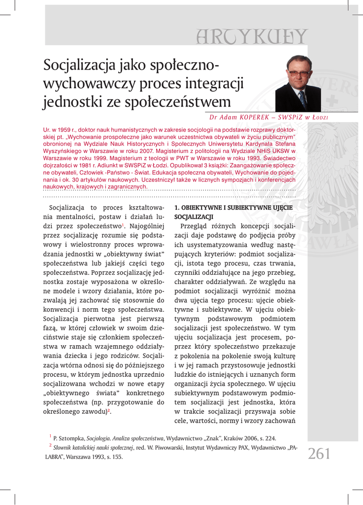 ARTYKUŁY Socjalizacja jako społecznowychowawczy proces integracji jednostki ze społeczeństwem Dr Adam KOPER EK – S WSP i Z w Ł o d z i Ur. w 1959 r., doktor nauk humanistycznych w zakresie socjologii na podstawie rozprawy doktorskiej pt. „Wychowanie prospołeczne jako warunek uczestnictwa obywateli w życiu publicznym” obronionej na Wydziale Nauk Historycznych i Społecznych Uniwersytetu Kardynała Stefana Wyszyńskiego w Warszawie w roku 2007. Magisterium z politologii na Wydziale NHiS UKSW w Warszawie w roku 1999. Magisterium z teologii w PWT w Warszawie w roku 1993. Świadectwo dojrzałości w 1981 r. Adiunkt w SWSPiZ w Łodzi. Opublikował 3 książki: Zaangażowanie społeczne obywateli, Człowiek -Państwo - Świat. Edukacja społeczna obywateli, Wychowanie do pojednania i ok. 30 artykułów naukowych. Uczestniczył także w licznych sympozjach i konferencjach naukowych, krajowych i zagranicznych. Socjalizacja to proces kształtowa nia mentalności, postaw i działań lu dzi przez społeczeństwo1. Najogólniej przez socjalizację rozumie się podsta wowy i wielostronny proces wprowa dzania jednostki w „obiektywny świat” społeczeństwa lub jakiejś części tego społeczeństwa. Poprzez socjalizację jed nostka zostaje wyposażona w określo ne modele i wzory działania, które po zwalają jej zachować się stosownie do konwencji i norm tego społeczeństwa. Socjalizacja pierwotna jest pierwszą fazą, w której człowiek w swoim dzie ciństwie staje się członkiem społeczeń stwa w ramach wzajemnego oddziały wania dziecka i jego rodziców. Socjali zacja wtórna odnosi się do późniejszego procesu, w którym jednostka uprzednio socjalizowana wchodzi w nowe etapy „obiektywnego świata” konkretnego społeczeństwa (np. przygotowanie do określonego zawodu)2. 1. Obiektywne i subiektywne ujęcie socjalizacji Przegląd różnych koncepcji socjali zacji daje podstawę do podjęcia próby ich usystematyzowania według nastę pujących kryteriów: podmiot socjaliza cji, istota tego procesu, czas trwania, czynniki oddziałujące na jego przebieg, charakter oddziaływań. Ze względu na podmiot socjalizacji wyróżnić można dwa ujęcia tego procesu: ujęcie obiek tywne i subiektywne. W ujęciu obiek tywnym podstawowym podmiotem socjalizacji jest społeczeństwo. W tym ujęciu socjalizacja jest procesem, po przez który społeczeństwo przekazuje z pokolenia na pokolenie swoją kulturę i w jej ramach przystosowuje jednostki ludzkie do istniejących i uznanych form organizacji życia społecznego. W ujęciu subiektywnym podstawowym podmio tem socjalizacji jest jednostka, która w trakcie socjalizacji przyswaja sobie cele, wartości, normy i wzory zachowań 1 P. Sztompka, Socjologia. Analiza społeczeństwa, Wydawnictwo „Znak”, Kraków 2006, s. 224. 2 Słownik katolickiej nauki społecznej, red. W. Piwowarski, Instytut Wydawniczy PAX, Wydawnictwo „PA- LABRA”, Warszawa 1993, s. 155. 261 ARTICLES danego społeczeństwa i w ten sposób przystosowuje się do jego wymagań3. Badanie obiektywnego aspektu so cjalizacji polega na analizie czynników oddziałujących na jednostkę, zaś ba danie subiektywnego aspektu socjali zacji polega na analizie tego procesu od strony socjalizowanego (na przy kład cechy nabytej przez jednostkę w trakcie socjalizacji, warunkujące jej zachowanie się). Istota procesu socja lizacji ujmowana jest przez uczonych w zróżnicowany sposób, w zależności od tego, jaką płaszczyznę socjalizacji mają na względzie. Jedni uwzględniają płaszczyznę kultury i wtedy socjaliza cja jawi się jako internalizacja warto ści, norm i symboli. Inni uwzględniają płaszczyznę społeczeństwa i wtedy so cjalizacja jest rozumiana głównie jako wdrażanie wzorów ról społecznych. Jeszcze inni wychodzą z płaszczyzny osobowości i wtedy socjalizacja jest ujmowana jako kształtowanie osobo wości społecznej człowieka. Socjaliza cja jest procesem powodującym wy stępowanie społecznie pozytywnych zmian w zachowaniu jednostki. W lite raturze socjologicznej spotyka się rów nież szerokie rozumienie socjalizacji, to znaczy takie, gdy ma się na myśli wszelkie oddziaływanie grupy na jed nostkę, zarówno oddziaływanie grup konstruktywnych, reprezentujących określoną kulturę i pozytywne warto ści społeczne, jak też grup destruktyw nych, opierających się na wartościach sprzecznych z wartościami reprezento wanymi przez kulturę. Oddziaływanie destruktywne grupy na jednostkę jest wówczas powodem zaburzeń procesu 3 262 socjalizacji. Czas trwania procesu so cjalizacji jest również niejednolicie ro zumiany przez różnych autorów. Jedni ograniczają ten czas do wczesnych faz rozwoju jednostki, to jest do dzieciń stwa i wczesnej młodości. W tym wła śnie okresie wykształcają się w dziecku podstawowe i stałe cechy osobowości, oddziałujące w sposób dominujący na zachowanie się tegoż dziecka w jego dorosłym życiu. Inni widzą w socjali zacji proces trwający całe życie. W warunkach pluralizmu społeczne go i kulturowego oraz szybkich prze mian cywilizacyjnych, rodzina i szkoła nie są w stanie przygotować młodego człowieka do pełnienia wszystkich ról społecznych, jakie mogą się pojawić w jego życiu dorosłym. Wydaje się, iż rację należy przyznać drugiej grupie autorów, z tym jednak, że w procesie socjalizacji, która trwa „od kołyski aż do grobu” zaznaczają się dwa zróżni cowane etapy: etap dzieciństwa i mło dości (socjalizacja pierwotna) i okres życia dorosłego (socjalizacja wtórna). Osobowość jednostki jest kształtowa na głównie w okresie niemowlęctwa, dzieciństwa i młodości przez uczest nictwo w grupie rodzinnej, grupach ró wieśniczych czy społeczności lokalnej, a więc w grupach pierwotnych opar tych na stosunkach „twarzą w twarz (face-to-face relations). Ale kształtowa nie osobowości na tym etapie się nie kończy; w wieku dorosłym dokonuje się socjaliz