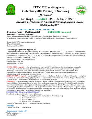 PTTK OZ w Głogowie Klub Turystki Pieszej i Górskiej „Mrówka” Plan Rajdu – GORCE 04 - 07.06.2015 r. ODJAZD AUTOBUSU Z OS. PIASTÓW ŚLĄSKICH II –środa 03.06 godz. 2355 PROPOZYCJE TRAS PIESZYCH Dzień pierwszy – 04.06(czwartek) GORC (1228 m n.p.m.) 10 Trasa krótka – godzina wyjścia 8 Rzeki leśniczówka (niebieski) – Nowa Polana – Polana Gorc Kamienicki – Gorc – szlak konny( pomarańczowe znaki) – przełęcz Wierch Młynny – Kamienica – Dworek Gorce Czas przejścia 430 h + czas na odpoczynki Długość trasy: 14 km Suma podejść: ok. 600 m Trasa długa – godzina wyjścia 800 Lubomierz (czarny) – Kudłoń (1276 m n.p.m.) (zielony) Gorc Troszacki (1235 m n.p.m.) – skrzyżowanie pod Stawieńcem (niebieski) – Papieżówka – Trusiówka - Rzeki leśniczówka (niebieski) – Nowa Polana – Polana Gorc Kamienicki – Gorc (1228 m n.p.m.) – szlak konny(pomarańczowe znaki) – przełęcz Wierch Młynny – Kamienica – Dworek Gorce Czas przejścia 800 h + czas na odpoczynki Długość trasy: 26,0 km Suma podejść: 1300 m GORC (1228 m n.p.m.) – pokryty lasami szczyt we wschodniej części pasma Gorców, na pograniczu parku narodowego, pomiędzy Szczawą , Kamienicą a Ochotnicą. Szczyt zbudowany z piaskowców i zlepieńców stanowiący zwrotnik dla kilku grani. Na stokach polany (m.in. Gorc Kamienicki, Gorc Młynieński, Hale Gorcowskie), z których roztaczają się piękne panoramy Gorców, Beskidu Wyspowego i Sądeckiego.W południowym stoku góry jaskinia Wietrzna Dziura. KUDŁOŃ (1276 m n.p.m.) – szczyt na północny wschód od Turbacza. Pod wierzchołkiem kilka polan z rozległymi widokami na Gorce, Tatry, Magurę Spiską, Beskid Sądecki i Niski. Na stokach malownicze skały piaskowcowe m. in. Białe Skały, Kudłoński Baca oraz jaskinie m. in. Szczelina w Kudłoniu. Papieżówka – polana na której znajduje się szałas – schron Papieski. W sierpniu 1976 roku ówczesny metropolita krakowski Karol Wojtyła przebywał tu przez dwa tygodnie odbywając dni skupienia. Przyjeżdżał tu wielokrotnie jako wikariusz. Miejsce – ciche spokojne i dalekie od zgiełku sprzyjało modlitwie. Warunki w których przybywał Karol Wojtyła były bardzo spartańskie – całe wyposażenie schronu stanowiły stół z desek, prycza do spania i zydel do siedzenia. Kamienny bruk przed wejściem ułożył własnoręcznie. Od 1978 roku od kiedy został papieżem miejsce to nazwano „Papieżówką”. W 2004 roku szałas został odnowiony. PROPOZYCJA DLA SPACEROWICZÓW Zwiedzanie miejscowości uzdrowiskowej Szczawa: • Muzeum 1 Pułku Strzelców Podhalańskich Armii Krajowej • Kościół Partyzancki • Pomnik 1 PSP AK • Pijalnia Wód Mineralnych Powrót do Kamienicy pieszo 7 km (w tym dniu nie jeżdżą busy) Nocleg: Dworek „GORCE” Kamienica 46 Obiadokolacja – godz. 1800 Telefon kontaktowy: Jadwiga Ulbin Dzień drugi - 05.06(piątek) TURBACZ (1310 m n.p.m.) Śniadanie - godz. 700 Odjazd autobusu - godz. 740 Trasa krótka – godzina wyjścia 830 Koninki (zielony) – Tobołczyk – Tobołów – Suchora – Obidowiec ( czerwony) – Rozdziele – Turbacz – Schronisko PTTK Turbacz (niebieski) – Czoło Turbacza – Koninki - Ostoja Górska Czas przejścia 515 h + czas na odpoczynki. Długość trasy:16,5 km Suma podejść: 800 m Trasę można skrócić wjeżdżając kolejką na Tobołczyk Trasa długa – godzina wyjścia 830 Koninki (zielony) – Tobołczyk – Tobołów – Suchora – Obidowiec ( czerwony) – Rozdziele – Turbacz – Gabrowska Duża - Kiczora (1282 m n.p.m.) powrót - Schronisko PTTK Turbacz (niebieski) – Czoło Turbacza – Koninki - Ostoja Górska Czas przejścia 700 h + czas na odpoczynki. Długość trasy: 23 km Suma podejść: 971 m Cennik biletów wstępu do Gorczańskiego Parku Narodowego: normalny 4.00 zł ulgowy 2.00 zł Kolej Linowa Tobołów (czynna od 900) Bilet normalny w jedną stronę 12,00 zł Bilet ulgowy w jedną stronę 10,00 zł Bilety do nabycia w recepcji Ośrodka Ostoja Górska, w Ośrodku znajduje się też kawiarnia. TURBACZ (1310 m n.p.m.) – najwyższy szczyt Gorców to potężny masyw, w którym zbiega się kilka grzbietów porozdzielanych głębokimi dolinami nadając mu rzadki w polskich górach kształt rozrogu. Budują go warstwy piaskowców i zlepieńców płaszczowiny magurskiej. Stoki porastają lasy świerkowe z pięknymi polanami. Na północnych stokach w dolinach zachowały się fragmenty pierwotnej puszczy karpackiej.Sam wierzchołek otacza niewielka polana z kamiennym obeliskiem i metalowym krzyżem. Na polanie znajduje się okazały, kamienny budynek schroniska i Ośrodek Kultury Turystyki Górskiej PTTK. Obok lapidarium- symboliczny grób Edwarda Moskały oraz ołtarz, przy którym odprawiane są nabożeństwa. Propozycja dla spacerowiczów: • Muzeum Władysława Orkana ORKANÓWKA Odjazd autobusu z parkingu spod Ośrodka Ostoja Górska - godz. 1700 Obiadokolacja – godz. 1830 Telefon kontaktowy: Jadwiga Ulbin Dzień trzeci - 06.06 (sobota) LUBAŃ (1211 m n.p.m.) Śniadanie - godz. 700 Odjazd autobusu – godz. 740 Trasa krótka – godzina wyjścia 815 Grywałd (drogą do zielonego) – Gronik – ruiny schroniska – Lubań (niebieski) – Polana Wyrobki – przeł. Drzyślawa – Wdżar (767 m n.p.m.) – Kluszkowce – przełęcz Snozka Czas przejścia 420 h + czas na odpoczynki. Długość trasy: 12,5 km Suma podejść: 700m Trasa długa – godzina wyjścia 805 Krościenko nad Dunajcem (czerwony) – Marszałek – Lubań (niebieski) – Polana Wyrobki – przeł. Drzyślawa – Wdżar (767 m n.p.m.) – Kluszkowce – przełęcz Snozka Czas przejścia 545 h + czas na odpoczynki. Długość trasy: 16 km Suma podejść: 850 m LUBAŃ (1225 m n.p.m.) – potężny, dwuwierzchołkowy szczyt (zachodni 1211m, wschodni 1225 m), najwyższy we wschodniej części Gorców. Pomiędzy wierzchołkami polana Wierch Lubania, poniżej której, na południowym stoku, wychodnia piaskowc