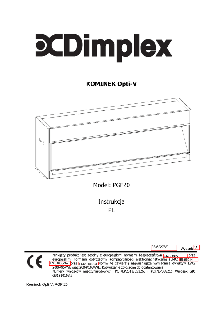 KOMINEK Opti-V Model: PGF20 Instrukcja PL 08/52278/0 08/52045/1 Wydanie 2 1 Niniejszy produkt jest zgodny z europejskimi normami bezpieczeństwa EN 60335-2-30 oraz EN60065 europejskimi normami dotyczącymi kompatybilności elektromagnetycznej (EMC) EN55014 EN55014, EN 61000-3-2 oraz EN60555-3. EN60555-2 EN61000-3-3 Normy te zawierają najważniejsze wymagania dyrektyw EWG 2006/95/WE oraz 2004/108/WE. Rozwiązanie zgłoszone do opatentowania. Numery wniosków międzynarodowych: PCT/EP2013/051263 i PCT/EP058211 Wniosek GB: GB1210108.5 Kominek Opti-V: PGF 20 WAŻNE: NINIEJSZĄ INSTRUKCJĘ NALEŻY UWAŻNIE PRZECZYTAĆ I ZACHOWAĆ DO WGLĄDU W PRZYSZŁOŚCI. Dziękujemy za zakup kominka elektrycznego Opti-V firmy Wymiary mocowania Dimplex. Prosimy o zapoznanie się z ulotką, w której zawarto Kominek Opti-V dostarczany jest w stanie fabrycznie informacje umożliwiające bezpieczne zainstalowanie produktu, zmontowanym. jego eksploatację i konserwację. Niniejsze urządzenie zostało Niniejszy model jest zaprojektowany do mocowania na stałe. Prosimy obejrzeć rys. 2a i 2b odnośnie zalecanych wymiarów zaprojektowane w celu instalacji w szafce lub wnęce ściennej. mocowania. Ważne informacje dotyczące bezpieczeństwa W trakcie korzystania urządzeń elektrycznych należy zawsze Wysokość kominka przedsięwziąć podstawowe środki ostrożności, aby ograniczyć W trakcie instalacji kominka istnieje możliwość regulacji jego ryzyko pożaru, porażenia prądem elektrycznym oraz obrażeń, wysokości. Zalecane wysokości (od posadzki do otworu dolnego uwzględniając następujące kwestie: kominka – * Fig 2a): Jeżeli urządzenie jest uszkodzone, należy skontaktować się z - co najmniej 65 cm, gdy na kominek patrzymy z pozycji siedzącej dostawcą przed montażem i uruchomieniem urządzenia. (np. siedząc na kanapie). Nie używać urządzenia w bezpośrednim sąsiedztwie wanny, - maksymalnie 110 cm, gdy na kominek patrzymy z pozycji natrysku ani basenu. stojącej (np. w pomieszczeniu recepcji). Stała instalacja musi być wyposażona w urządzenie odłączające zasilanie zgodnie z przepisami dotyczącymi okablowania. Połączenie elektryczne Nie używać na wolnym powietrzu. Zarys obudowy oraz miejsce gniazdka elektrycznego zostały W przypadku awarii kominek należy wyłączyć. Urządzenie należy wyłączyć, gdy nie jest używane przez dłuższy pokazane na rys. 4 jako linie kropkowane. Prosimy skontaktować się z wykwalifikowanym elektrykiem w zakresie wymagań czas. Jeżeli kabel zasilający jest uszkodzony, producent lub serwisant dotyczących odpowiedniego połączenia przewodów elektrycznych. zobowiązani są do jego wymiany na specjalny kabel lub zespół. Ostrzeżenie – Na urządzeniu nie należy umieszczać źródeł Obsługa: Należy najpierw włączyć przełącznik zasilania ‘I’ (‘O/I’, zob. rys. otwartego ognia, takich jak świece. Ostrzeżenie – Urządzenia nie wolno zalewać płynem, jak również 3), aby móc obsługiwać urządzenie. nie należy na nim stawiać przedmiotów wypełnionych płynami, Ekran kominka ‘Opti-V’ wyświetli się na około 3 sekundy, a takich jak wazony. następnie uruchomi się obraz płomienia. Ostrzeżenie – niniejsze urządzenie posiada konstrukcję klasy I i Uwaga: Co 30 minut użytkownik może zauważyć, że ekran gaśnie. należy je podłączać do gniazdka sieciowego z uziemieniem Jest to sytuacja normalna, która nie powinna stanowić powodu do ochronnym. niepokoju. Połączenie elektryczne OSTRZEŻENIE – URZĄDZENIE MUSI BYĆ UZIEMIONE Urządzenia nie należy włączać do czasu, gdy zostanie właściwie zainstalowane. Przed włączeniem kominka należy przeczytać ostrzeżenia i zapoznać się z instrukcją obsługi. Uwagi ogólne Należy ostrożnie rozpakować kominek, jak również zachować opakowanie w celu ewentualnego wykorzystania w przyszłości – w razie potrzeby przeniesienia kominka lub zwrócenia go do dostawcy. Zawartość kartonu • Kominek Opti-V, model PGF10 • Pilot zdalnego sterowania i baterie (typ AAA) Charakterystyka produktu Możliwość sterowania wielkością płomienia Obsługa zdalna lub ręczna Czerwona lampka wskazująca tryb czuwania Instalacja Ostrzeżenie Nie należy podłączać urządzenia do czasu jego właściwego przymocowania do solidnej podstawy oraz dokładnego zapoznania się z instrukcją obsługi. W trakcie instalacji kominka należy podjąć wszelkie środki ostrożności zapobiegające uszkodzeniu kabli, które mogą być zakryte w ścianie. Lokalizacja kominka Kominek Opti-V wykorzystuje technikę odbicia iluzorycznego i został zaprojektowany w taki sposób, aby pracować najefektywniej, gdy poziom naturalnego światła otoczenia jest niski. Jeżeli kominek Opti-V jest zainstalowany w miejscach jasno oświetlonych, silne odbicia mogą osłabiać obraz płomienia. . Ręczna obsługa sterowania: Ręczne przyciski sterowania dla ekranu umieszczone są od wewnątrz w lewym górnym rogu urządzenia, powyżej szyby (zob. rys. 3). Przełącznika zasilania urządzenia (‘O/I’, zob. rys. 3) można używać do wyłączania urządzenia (‘O’) gdy nie jest ono używane, na przykład na noc lub na dłuższy okres czasu, aby zapobiec marnotrawieniu energii elektrycznej. Przycisk czuwania. ( znajduje się zaraz poniżej przełącznika zasilania. ) Obsługa pilota zdalnego sterowania: Pilot zdalnego sterowania może być używany zaraz po włączeniu urządzenia ‘I’ (‘I’ zob. rys. 3). Pilot zdalnego sterowania należy skierować na kominek (czujnik został pokazany na rys. 4). Wielkość płomienia można regulować w górę (zwiększenie) i w dół (zmniejszenie), przyciskając przyciski sterowania wielkością płomienia (+ oraz -). Funkcje przycisków zostały określone zgodnie z poniższym opisem; Tryb czuwania - Zmniejszenie wielkości płomienia + Zwiększenie wielkości płomienia Czerwona lampka wskazuje, kiedy urządzenie znajduje się w trybie czuwan