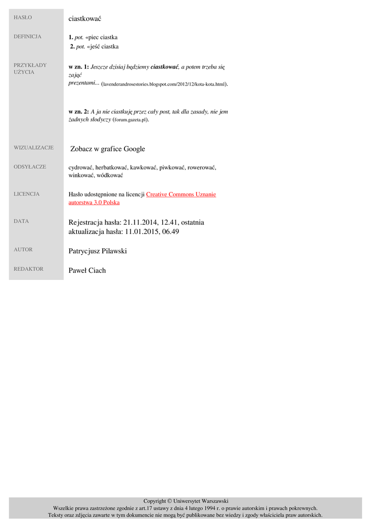 HASŁO ciastkować DEFINICJA 1. pot. «piec ciastka» 2. pot. «jeść ciastka» PRZYKŁADY UŻYCIA w zn. 1: Jeszcze dzisiaj będziemy ciastkować, a potem trzeba się zająć prezentami... (lavenderandrosestories.blogspot.com/2012/12/kota-kota.html). w zn. 2: A ja nie ciastkuję przez cały post, tak dla zasady, nie jem żadnych słodyczy (forum.gazeta.pl). WIZUALIZACJE Zobacz w grafice Google ODSYŁACZE cydrować, herbatkować, kawkować, piwkować, rowerować, winkować, wódkować LICENCJA Hasło udostępnione na licencji Creative Commons Uznanie autorstwa 3.0 Polska DATA Rejestracja hasła: 21.11.2014, 12.41, ostatnia aktualizacja hasła: 11.01.2015, 06.49 AUTOR Patrycjusz Pilawski REDAKTOR Paweł Ciach Copyright © Uniwersytet Warszawski Wszelkie prawa zastrzeżone zgodnie z art.17 ustawy z dnia 4 lutego 1994 r. o prawie autorskim i prawach pokrewnych. Teksty oraz zdjęcia zawarte w tym dokumencie nie mogą być publikowane bez wiedzy i zgody właściciela praw autorskich. Powered by TCPDF (www.tcpdf.org)