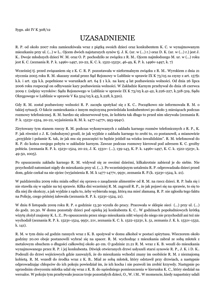 Sygn. akt IV K 308/12 UZASADNIENIE R. P. od około 2007 roku zamieszkiwała wraz z piątką swoich dzieci oraz konkubentem K. C. w wynajmowanym mieszkaniu przy ul. (...) w L.. Ojcem dwóch najstarszych synów tj. J. K. (ur. w (...) r.) oraz D. K. (ur. w (...) r.) jest J. K.. Dwoje młodszych dzieci W. M. oraz O. P. pochodziło ze związku z R. M.. Ojcem najmłodszego M. ur. w (...) roku jest K. C. (zeznania R. P. k. 1496v-1497, 20-22, K. C. k. 1522-1523v, 46-49, K. P. k. 1496v-1497, k. 7) Wcześniej tj. przed związaniem się z K. C. R. P. pozostawała w nieformalnym związku z R. M.. Wyrokiem z dnia 21 stycznia 2005 roku R. M. skazany został przez Sąd Rejonowy w Lublinie w sprawie IX K 73/05 za czyny z art. 157§1 k.k. i art. 159 k.k. popełnione w warunkach art. 64 § 1 k.k. na karę 4 lat pozbawienia wolności. Od dnia 26 lipca 2006 roku rozpoczął on odbywanie kary pozbawienia wolności. W Zakładzie Karnym przebywał do dnia 18 czerwca 2009 r. (odpisy wyroków: Sądu Rejonowego w Lublinie w sprawie IX K 73/05 k.41-42, k.226-227, k.318-319, Sądu Okręgowego w Lublinie w sprawie V Ka 524/05 k.43, k.228, k.320). Gdy R. M. został pozbawiony wolności R. P. zaczęła spotykać się z K. C.. Początkowo nie informowała R. M. o takiej sytuacji. O fakcie zamieszkania z innym mężczyzną powiedziała konkubentowi po około 3 miesiącach podczas rozmowy telefonicznej. R. M. bardzo się zdenerwował tym, że kobieta tak długo to przed nim ukrywała (zeznania R. P. k. 1523v-1524, 20-22, wyjaśnienia R. M. k. 1477-1477v, 993-994v). Zirytowany tym stanem rzeczy R. M. podczas wykonywanych z zakładu karnego rozmów telefonicznych z R. P., K. P. jak również z J. K. (młodszym) groził, że jak wyjdzie z zakładu karnego to zrobi to, co postanowił, a mianowicie „przyjdzie i połamie K. tak, że jak mu się poszczęści to będzie jeździł na wózku inwalidzkim”. R. M. telefonował do R. P. do końca swojego pobytu w zakładzie karnym. Zawsze podczas rozmowy kierował pod adresem K. C. groźby pobicia. (zeznania R. P. k. 1523v-1524, 20-22, J. K. 1531v- (...), 139-143, K. P. k. 1496v-1497, K. C. k. 1522-1523v, k. 49-50, 1005). Po opuszczeniu zakładu karnego R. M. widywał się ze swoimi dziećmi, kilkakrotnie zabierał je do siebie. Nie przychodził natomiast nigdy do mieszkania przy ul. (...). Po wcześniejszym ustaleniu R. P. odprowadzała dzieci przed dom, gdzie czekał na nie ojciec (wyjaśnienia R. M. k 1477-1477v, 993v, zeznania R. P.(k. 1523v-1524, k. 21). W październiku 2009 roku miała odbyć się sprawa o zasądzenie alimentów od R. M. na rzecz dzieci. R. P. bała się i nie stawiła się w sądzie na tej sprawie. Kilka dni wcześniej R. M. zagroził R. P., że jak pojawi się na sprawie, to się to dla niej źle skończy, a jak wyjdzie z sądu to, żeby wybierała nogę, którą ma mieć złamaną. R. P. nie zgłosiła tego faktu na Policję, czego później żałowała (zeznania R. P. k. 1523v-1524, 21). W dniu 8 listopada 2009 roku R. P. o godzinie 13.30 wyszła do pracy. Pracowała w sklepie sieci (...) przy ul. (...) do godz. 20.30. W domu pozostały dzieci pod opieką jej konkubenta K. C.. W godzinach popołudniowych krótką wizytę złożył znajomy K. Ł. Z.. Po opuszczeniu przez niego mieszkania nikt więcej do niego nie przychodził ani też nie wychodził (zeznania R. P. k. 1523v-1524, 995v, 21v, zeznania K. C. k. 1522-1523v, k. 51, zeznania J. K. k. 1531v-1532, k. 141). R. M. w tym dniu od godzin rannych wraz z K. B. spożywał w domu alkohol w postaci spirytusu. Wieczorem około godziny 20.00 oboje postanowili wybrać się na spacer. R. M. wychodząc z mieszkania zabrał ze sobą młotek z metalowym obuchem o długości całkowitej około 40 cm. O godzinie 21.21 R. M. wraz z K. B. weszli do mieszkania wynajmowanego przez R. P. i jej konkubenta. Dźwięk otwieranych drzwi usłyszeli starsi synowie R. P., J. K. i D. K.. Podeszli do drzwi wejściowych gdzie zauważyli, że do mieszkania wchodzi znany im osobiście R. M. z nieznajomą kobietą. R. M. wszedł do środka wraz z K. B.. Miał ze sobą młotek, który odstawił przy drzwiach, a następnie odprowadzając chłopców do ich pokoju powiedział im, że ich kocha i nie pozwoli im zrobić krzywdy. Następnie po uprzednim chwyceniu młotka udał się wraz z K. B. do sąsiedniego pomieszczenia w kierunku K. C., który siedział na wersalce. W pokoju tym przebywało jeszcze troje pozostałych dzieci, O., W. i M.. W momencie, kiedy napastnicy udali się w kierunku K. C. obaj chłopcy ubrali się niepostrzeżenie i wybiegli z mieszkania (wyjaśnienia: R. M. k. 1477-1477v, k. 993v-994v, k. 1002-1002v, k. 1005v, k. 1117, k.1117v, k. 1118v, k.1143v-1144, K. B. k. 1477v-1478, k. 990v-993, zeznania J. K. k. 1531v-1532, 141 - 143, k. 1250v-1251, k. 1375v-1376, k. 1377, k. 1383v). R. M. z towarzyszącą mu kobietą zaczęli wyzywać K. C. słowami obelżywymi oraz poinformowali go o celu swojej wizyty, a mianowicie o tym, że zostanie pobity za to, że pozostaje w związku z R. P.. Oboje zaczęli bić pokrzywdzonego. K. B. uderzała pięściami zaś R. M. zadawał wielokrotne ciosy trzymanym w ręku młotkiem, kierując uderzenia w kierunku głowy K. C.. Mężczyzna próbował osłaniać głowę przed ciosami, dlatego też część uderzeń ugodziła go w ręce oraz klatkę piersiową. W pewnym momencie napastnik wypuścił z ręki młotek i kontynuował zadawanie ciosów K. C. pięściami po całym ciele. Bójka po chwili przeniosła się do sąsiedniego pokoju zajmowanego przez chłopców J. i D. K.. Tam K. C. został uderzony w głowę odtwarzaczem DVD przez R. M., który następnie chwycił drewniane krzesło, którym także zamierzył się w kierunku napadniętego. K. C. osłonił się przed tym ciosem rękami. K. B. również kontynuowała zadawanie ciosów pięściami, jak również kopała K. C. po całym ciele. W trakcie bójki R. M. nakazał K. C., aby ten w ciągu dwóch dni opuścił mieszkanie R. P. (wyjaś