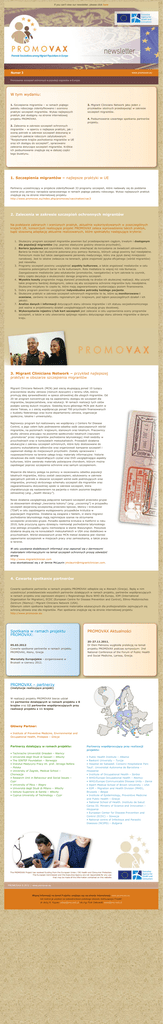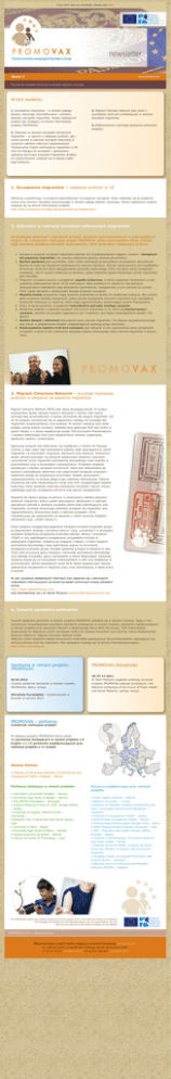 If you can't view our newsletter, please click here Numer 3 www.promovax.eu Promowanie szczepień ochronnych w populacji migrantów w Europie W tym wydaniu: 1. Szczepienia migrantów – w ramach piątego pakietu roboczego zidentyfikowano i oceniono praktyki szczepień migrantów. Wykaz najlepszych praktyk jest dostępny na stronie internetowej projektu PROMOVAX. 3. Migrant Clinicians Network jako jeden z przykładów istotnych przedsięwzięć w zakresie szczepień migrantów. 4. Podsumowanie czwartego spotkania partnerów projektu. 2. Zalecenia w zakresie szczepień ochronnych migrantów – w oparciu o najlepsze praktyki, jak i ocenę potrzeb w zakresie szczepień dokonaną w czwartym pakiecie roboczym zatytułowanym "Rozpoznanie krajów pochodzenia migrantów w UE oraz ich dostępu do szczepień", opracowano zalecenia dotyczące szczepień migrantów. Krótkie ich podsumowanie znajduje się w dalszej części tego biuletynu. 1. Szczepienia migrantów – najlepsze praktyki w UE Partnerzy uczestniczący w projekcie zidentyfikowali 33 programy szczepień, które nadawały się do poddania ocenie przy pomocy narzędzia opracowanego w ramach piątego pakietu roboczego. Wykaz najlepszych praktyk znajduje się na stronie internetowej projektu http://www.promovax.eu/index.php/promovax/vaccination/vac3 2. Zalecenia w zakresie szczepień ochronnych migrantów Na podstawie zabranych i ocenionych praktyk, aktualnie wykorzystywanych w poszczególnych krajach UE, konsorcjum realizujące projekt PROMOVAX zaleca wprowadzenie takich praktyk, bądź stosowną adaptację aktualnie realizowanych, które spełniałyby następujące kryteria: 1. Skuteczny program szczepień migrantów powinien być przedsięwzięciem ciągłym, trwałym i dostępnym dla populacji migrantów (np. poprzez elastyczne godziny otwarcia przychodni), 2. Bariera językowa jest czynnikiem, który może zniechęcać do korzystania ze świadczeń zdrowotnych. Bariera ta może być skutecznie pokonana przy pomocy tłumaczy, których usługi powinny być nieodpłatne. Pomocnym może być także zaangażowanie personelu medycznego, który zna język danej mniejszości narodowej. Jest to istotne zwłaszcza na terenach, gdzie znajomość języka oficjalnego (wśród migrantów) jest niewielka. 3. Programy szczepień powinny uwzględniać aspekty kulturowe, a także angażować mediatorów w celu zniesienia potencjalnych barier na tle kulturowym. Rola mediatora to więcej niż rola tłumacza. Zaangażowanie mediatorów jako edukatorów (promotorów, nawigatorów) w tym zakresie to czynnik, który często decyduje o skuteczności danego programu szczepień. 4. Wysokie koszty programów mogą stanowić przeszkodę na drodze ich skutecznej realizacji. Aby uczynić takie programy bardziej dostępnymi, zaleca się aby szczepienia ochronne migrantów były nieodpłatne. Skuteczne inicjatywy to często te, które mają zagwarantowany wystarczający poziom finansowania. 5. Dobry program powinien uwzględniać indywidualne potrzeby każdego pacjenta. 6. Skuteczne praktyki w zakresie szczepień ochronnych migrantów to te, które są monitorowane i oceniane, zarówno na szczeblu regionalnym jak i krajowym, pod kątem poszczególnych działań i ich jakości. 7. Analiza danych i informacji dotyczących stanu zdrowia migrantów i ich statusu socjoekonomicznego jest ważna w projektowaniu działań uwzględniających sytuację grupy docelowej. 8. Wykorzystanie rejestru i/lub kart szczepień jest zalecane w celu usprawnienia oceny programów szczepień, a także w celu utworzenia spójnego rejestru dotyczącego stanu zdrowia migrantów w danym kraju. 3. Migrant Clinicians Network – przykład najlepszej praktyki w obszarze szczepienia migrantów Migrant Clinicians Network (MCN) jest siecią skupiającą ponad 10 tysięcy pracowników służby zdrowia (różnych dyscyplin) z terenu USA, którzy promują ideę sprawiedliwości w opiece zdrowotnej dla ubogich migrantów. Od 20 lat program koncentruje się na zapewnieniu dostępu do szczepień dla migrantów, bezpieczeństwie, oraz edukacji. W ramach realizacji tych celów podjęto szereg dużych inicjatyw. Siedzibą biura głównego MCN jest Austin w stanie Teksas, a z siecią współpracuje ponad 700 przychodni finansowanych z budżetu federalnego oraz liczne departamenty zdrowia, organizacje społeczne, lokalne i uniwersytety. Najnowszy program był realizowany we współpracy z Centers for Disease Control, a jego celem było podniesienie odsetka osób zaszczepionych wśród migrantów, na poziomach: krajowym, stanowym oraz lokalnym. Pracownicy służby zdrowia pracujący na poziomie społeczności lokalnych (nazywani „promotoras” przez migrantów pochodzenia latynoskiego) mieli siedziby w przychodniach oraz w konsulatach meksykańskich. Prowadzili działania edukacyjne z zakresu szczepień ochronnych, które były dostosowane do poziomu wykształcenia odbiorców oraz organizowali kampanie szczepień i zapewniali dostęp do miejscowych przychodni. Zostały opracowane i rozpowszechnione na terenie całego kraju materiały informacyjne: historie obrazkowe dla osób niepotrafiących czytać oraz DVD uwzględniające aspekty kulturowe, które zawierały materiały poświęcone chorobom, którym można zapobiegać poprzez szczepienia ochronne oraz samym szczepieniom. Wsparcie dla lekarzy polega na pomocy w oszacowaniu odsetka populacji lokalnych migrantów, którzy zostali zaszczepieni, edukowaniu w zakresie specjalnych potrzeb w obszarze szczepień wśród osób podróżujących oraz imigrantów, promocji skróconego schematu szczepień dla migrantów oraz zagwarantowaniu dożywotniej opieki w zakresie szczepień, która charakteryzuje się nastawieniem na pacjenta o niskim poziomie biegłości zdrowotnej (ang. „health literacy”). Nowe działania uwzględniają połączenie kampanii szczepień przeciwko grypie ze stosowaniem strategii „tworzenia kokonu” (ang. „cocooning”) w przypadku szcze