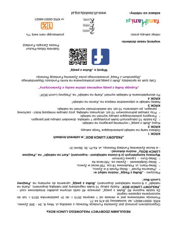 REGULAMIN ZDOBYWCY PASJOWEGO LUNCH BOXa Organizatorem promocji jest Żywiecka Fundacja Rozwoju z siedzibą ul. Niwy 8, 34 - 300 Żywiec, KRS: 0000146021, tel. kontaktowy 33 475 44 77. Promocja realizowana jest w okresie od 1 sierpnia 2015 r. do 31 października 2015 r. lub do wyczerpania zapasów nagród. Za każde kupione 60 „Bułek z pasją”, pierwsze 40 osób otrzyma pudełko śniadanowe czyli „PASJOWY LUNCH BOX”. Każdy zakup 10 bułek nagradzany jest naklejką (kuponem). „Karta na naklejki” z 6-cioma naklejkami (kuponami) „Bułka z pasją” uprawnia do wymiany na „Pasjowy Lunch Box”. Pieczywo - „Bułkę z Pasją” można nabyć w: - „Piekarnia Rynek” - Sklep Rynek 9 w Żywcu, - Sklep Kami, ul. Południowa 18 (os. 700 lecia) w Żywcu, - Sklep Gołębiewski - Żywiec os. 700-lecia 4a - Sklep Euro - Lipowa Centrum Wymiany kompletnych (z 6-cioma naklejkami - kuponami) „Kart na naklejki” na „Pasjowe LUNCH BOXy” można dokonać: - w biurze Żywieckiej Fundacji Rozwoju, ul. Ks.Pr. St. Słonki 31 „PASJOWY LUNCH BOX” w czterech krokach KROK 1 Odbierz kartę na naklejki potwierdzające Twoje zakupy. KROK 2 Kupuj „Bułki z pasją” i wymieniaj paragony na naklejki. - Za każde 10 zakupionych bułek przysługuje 1 naklejka, dowodem zakupu jest paragon. - Paragony potwierdzające zakupy wymień na naklejki - Przy zakupie jednorazowym 10 szt. otrzymasz naklejkę, przy zakupie mniejszej ilości - zachowaj paragon, po uzbieraniu 10 szt. lub wielokrotności wymień na naklejki. KROK 3 Naklej naklejki w odpowiednie miejsca na „Karcie na naklejki”. KROK 4 Po skompletowaniu 6 naklejek wymień „Kartę na naklejki” na „Pasjowy Lunch BOX”. „Kupując bułkę z pasją wspierasz zdolne osoby z Żywiecczyzny” Cały zysk ze sprzedaży „Bułki z pasją jest przekazywana na konto Funduszu Stypendialnego „Stypendium z Pasją” prowadzonego przez Żywiecką Fundację Rozwoju Więcej o „Bułce z pasją” Gabriela Gibas-Psuturi Prezes Zarządu Fundacji wspieraj nasze działania: robiąc zakupy przez: przekazując nam swój 1% nr KRS 0000146021 zobacz co robimy: www.zfr.beskidy.org.pl