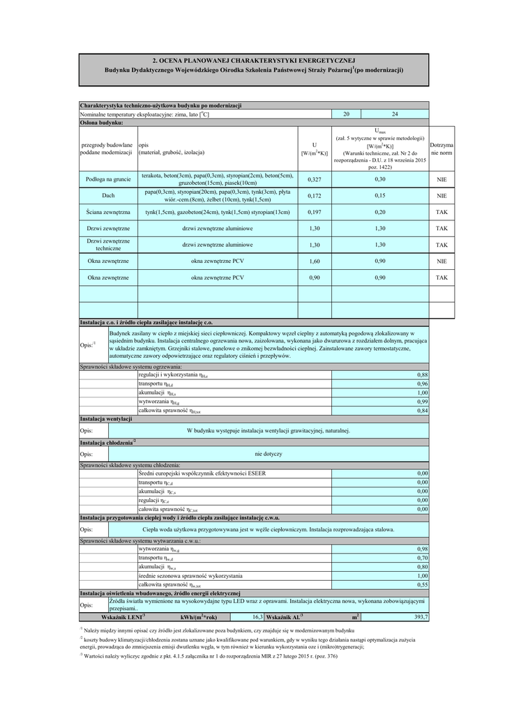 2. OCENA PLANOWANEJ CHARAKTERYSTYKI ENERGETYCZNEJ Budynku Dydaktycznego Wojewódzkiego Ośrodka Szkolenia Państwowej Straży Pożarnej1(po modernizacji) Charakterystyka techniczno-użytkowa budynku po modernizacji o Nominalne temperatury eksploatacyjne: zima, lato [ C] Osłona budynku: 20 24 Umax przegrody budowlane poddane modernizacji opis (materiał, grubość, izolacja) U [W/(m2*K)] (zał. 5 wytyczne w sprawie metodologii) Dotrzyma [W/(m2*K)] nie norm (Warunki techniczne, zał. Nr 2 do rozporządzenia - D.U. z 18 września 2015 poz. 1422) Podłoga na gruncie terakota, beton(3cm), papa(0,3cm), styropian(2cm), beton(5cm), gruzobeton(15cm), piasek(10cm) 0,327 0,30 NIE Dach papa(0,3cm), styropian(20cm), papa(0,3cm), tynk(3cm), płyta wiór.-cem.(8cm), żelbet (10cm), tynk(1,5cm) 0,172 0,15 NIE Ściana zewnętrzna tynk(1,5cm), gazobeton(24cm), tynk(1,5cm) styropian(13cm) 0,197 0,20 TAK Drzwi zewnętrzne drzwi zewnętrzne aluminiowe 1,30 1,30 TAK Drzwi zewnętrzne techniczne drzwi zewnętrzne aluminiowe 1,30 1,30 TAK Okna zewnętrzne okna zewnętrzne PCV 1,60 0,90 NIE Okna zewnętrzne okna zewnętrzne PCV 0,90 0,90 TAK Instalacja c.o. i źródło ciepła zasilające instalację c.o. /1 Opis: Budynek zasilany w ciepło z miejskiej sieci ciepłowniczej. Kompaktowy węzeł cieplny z automatyką pogodową zlokalizowany w sąsiednim budynku. Instalacja centralnego ogrzewania nowa, zaizolowana, wykonana jako dwururowa z rozdziałem dolnym, pracująca w układzie zamkniętym. Grzejniki stalowe, panelowe o znikomej bezwładności cieplnej. Zainstalowane zawory termostatyczne, automatyczne zawory odpowietrzające oraz regulatory ciśnień i przepływów. Sprawności składowe systemu ogrzewania: regulacji i wykorzystania ηH,e 0,88 transportu ηH,d 0,96 akumulacji ηH,s 1,00 wytworzania ηH,g 0,99 całkowita sprawność ηH,tot 0,84 Instalacja wentylacji W budynku występuje instalacja wentylacji grawitacyjnej, naturalnej. Opis: Instalacja chłodzenia /2 nie dotyczy Opis: Sprawności składowe systemu chłodzenia: Średni europejski współczynnik efektywności ESEER transportu ηC,d akumulacji ηC,s 0,00 regulacji ηC,e 0,00 całowita sprawność ηC,tot Instalacja przygotowania ciepłej wody i źródło ciepła zasilające instalację c.w.u. Opis: 0,00 0,00 0,00 Ciepła woda użytkowa przygotowywana jest w węźle ciepłowniczym. Instalacja rozprowadzająca stalowa. Sprawności składowe systemu wytwarzania c.w.u.: wytworzania ηw,g 0,98 transportu ηw,d 0,70 akumulacji ηw,s 0,80 średnie sezonowa sprawność wykorzystania 1,00 całkowita sprawność ηw,tot 0,55 Instalacja oświetlenia wbudowanego, źródło energii elektrycznej Źródła światła wymienione na wysokowydajne typu LED wraz z oprawami. Instalacja elektryczna nowa, wykonana zobowiązującymi Opis: przepisami.. /3 16,3 Wskaźnik Al./3 393,7 kWh/(m2*rok) m2 Wskaźnik LENI /1 Należy między innymi opisać czy źródło jest zlokalizowane poza budynkiem, czy znajduje się w modernizowanym budynku /2 koszty budowy klimatyzacji/chłodzenia zostana uznane jako kwalifikowane pod warunkiem, gdy w wyniku tego działania nastąpi optymalizacja zużycia energii, prowadząca do zmniejszenia emisji dwutlenku węgla, w tym również w kierunku wykorzystania oze i (mikro)trygeneracji; /3 Wartości należy wyliczyc zgodnie z pkt. 4.1.5 załącznika nr 1 do rozporządzenia MIR z 27 lutego 2015 r. (poz. 376) Obliczeniowe zapotrzebowanie na energię budynku po modernizacji Roczne zapotrzebowanie na energię końcową Qk [kWh /(rok)] - na podstawie dokumentacji obliczeń charakterystyki energetycznej budynku po modernizacji Nośnik energii ogrzewanie i wentylacja ciepła woda chłodzenie użytkowa oświetlenie wbudowane energia pomocnicza4 suma Olej opałowy 0,0 Gaz ziemny 0,0 Gaz płynny 0,0 Węgiel kamienny 0,0 Węgiel brunatny 0,0 0,0 Biomasa Inny (podać jaki) ……………… 0,0 6 Ciepło sieciowe MPEC S.A. Kraków, Wpc=0,62 38 769,6 42 129,6 3 360,0 Energia elektryczna na potrzeby budynku z sieci elektroenergetycznej 6 397,6 621,8 Energia elektryczna wyprodukowana w miejscu, zużyta na potrzeby budynku (podawać ze znakiem minus) 5) 7 019,4 0,0 Łącznie zapotrzebowanie budynku na energię końcową Qk [kWh /(rok)] 49 149,0 Łącznie zapotrzebowanie budynku na energię pierwotną Qp [kWh /(rok)] 47 178,6 Podział zapotrzebowania energii Roczne jednostkowe zapotrzebowanie na energię użytkową Eu 3 [kWh/(m2rok)] ogrzewanie + wentylacja 2 ciepła woda chłodzenie użytkowa 82,4 79% Eu [kWh/m *rok] udział [%] 4,7 4% 0,0 0% oświetlenie wbudowane energia pomocnicza4 suma 16,2 15% 1,6 2% 104,9 100,0% oświetlenie wbudowane energia4 suma 16,2 13% 1,6 1% 124,8 100,0% Roczne jednostkowe zapotrzebowanie na energię końcową Ek 3 [kWh/(m2rok)] ogrzewanie + wentylacja 2 ciepła woda chłodzenie użytkowa 98,5 79% Ek [kWh/m *rok] udział [%] 8,5 7% 0,0 0% Roczne jednostkowe zapotrzebowanie na energię pierwotną Ep 3 [kWh/(m2rok)] ogrzewanie + wentylacja Ep [kWh/m2*rok] udział [%] 1) ciepła woda chłodzenie użytkowa 61,1 51% 5,3 4% oświetlenie wbudowane energia4 suma 0,0 0% 48,7 41% 4,7 4% 119,8 100,0% 48,7 EP cząstkowe 66,3 0,0 EPmax 45,0 0,0 50,0 Wskaźnik przekroczony Warunek spełniony Warunek spełniony podać pełną nazwę budynku 2) z ciepłowni/ elektrociepłowni, podać rodzaj ciepłowni/ elektrociepłowni – np. ciepłownia węglowa, w przypadku gdy operator ciepłowni/elektrociepłowni podaje informację o wskaźniku nieodnawialnej energii pierwotnej na ciepło - załączyć odpowiedni dokument 3) Wskaźniki Ep i Ek i Ep cząstkowe należy obliczyć w oparciu o Rozporządzenia Ministra Infrastruktury i Rozwoju z dnia 27 lutego 2015 r. w sprawie metodologii wyznaczania charakterystyki energetycznej budynku lub części budynku oraz świadectw charakterystyki energetycznej budynków (Dz. U. z 18 marca 2015 r. poz. 376) 4) 5) sumaryczna energia pomocnicza dla systemów: ogrzewania, c.w.u., wentylacji oraz w przypadku gdy dotyczy chł