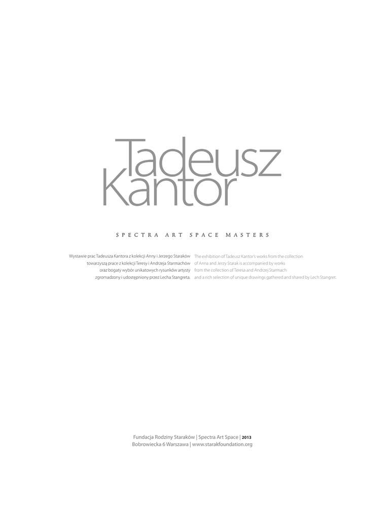 S p e c t r a A r t S p a c e M a s t e r s Wystawie prac Tadeusza Kantora z kolekcji Anny i Jerzego Staraków The exhibition of Tadeusz Kantor’s works from the collection towarzyszą prace z kolekcji Teresy i Andrzeja Starmachów of Anna and Jerzy Starak is accompanied by works oraz bogaty wybór unikatowych rysunków artysty from the collection of Teresa and Andrzej Starmach zgromadzony i udostępniony przez Lecha Stangreta. and a rich selection of unique drawings gathered and shared by Lech Stangret. Fundacja Rodziny Staraków | Spectra Art Space | 2013 Bobrowiecka 6 Warszawa | www.starakfoundation.org Mistrzowski oznacza skończony. Doskonały oznacza skończony. Mistrzowski oznacza harmonijny. Doskonały oznacza harmonijny. Mistrzowski oznacza zgodny. Doskonały oznacza zgodny. Mistrzostwo oznacza osiągnięty cel. Doskonałość oznacza osiągnięty cel. Zdobyty cel nie zamyka i nie kończy drogi. Otwierają się kolejne przestrzenie, ujawniają się następne obszary, które wyznaczają nowe kierunki kreacji. Eksperyment, który nierozerwalnie towarzyszy, staje się jej wartością odżywczą. W stopniu mistrzowskim umiejętności płynnie wypełniają odważne decyzje. Charyzma, dar wyjątkowości powoduje, że odległe stają się ogólne normy, ważny jest autorytet, który gwarantuje MISTRZ. Jedynie postawa zbudowana według wymagających i trudnych do osiągnięcia zasad może starać się o tytuł mistrza. Staje się nim człowiek oświecony, o dojrzałej osobowości i nieugiętym charakterze. Autorytet i wzór do naśladowania, który osiągnął najwyższy stopień wiedzy lub umiejętności w danej dziedzinie. Mistrzostwo w sztuce to wpisanie się w wieczne idee poprzez determinację, odwagę, niezłomność i niepodważalność wyborów. Wystawą prac Tadeusz Kantora Spectra Art Space inauguruje nowy cykl masters, którego celem jest prezentacja twórczości najwybitniejszych polskich artystów - mistrzów, profesorów oraz prekursorów awangardy drugiej połowy których prace w znaczący sposób konstruują kolekcję Anny i Jerzego Staraków. Master means finished. Perfect means finished. Master means harmonious. Perfect means harmonious Master means compatible. Perfect means compatible. Mastery means achieved target. Perfection means achieved target. The achieved target does not close or end the road. Another spaces are opening, next areas, that outline new direction of creation, are revealing. The experiment, which inherently accompanies it, becomes its nutritional value. In the mastery degree skills fluently fulfill the courageous decisions. Charisma, gift of uniqueness make that general rules are becoming distant, the authority, guaranteed by the MASTER, is significant. Only an attitude built of demanding and difficult to achieve principles can apply for the master title. An enlightened man of mature personality and unbending character can become one. The authority and the role model who has attained the highest level of knowledge and abilities in a particular domain. Mastery in the arts means stepping into the eternal ideas throughout determination, courage, steadfastness and indisputability of choices. Exhibition of works by Tadeusz Kantor inaugurates a new series Spectra Art Space MASTERS, which aims to present the work of the greatest Polish artists – masters, professors and precursors of the avant-garde of the second half of the twentieth century, whose output had a significant impact for constructing Anna and Jerzy Starak art collection Ania Muszyńska kuratorka Spectra Art Space Spectra Art Space curator „U progu mojej przyszłości stałem przed jej «nieskończonością». “On the threshold of my future I was standing in front of its “infinity”. Endlessly! Bez końca! Ruszyłem w tę przyszłość z otwartymi szeroko oczami I set off to this future with my eyes wide open and with «grandness» i z «wielkością» w plecaku. (…) Nie «ustalałem» w pośpiechu, in my backpack… I did not «determine» in a hurry, like others, jak inni, i nie utrwalałem swojej «sylwetki». Czułem już wtedy, and I did not establish my «silhouette». I already felt that individuality is że indywidualność nie leży w formie i geście stylistycznym. not inherent in the form and in the stylistic gesture. I did not «determine» Nie «ustalałem» rysów mego oblicza, aby je potem nieść przed sobą the features of my face in order to carry them later before me along znaną drogą do progów muzealnych. a well-known path to museum thresholds. I felt that it was too simplified Czułem, że jest to zbyt uproszczone i sztuczne. and artificial. That my «individuality» and my truth lie at some place much Że moja «indywidualność» i moja prawda leży gdzieś o wiele dalej, że będę farther, that I will be going towards it for a long time, that this WANDERING szedł do niej długo, że ta WĘDRÓWKA i jej niespodziewane perypetie and its unexpected ups and downs will eventually make up będą składały się w końcu na moje «oblicze». A nie forma!” my «countenance». Not the form!” Tadeusz Kantor W historiografii zajmującej się XX wiekiem najczęściej przyjmuje się, jako daty graniczne rok 1914 i 1990. Niektórzy badacze opisujący najważniejsze zjawiska minionego stulecia przesuwają czas rozpoczęcia wieku na rok 1918, a zakończenia 1991. Przyjęty, dla potrzeb historycznego dyskursu, obraz „skróconego” wieku, w którym abstrakcyjne idee można było przekładać na monstrualne programy transformacji społeczeństw, jawi się jako jeden z najtragiczniejszych rozdziałów w historii ludzkości. Już krwawe żniwo pierwszej wojny światowej mocno nadwyrężyło wiarę w człowieka i siłę jego intelektu, jako sprawczej mocy postępu. Sztuka musiała znaleźć nowe formy humanistycznego wizerunku, gdyż dotychczasowy model przedstawiania i kanony estetyczne, nie odpowiadały rzeczywistości. Po drugiej wojnie światowej artystom zadano je