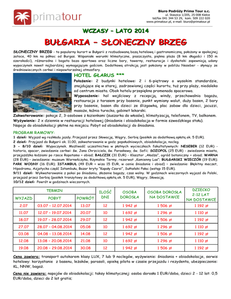 Biuro Podróży Prima Tour s.c. ul. Staszica 1/205, 25-008 Kielce tel/fax 041 344 53 29, kom. 509 222 020 www.primatour.pl, e-mail: [email protected] WCZASY – LATO 2014 BUŁGARIA – SŁONECZNY BRZEG SŁONECZNY BRZEG - to popularny kurort w Bułgarii z rozbudowaną bazą hotelową i gastronomiczną, położony w spokojnej zatoce, 40 km na północ od Burgas. Wspaniałe warunki klimatyczne, piaszczysta, piękna plaża (8 km długości i 150 m szerokości), różnorodna i bogata baza sportowa oraz liczne bary, tawerny, restauracje i dyskoteki zapewniają udany wypoczynek nawet najbardziej wymagającym gościom. Dodatkową atrakcją jest położony w pobliżu Neseber - słynący ze średniowiecznych cerkwi i niepowtarzalnej atmosfery. HOTEL GŁARUS *** Położenie: 2 budynki hotelowe: 2 i 6-piętrowy o wysokim standardzie, znajdujące się w starej, zadrzewionej części kurortu, tuż przy plaży, niedaleko od centrum miasta. Obok hotelu przepiękna promenada spacerowa. Wyposażenie: hol wejściowy z recepcją, windy, przechowalnia bagażu, restauracja z tarasem przy basenie, punkt wymiany walut, duży basen, 2 bary przy basenie, basen dla dzieci ze ślizgawką, plac zabaw dla dzieci, jacuzzi, masaże, łaźnia turecka, gabinet lekarski. Zakwaterowanie: pokoje 2, 3-osobowe z łazienkami (suszarka do włosów), klimatyzacją, telefonem, TV, balkonem. Wyżywienie: 2 x dziennie w restauracji hotelowej (śniadanie i obiadokolacja w formie szwedzkiego stołu). Napoje do obiadokolacji płatne na miejscu. Pobyt od obiadokolacji do śniadania. PROGRAM RAMOWY: 1 dzień: Wyjazd wg rozkładu jazdy. Przejazd przez Słowację, Węgry, Serbię (posiłek za dodatkową opłatą ok. 5 EUR). 2 dzień: Przyjazd do Bułgarii ok. 11.00, zakwaterowanie w godz. popołudniowych, obiadokolacja, nocleg. 3 - 8/10 dzień: Wypoczynek. Możliwość uczestnictwa w płatnych wycieczkach fakultatywnych: NESEBER (12 EUR) historia, spacer, zwiedzanie cerkwi: św. Jana Chrzciciela, św. Paraskewy, św. Sofii; SOZOPOL (25 EUR) - zwiedzanie miasta, przejażdżka łodziami po rzece Ropotamo + obiad; BAŁCZIK (31 EUR) - Klasztor „Aładża”, ogród botaniczny + obiad; WARNA (28 EUR) – zwiedzanie: muzeum Warneńczyka, Rzymskie Termy, rezerwat „Kamienny Las”; BUŁGARSKI WIECZÓR (19 EUR); PARK WODNY (16 EUR); ISTAMBUŁ (49 EUR + wiza 15 EUR, w cenie śniadanie i obiad) – zwiedzanie: Błękitny meczet, Hipodromu, Azjatycka część Istambułu, Bazar kryty ”Kapały Czarsi”, Sułtański Pałac (wstęp 15 EUR). 9/11 dzień: Wykwaterowanie z pokoi po śniadaniu, złożenie bagaży, czas wolny. W godzinach wieczornych wyjazd do Polski, przejazd przez Serbię (posiłek tranzytowy za dodatkową opłatą ok. 5 EUR), Węgry, Słowację. 10/12 dzień: Powrót w godzinach wieczornych. TERMIN OSOBA DOROSŁA OSOBA DOROSŁA NA DOSTAWCE DZIECKO 2-12 LAT NA DOSTAWCE WYJAZD POBYT POWRÓT ILOŚĆ DNI 2.07 03.07 – 12.07.2014 13.07 12 1 942 zł 1 506 zł 1 192 zł 11.07 12.07 – 19.07.2014 20.07 10 1 692 zł 1 296 zł 1 110 zł 18.07 19.07 – 28.07.2014 29.07 12 1 942 zł 1 506 zł 1 192 zł 27.07 28.07 – 04.08.2014 05.08 10 1 692 zł 1 296 zł 1 110 zł 03.08 04.08 – 13.08.2014 14.08 12 1 942 zł 1 506 zł 1 192 zł 12.08 13.08 – 20.08.2014 21.08 10 1 692 zł 1 296 zł 1 110 zł 19.08 20.08 – 29.08.2014 30.08 12 1 942 zł 1 506 zł 1 192 zł Cena zawiera: transport autokarem klasy LUX, 7 lub 9 noclegów, wyżywienie: śniadania + obiadokolacje, serwis hotelowy: korzystanie z basenu, leżaków, parasoli, opiekę pilota w czasie przejazdu i rezydenta, ubezpieczenie: KL, NNW, bagaż. Cena nie zawiera: napojów do obiadokolacji; taksy klimatycznej: osoba dorosła 1 EUR/doba, dzieci 2 - 12 lat: 0,5 EUR/doba, dzieci do 2 lat gratis;
