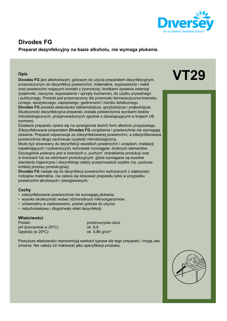 Divodes FG Preparat dezynfekcyjny na bazie alkoholu, nie wymaga płukania. Opis Divodes FG jest alkoholowym, gotowym do użycia preparatem dezynfekcyjnym, przeznaczonym do dezynfekcji powierzchni, materiałów, wyposażenia i mebli oraz powierzchni mających kontakt z żywnością i środkami żywienia zwierząt (pojemniki, naczynia, wyposażenie i sprzęty kuchenne), do użytku prywatnego i publicznego. Produkt jest przeznaczony dla przemysłu farmaceutyczno-kosmetycznego, spożywczego, napojowego, gastronomii i handlu detalicznego. Divodes FG posiada właściwości bakteriobójcze, grzybobójcze i prątkobójcze. Skuteczność dezynfekcyjna preparatu została potwierdzona wynikami testów mikrobiologicznych, przeprowadzonych zgodnie z obowiązującymi w krajach UE normami. Działanie preparatu opiera się na synergizmie dwóch form alkoholu propylowego. Zdezynfekowane preparatem Divodes FG urządzenia i powierzchnie nie wymagają płukania. Preparat odparowuje ze zdezynfekowanej powierzchni, a zdezynfekowana powierzchnia długo zachowuje czystość mikrobiologiczną. Może być stosowany do dezynfekcji wszelkich powierzchni i urządzeń, instalacji napełniających i rozlewniczych, końcówek rurociągów, drobnych elementów. Szczególnie polecany jest w branżach o „suchym” charakterze produkcji oraz w branżach lub na odcinkach produkcyjnych, gdzie wymagane są wysokie standardy higieniczne i dezynfekcję należy przeprowadzić szybko (np. podczas krótkiej przerwy produkcyjnej). Divodes FG nadaje się do dezynfekcji powierzchni wykonanych z większości rodzajów materiałów, nie zaleca się stosować preparatu tylko w przypadku powierzchni akrylowych i plexiglasowych. Cechy • • • • zdezynfekowane powierzchnie nie wymagają płukania; wysoka skuteczność wobec różnorodnych mikroorganizmów; uniwersalny w zastosowaniu, postać gotowa do użycia; natychmiastowy i długotrwały efekt dezynfekcji; Właściwości Postać: pH (koncentrat w 20ºC): Gęstość (w 20ºC): przeźroczysta ciecz ok. 8,8 ok. 0,86 g/cm³ Powyższe właściwości reprezentują wartości typowe dla tego preparatu i mogą ulec zmianie. Nie należy ich traktować jako specyfikacji produktu. VT29 Divodes FG Sposób użycia Na umyte i suche (ewentualnie lekko wilgotne) powierzchnie nanieść poprzez natrysk Divodes FG. Podczas stosowania produktu należy stosować zalecane poniżej czasy kontaktu z powierzchnią: 1. Czas kontaktu 5 minut, temperatura 20ºC: a) roztwór 25% - działanie bakteriobójcze, b) roztwór 50% - działanie bakteriobójcze oraz przeciw grzybom drożdżopodobnym, c) koncentrat - działanie bakteriobójcze, grzybobójcze oraz działanie bójcze wobec prątków gruźlicy. 2. Czas kontaktu 15 minut, temperatura 20ºC: a) roztwór 50% - działanie bakteriobójcze oraz przeciw grzybom drożdżopodobnym, b) koncentrat - działanie bakteriobójcze, grzybobójcze oraz działanie bójcze wobec prątków gruźlicy. Uwaga: Zdezynfekowane powierzchnie nie wymagają płukania. Uwaga: Produkt przeznaczony do profesjonalnego stosowania. Dokładny sposób użycia preparatu, dostosowany do Państwa potrzeb określi nasz przedstawiciel handlowy. Informacje dotyczące skuteczności mikrobiologicznej • preparat Divodes FG uzyskał pozytywne wyniki badań, zgodnie z normą EN 1276:2000 (działanie bakteriobójcze [Staphylococcus aureus, Pseudomonas aeruginosa, Escherichia coli, Enterococcus hirae]), stosowany w stężeniu 25,0% oraz w postaci czystej, w warunkach czystych, w czasie 5 minut, temperaturze 20°C, w wodzie twardej [DZ/01/08/08 – 11.08.2008]; • preparat Divodes FG uzyskał pozytywne wyniki badań, zgodnie z normą EN 1276 (działanie bakteriobójcze [Salmonella enterica]), stosowany w stężeniu 25,0%, w warunkach brudnych, w czasie 5 minut, temperaturze 20°C; • preparat Divodes FG uzyskał pozytywne wyniki badań, zgodnie z normą EN 1276 (działanie bakteriobójcze [Listeria monocytogenes]), stosowany w stężeniu 50,0%, w warunkach brudnych, w czasie 5 minut, temperaturze 20°C; • preparat Divodes FG uzyskał pozytywne wyniki badań, zgodnie z normą EN 1650:2002 stosowany w stężeniu 50,0% oraz w postaci czystej (działanie grzybobójcze - przeciw grzybom drożdżopodobnym) oraz w stężeniu 80,0% - postać czysta (działanie grzybobójcze - przeciw pleśniom), w warunkach czystych, w czasie 15 minut, temperaturze 20°C, w wodzie twardej [DZ/02/08/08- 11.08.2008]; • preparat Divodes FG uzyskał pozytywne wyniki badań, zgodnie z normą EN 1650:2002 stosowany w stężeniu 50,0% oraz w postaci czystej (działanie grzybobójcze - przeciw grzybom drożdżopodobnym) oraz w stężeniu 80,0% - postać czysta (działanie grzybobójcze - przeciw pleśniom), w warunkach czystych, w czasie 5 minut, temperaturze 20°C, w wodzie twardej [DZ/02/08/08- 11.08.2008]; • preparat Divodes FG uzyskał pozytywne wyniki badań, zgodnie z normą EN 13697:2002 (działanie bakteriobójcze [Staphylococcus aureus, Pseudomonas aeruginosa, Escherichia coli, Enterococcus hirae]), stosowany w stężeniu 25,0% oraz w postaci czystej, w warunkach czystych, w czasie 5 minut, temperaturze 20°C, w wodzie twardej [DZ/03/08/08 – 11.08.2008]; • preparat Divodes FG uzyskał pozytywne wyniki badań, zgodnie z normą EN 13697:2002 stosowany w stężeniu 50,0% oraz w postaci czystej (działanie grzybobójcze - przeciw grzybom drożdżopodobnym) oraz w stężeniu 100% - postać czysta (działanie grzybobójcze - przeciw pleśniom), w warunkach czystych, w czasie 15 minut, temperaturze 20°C, w wodzie twardej [DZ/03/08/08 – 11.08.2008]; • preparat Divodes FG uzyskał pozytywne wyniki badań, zgodnie z normą EN 13697:2002 stosowany w stężeniu 50,0% oraz w postaci czystej (działanie grzybobójcze - przeciw grzybom drożdżopodobnym) oraz w stężeniu 100% - postać czysta (działanie grzybobójcze - przeciw pleśniom), w warunkach czystych, w czasie 5 minut, temperaturze 20°C, w wodzie twardej [DZ/03/0
