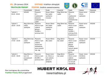 CEL: 29 czerwca 2014 DYSTANS: triathlon olimpijski TRIATHLON PNIEWY POZIOM: średnio zaawansowany Poniedziałek Wtorek Środa Czwartek 2014 Tydzień 1 03.03 -‐ 09.03 Pływanie 45 – rozpływanie pływanie swobodne bez zadań Bieg 10min bez Pływanie zadań, 45min w tym spokojnie zadanie główne 3x200kr z przerwą 1min Rower 30min bez zadań spokojnie-‐ trenażer Tydzień 3 17.03 – 23.03 Bieg 20min bez Pływanie zadań 45min w tym spokojnie zadania techniczne-‐ dokładanka, praca samych rąk, nóg Rower 40min Bez zadań Tydzień 4 24.03 – 30.03 Bieg 30min w tym 4-‐6 przyspieszeń 100m Rower-‐teren ok. 45min w tym zadanie główne 4 podjazdy Tydzień 2 10.03 – 16.03 WOLNE Plan treningowy dla uczestników Triathlon Pniewy 2014 przygotował: Pływanie 45min w tym 8x100kr z przerwa 2min Rower 30min bez zadań spokojnie-‐ trenażer Piątek Bieg 30min bez Pływanie zadań 45 – rozpływanie pływanie swobodne bez zadań Bieg 30min bez Pływanie zadań 45min w tym zadanie główne 3x100kr z przerwą 2min. Powtórzone 2 x Bieg-‐30min Pływanie bez zadań 45min w tym zadanie główne 2x300na samych rękach do kraula p2min Bieg-‐40min Pływanie bez zadań 45min w tym zadanie główne 600m na czas jak najszybciej Sobota Rower-‐teren 45min spokojnie Niedziela WOLNE Rower-‐teren 50min spokojnie WOLNE Rower-‐ teren 50-‐60min spokojnie WOLNE Rower -‐teren 50-‐60min spokojnie WOLNE CEL: 29 czerwca 2014 DYSTANS: triathlon olimpijski TRIATHLON PNIEWY POZIOM: średnio zaawansowany Tydzień 5 Bieg 40min bez Pływanie Rower-‐teren Bieg 40min 2014 31.03 – 06.04 Tydzień 6 07.04 – 13.04 Tydzień 7 14.04 – 20.04 Tydzień 8 21.04 – 27.04 Pływanie zadań 45min w tym 45min bez 2x5min na 85 45min w tym Zadania zadań na przerwie zadanie techniczne, 5min główne dokładanka, 3x100m praca samych p45sek rąk, nóg powtórzone 2x Bieg 30min bez Pływanie Rower-‐ teren Bieg 30min bez Pływanie zadań 45min w tym 50min w tym zadań 45min w tym zadanie zadanie główne zadanie 2x300kr p3min 20min na 85% 2x300kr na łapach p2min Bieg 40min w Pływanie Rower-‐teren Bieg 45min w Pływanie tym 4-‐6 45min w tym 50min w tym tym zadanie 45min w tym przyśpieszeń zadania zadanie główne główne zadanie 100m techniczne-‐ 2x10min na 2x5’ na 85% główne 6x50m dokładanka, 85% pomiędzy pomiędzy kraul na 90% praca samych 5min spokojnie 5min p45sek rąk, nóg spokojnie powtórzone 2x Bieg 50min bez Pływanie Rower teren Bieg 45min w Pływanie zadań 45min w tym 60min w tym tym zadanie 60min w tym spokojnie zadanie zadanie główne zadanie główne główne2x10min 3x4min na 85% główne 3x250m kr na 85% pomiędzy 2x300m kr p2min30min pomiędzy 4min p3min pływane 10min spokojnie równo spokojnie Plan treningowy dla uczestników Triathlon Pniewy 2014 przygotował: Rower –teren 60-‐70min spokojnie WOLNE Rower-‐ teren 60-‐70min bez zadań spokojnie WOLNE Rower 70-‐ 80min bez zadań spokojnie WOLNE Rower 70-‐ 80min bez zadań spokojnie WOLNE CEL: 29 czerwca 2014 DYSTANS: triathlon olimpijski TRIATHLON PNIEWY POZIOM: średnio zaawansowany Tydzień 9 Bieg 40min w Pływanie Rower teren Bieg 50min bez 2014 28.04 – 04.05 Tydzień 10 05.05 – 11.05 Tydzień 11 12.05 – 18.05 Tydzień 12 19.05 -‐ 25.05 Tydzień 13 26.05 -‐ 01.06 tym w połowie treningu podbiegi 4x20sek Bieg 40min Bez zadań Pływanie 60min w tym zadanie główne2x500m p3min Rower 80-‐ 90min spokojnie bez zadań WOLNE Bieg 50min bez Pływanie 60min zadań w tym 700m kr p 2min + 300m p2min Rower 80min w Bieg 50min w Pływanie 60min tym zadanie tym zadanie w tym zadanie główne 4-‐6 razy główne 20min główne to podjazdy na 85% 1500m Rower 80-‐ 90min spokojnie bez zadań Rower 80-‐ 90min bez zadań WOLNE Rower 80-‐ 90min bez zadań WOLNE 45min w tym 80min bez zadań zadanie główne zadań spokojnie 5x200m p3min 60min w tym Rower teren Zadanie główne 80min bez to 6x150 p2min zadań 50min w tym 45min w tym zadanie główne 2x400-‐ 20min na 85% pierwsza kr druga na rękach do kraula 40min bez 45min w tym Rower 60 bez zadań 2x400 na zadań samych rękach do kraula 50min w tym Pływanie zadanie główne 60min w tym 20min na 85% 5x300m kr p3’ Plan treningowy dla uczestników Triathlon Pniewy 2014 przygotował: Rower 80min bez zadań Bieg 40min w tym 4-‐6 razy przyśpieszenie na odcinku 100m Bieg 50min w tym zadanie główne 3x3min na 5min spokojnie Pływanie 45min 4x75m kr p1min powtórzone 3 razy Pływanie 60min w tym 8x50m kr p45sek powtórzone 3 razy WOLNE Rower 80-‐ WOLNE 90min w tym2x25min na 85% pomiędzy 10min spokojnie CEL: 29 czerwca 2014 DYSTANS: triathlon olimpijski TRIATHLON PNIEWY POZIOM: średnio zaawansowany Tydzień 14 40min Rower 80min w Bieg 60min bez 2014 bez zdań Pływanie 02.06 – 08.06 Tydzień 15 09.06 – 15.06 Tydzień 16 16.06 -‐ 22.06 Tydzień 17 23.06 -‐29.06 spokojnie 45min w tym 4x400m kr na przerwie 2min30sek Bieg 60min w Pływanie tym zadanie 60min w tym główne 40min zadanie główne na 85% 3x400m na samych rękach do kraula p2min Bieg 50min w Pływanie tym podbiegi 60min w tym 6x20’’ 1200m ciągiem kr Bieg 40min bez WOLNE zadań Pływanie 60min Rower 90-‐100 w tym 6x100kr bez zadań p1min 30sek powtórzone 2x WOLNE tym 6x1km na 90% na 2km spokojnie zadań Rower 80min w tym 6x5min na coraz twardszym przełożeniu, pomiędzy 5min spokojnie Rower 80min w tym zadanie główne 30min na 85% Rower 45min spokojnie bez zadań Bieg 50min w Pływanie w tym zadanie jeziorze główne 6x1min na 90% pomiędzy 4min spokojnie Rower 90-‐ WOLNE 100min w tym 2x30min na 85% pomiędzy 10min spokojnie Bieg 60min bez Pływanie w zadań jeziorze Rower 60-‐ 70min bez zadań Bieg 30min w tym 4-‐6 przyśpieszeń 100m WOLNE lub WOLNE spokojne rozbieganie 30 min + w zależności od samopoczucia 2-‐4 przyspieszeń na odcinku krótszym niż 100m. WOLNE START NA DYSTANSIE OLIMPIJSKIM (STANDARD) Plan treningowy dla uczestników Triathlon Pniewy 2014 przygotował