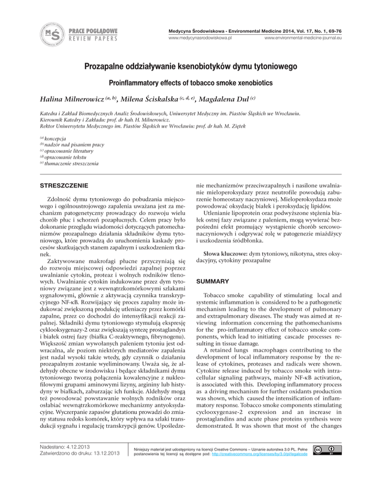 Medycyna Środowiskowa - Environmental Medicine 2014, Vol. 17, No. 1, 69-76 www.environmental-medicine-journal.eu www.medycynasrodowiskowa.pl Prozapalne oddziaływanie ksenobiotyków dymu tytoniowego Proinflammatory effects of tobacco smoke xenobiotics Halina Milnerowicz (a, b), Milena Ściskalska (c, d, e), Magdalena Dul (c) Katedra i Zakład Biomedycznych Analiz Środowiskowych, Uniwersytet Medyczny im. Piastów Śląskich we Wrocławiu. Kierownik Katedry i Zakładu: prof. dr hab. H. Milnerowicz. Rektor Uniwersytetu Medycznego im. Piastów Śląskich we Wrocławiu: prof. dr hab. M. Ziętek koncepcja nadzór nad pisaniem pracy (c) opracowanie literatury (d) opracowanie tekstu (e) tłumaczenie streszczenia (a) (b) StrESzczENiE Zdolność dymu tytoniowego do pobudzania miejscowego i ogólnoustrojowego zapalenia uważana jest za mechanizm patogenetyczny prowadzący do rozwoju wielu chorób płuc i schorzeń pozapłucnych. Celem pracy było dokonanie przeglądu wiadomości dotyczących patomechanizmów prozapalnego działania składników dymu tytoniowego, które prowadzą do uruchomienia kaskady procesów skutkujących stanem zapalnym i uszkodzeniem tkanek. Zaktywowane makrofagi płucne przyczyniają się do rozwoju miejscowej odpowiedzi zapalnej poprzez uwalnianie cytokin, proteaz i wolnych rodników tlenowych. Uwalnianie cytokin indukowane przez dym tytoniowy związane jest z wewnątrzkomórkowymi szlakami sygnałowymi, głównie z aktywacją czynnika transkrypcyjnego NF-κB. Rozwijający się proces zapalny może indukować zwiększoną produkcję utleniaczy przez komórki zapalne, przez co dochodzi do intensyfikacji reakcji zapalnej. Składniki dymu tytoniowego stymulują ekspresję cyklooksygenazy-2 oraz zwiększają syntezę prostaglandyn i białek ostrej fazy (białka C-reaktywnego, fibrynogenu). Większość zmian wywołanych paleniem tytoniu jest odwracalna, ale poziom niektórych mediatorów zapalenia jest nadal wysoki także wtedy, gdy czynnik o działaniu prozapalnym zostanie wyeliminowany. Uważa się, że aldehydy obecne w środowisku i będące składnikami dymu tytoniowego tworzą połączenia kowalencyjne z nukleofilowymi grupami aminowymi lizyny, argininy lub histydyny w białkach, zaburzając ich funkcje. Aldehydy mogą też powodować powstawanie wolnych rodników oraz osłabiać wewnątrzkomórkowe mechanizmy antyoksydacyjne. Wyczerpanie zapasów glutationu prowadzi do zmiany statusu redoks komórek, który wpływa na szlaki transdukcji sygnału i regulację transkrypcji genów. UpośledzeNadesłano: 4.12.2013 Zatwierdzono do druku: 13.12.2013 nie mechanizmów przeciwzapalnych i nasilone uwalnianie mieloperoksydazy przez neutrofile powodują zaburzenie homeostazy naczyniowej. Mieloperoksydaza może powodować oksydację białek i peroksydację lipidów. Utlenianie lipoprotein oraz podwyższone stężenia białek ostrej fazy związane z paleniem, mogą wywierać bezpośredni efekt promujący wystąpienie chorób sercowonaczyniowych i odgrywać rolę w patogenezie miażdżycy i uszkodzenia śródbłonka. Słowa kluczowe: dym tytoniowy, nikotyna, stres oksydacyjny, cytokiny prozapalne SuMMary Tobacco smoke capability of stimulating local and systemic inflammation is considered to be a pathogenetic mechanism leading to the development of pulmonary and extrapulmonary diseases. The study was aimed at reviewing information concerning the pathomechanisms for the pro-inflammatory effect of tobacco smoke components, which lead to initiating cascade processes resulting in tissue damage. A retained lungs macrophages contributing to the development of local inflammatory response by the release of cytokines, proteases and radicals were shown. Cytokine release induced by tobacco smoke with intracellular signaling pathways, mainly NF-κB activation, is associated with this. Developing inflammatory process as a driving mechanism for further oxidants production was shown, which caused the intensification of inflammatory response. Tobacco smoke components stimulating cyclooxygenase-2 expression and an increase in prostaglandins and acute phase proteins synthesis were demonstrated. It was shown that most of the changes Niniejszy materiał jest udostępniony na licencji Creative Commons – Uznanie autorstwa 3.0 PL. Pełne postanowienia tej licencji są dostępne pod: http://creativecommons.org/licenses/by/3.0/pl/legalcode 70 Medycyna Środowiskowa - Environmental Medicine 2014, Vol. 17, No. 1 Halina Milnerowicz, Milena Ściskalska, Magdalena Dul: Prozapalne oddziaływanie ksenobiotyków dymu tytoniowego induced by smoking is reversible, but the level of some inflammatory mediators remains still high even when the damaging agent is removed. It is believed that aldehydes present in the environment that are components of the smoke can make a covalent bond with nucleophilic amino groups of lysine, arginine or histidine in proteins. They can cause radicals formation and weaken an intracellular antioxidant mechanisms. The glutathione depletion leading to change in cells redox status was demonstrated. Anti-inflammatory mechanisms impairments and intensification of neutrophils myeloperoxidase release causing vascular homeostasis disruption were shown. Myeloperoxidase can cause proteins oxidation and lipid peroxidation. Lipids peroxidation and increased acute phase proteins level associated with smoking, may exert a direct effect promoting the occurrence of cardiovascular diseases and play a role in pathogenesis of atherosclerosis and endothelial damage. WStęp rola dyMu tytoNioWEgo W patoMEchaNizMiE zapalENia. cytokiNy prozapalNE Z powodu swoich właściwości fizycznych i składu chemicznego, dym papierosowy jest złożonym, dynamicznym układem. Skład strumienia głównego i bocznego dymu tytoniowego jest dobrze poznany [1, 2]. Zidentyfikowano kilka tysięcy substancji należących niemal do wszystkich grup związków organicznych oraz metali [3]. W strumieniu głównym dymu tytoniowego stwier