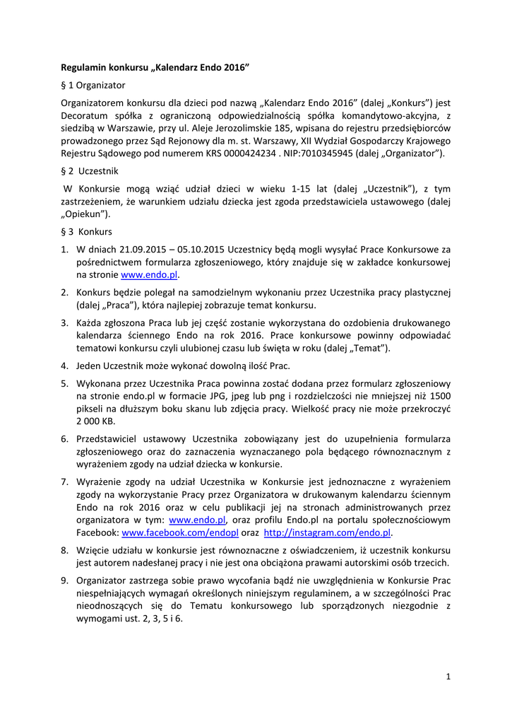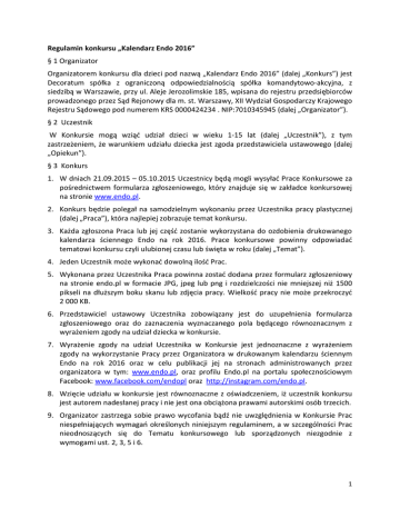 Regulamin konkursu „Kalendarz Endo 2016” § 1 Organizator Organizatorem konkursu dla dzieci pod nazwą „Kalendarz Endo 2016” (dalej „Konkurs”) jest Decoratum spółka z ograniczoną odpowiedzialnością spółka komandytowo-akcyjna, z siedzibą w Warszawie, przy ul. Aleje Jerozolimskie 185, wpisana do rejestru przedsiębiorców prowadzonego przez Sąd Rejonowy dla m. st. Warszawy, XII Wydział Gospodarczy Krajowego Rejestru Sądowego pod numerem KRS 0000424234 . NIP:7010345945 (dalej „Organizator”). § 2 Uczestnik W Konkursie mogą wziąć udział dzieci w wieku 1-15 lat (dalej „Uczestnik”), z tym zastrzeżeniem, że warunkiem udziału dziecka jest zgoda przedstawiciela ustawowego (dalej „Opiekun”). § 3 Konkurs 1. W dniach 21.09.2015 – 05.10.2015 Uczestnicy będą mogli wysyłać Prace Konkursowe za pośrednictwem formularza zgłoszeniowego, który znajduje się w zakładce konkursowej na stronie www.endo.pl. 2. Konkurs będzie polegał na samodzielnym wykonaniu przez Uczestnika pracy plastycznej (dalej „Praca”), która najlepiej zobrazuje temat konkursu. 3. Każda zgłoszona Praca lub jej część zostanie wykorzystana do ozdobienia drukowanego kalendarza ściennego Endo na rok 2016. Prace konkursowe powinny odpowiadać tematowi konkursu czyli ulubionej czasu lub święta w roku (dalej „Temat”). 4. Jeden Uczestnik może wykonać dowolną ilość Prac. 5. Wykonana przez Uczestnika Praca powinna zostać dodana przez formularz zgłoszeniowy na stronie endo.pl w formacie JPG, jpeg lub png i rozdzielczości nie mniejszej niż 1500 pikseli na dłuższym boku skanu lub zdjęcia pracy. Wielkość pracy nie może przekroczyć 2 000 KB. 6. Przedstawiciel ustawowy Uczestnika zobowiązany jest do uzupełnienia formularza zgłoszeniowego oraz do zaznaczenia wyznaczanego pola będącego równoznacznym z wyrażeniem zgody na udział dziecka w konkursie. 7. Wyrażenie zgody na udział Uczestnika w Konkursie jest jednoznaczne z wyrażeniem zgody na wykorzystanie Pracy przez Organizatora w drukowanym kalendarzu ściennym Endo na rok 2016 oraz w celu publikacji jej na stronach administrowanych przez organizatora w tym: www.endo.pl, oraz profilu Endo.pl na portalu społecznościowym Facebook: www.facebook.com/endopl oraz http://instagram.com/endo.pl. 8. Wzięcie udziału w konkursie jest równoznaczne z oświadczeniem, iż uczestnik konkursu jest autorem nadesłanej pracy i nie jest ona obciążona prawami autorskimi osób trzecich. 9. Organizator zastrzega sobie prawo wycofania bądź nie uwzględnienia w Konkursie Prac niespełniających wymagań określonych niniejszym regulaminem, a w szczególności Prac nieodnoszących się do Tematu konkursowego lub sporządzonych niezgodnie z wymogami ust. 2, 3, 5 i 6. 1 10. Organizator zastrzega sobie prawo do moderowania treści zamieszczanych przez użytkowników, w tym usuwania publikacji niespełniających warunków regulaminu, treści obraźliwych, powtarzających się lub bardzo podobnych fotografii. § 4 Wybór Prac 1. W okresie 06.10.2015 – 16.10.2015 r. Organizator dokona weryfikacji przesłanych na Konkurs Prac, spośród których wszystkie zaakceptowane Prace lub ich części zostaną wykorzystane w projekcie drukowanego kalendarza. 2. Uczestnicy zostaną poinformowani o sprzedaży kalendarza ściennego Endo 2016 za pośrednictwem e-maila, podanego przy rejestracji. § 5 Nagrody 1. Nagrodą w konkursie jest wykorzystanie pracy plastycznej w projekcie drukowanego kalendarza ściennego Endo na 2016 rok. § 6 Dane osobowe 1. Administratorem danych osobowych Uczestnika oraz Opiekuna, podawanych w związku z Konkursem, jest Organizator. Dane osobowe przetwarzane będą przez Organizatora w celu przeprowadzenia Konkursu. 2. Przetwarzanie danych osobowych obejmuje następującym zakres danych osobowych: imię i nazwisko, adres e-mail, wiek oraz dodatkowo kontaktowy numer telefonu. 3. Podanie danych osobowych jest dobrowolne, aczkolwiek niezbędne do uczestniczenia w Konkursie. 4. Przetwarzanie danych osobowych odbywać się będzie na zasadach przewidzianych ustawą z dnia 29 sierpnia 1997 r. o ochronie danych osobowych (Dz. U. 2002 Nr 101, poz. 926 z późn. zm.), zaś osobie której dane są przetwarzane przysługuje prawo dostępu do danych i ich poprawiania. § 7 Reklamacje 1. Wszelkie reklamacje dotyczące przebiegu Konkursu mogą być składane przez przedstawicieli ustawowych Uczestników w formie pisemnej, listem poleconym przesłanym na adres Organizatora w terminie do dnia 20.10.2015 r. 2. Reklamacje powinny zawierać imię i nazwisko Uczestnika i jego przedstawiciela ustawowego, dokładny adres korespondencyjny oraz opis i wskazanie przyczyn reklamacji, a także określenie żądania. 3. Reklamacje złożone po upływie terminu lub nie spełniające wymogów, określonych w ust. 2, nie będą rozpatrywane przez Organizatora. O zachowaniu terminu złożenia reklamacji decyduje data stempla pocztowego. 4. Reklamacje będą rozpatrywane bez zbędnej zwłoki, jednakże nie później niż w terminie 14 dni od daty otrzymania reklamacji. Decyzje Organizatora dotyczące reklamacji są ostateczne. § 8 Postanowienia końcowe 1. Pełna treść niniejszego regulaminu dostępna będzie na stronie www.endo.pl. 2 2. Konkurs ogłaszany i organizowany jest przez Organizatora za pośrednictwem Strony internetowej www.endo.pl oraz portalu społecznościowego Facebook: www.facebook.com/endopl oraz http://instagram.com/endo.pl 3. Wszelkie ewentualne spory lub roszczenia podnoszone w związku z Konkursem rozstrzygane będą przez sąd powszechny właściwy ze względu na siedzibę Organizatora. 4. W sprawach nieuregulowanych niniejszym regulaminem zastosowanie znajdują powszechnie obowiązujące przepisy prawa, a w szczególności kodeksu cywilnego. 3