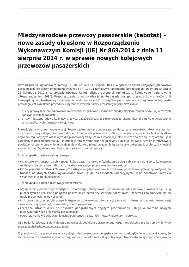 Międzynarodowe przewozy pasażerskie (kabotaż) – nowe zasady określone w Rozporządzeniu Wykonawczym Komisji (UE) Nr 869/2014 z dnia 11 sierpnia 2014 r. w sprawie nowych kolejowych przewozów pasażerskich Rozporządzenie Wykonawcze Komisji (UE) 869/2014 z 11 sierpnia 2014 r. w sprawie nowych kolejowych przewozów pasażerskich jest aktem implementacyjnym do art. 10 i 11 Dyrektywy Parlamentu Europejskiego i Rady 2012/34/UE z 21 listopada 2012 r. w sprawie utworzenia jednolitego europejskiego obszaru kolejowego (dalej zwane „Rozporządzeniem 869”). Rozporządzenie to wprowadza jednolite zasady dostępu przewoźników z krajów Unii Europejskiej do infrastruktury kolejowej na terytorium całej UE. Szczegółowym przedmiotem uregulowania tego aktu prawnego jest określenie procedury i kryteriów, których należy przestrzegać przy określaniu: 1. a) czy głównym celem przewozów kolejowych jest przewóz pasażerów między stacjami znajdującymi się w różnych państwach członkowskich; 2. b) czy międzynarodowy kolejowy przewóz pasażerski zagraża równowadze ekonomicznej umowy o świadczenie usług publicznych transportu kolejowego. Przewidziana wspomnianym wyżej Rozporządzeniem procedura przewiduje, że przewoźnik, który ma zamiar uruchomić nową usługę międzynarodowych kolejowych przewozów osób musi najpierw zgłosić ten fakt wszystkim organom regulacyjnym właściwym dla planowanej trasy. Zakres informacji jakie muszą znaleźć się w zgłoszeniu jest określony w Rozporządzeniu 869. Informacje tam zawarte organ regulacyjny publikuje na swojej stronie internetowej i powiadamia strony uprawnione do złożenia wniosku o przeprowadzenie badania celu głównego i, osobno, równowagi ekonomicznej. Zgodnie z ww. Rozporządzeniem stronami tymi są: 1. w przypadku badania celu głównego: ● ● organizatorzy transportu publicznego, którzy zawarli umowy o świadczenie usług publicznych transportu kolejowego na danym obszarze geograficznym, na które ma wpływ proponowana nowa usługa; każde przedsiębiorstwo kolejowe prowadzące międzynarodowe lub krajowe pasażerskie przewozy kolejowe na trasach, na których będzie wykonywana nowa usługa, na zasadach komercyjnych lub na podstawie umowy o świadczenie usług publicznych. 1. w przypadku badania równowagi ekonomicznej: ● ● ● ● organizatorzy publicznego transportu zbiorowego, którzy zawarli co najmniej jedną umowę o świadczenie usług publicznych na realizację połączeń pasażerskich pomiędzy stacjami początkową i końcową znajdującymi się na trasie proponowanej nowej usługi; inni organizatorzy publicznego transportu zbiorowego, którzy wykażą swój interes w badaniu równowagi ekonomicznej zgłoszonej nowej usługi międzynarodowej; zarządca infrastruktury na obszarze geograficznym objętym proponowaną usługą w zakresie nowych międzynarodowych przewozów pasażerskich; operatorzy umów o świadczenie usług publicznych, o których mowa w pierwszym punkcie. Oba badania odbywają się wyłącznie na wniosek podmiotu uprawnionego. Organ regulacyjny nie jest uprawniony do prowadzenia takiego badania z urzędu. Ciężar dowodu, że planowana nowa usługa międzynarodowa nie spełnia wymogu celu głównego oraz wykazanie, że zagraża ona równowadze ekonomicznej umowy o świadczenie usług publicznych transportu kolejowego spoczywa na 1 stronach uprawnionych do wnioskowania o przeprowadzenie badania. Cel główny uważa się za spełniony jeżeli ponad 50% wartości lub wielkości przewozu będzie między stacjami znajdującymi się w różnych krajach członkowskich. Jednak w toku analizy badane są także inne elementy wskazane w tym rozporządzeniu. Równowagę ekonomiczną umowy o świadczenie usług publicznych transportu kolejowego uważa się za zagrożoną, gdy proponowana nowa usługa ma znaczący negatywny wpływ na: ● ● rentowność usług świadczonych w ramach umowy o świadczenie usług publicznych; lub koszty netto wynikające z umowy o świadczenie usług publicznych ponoszone przez organizatora publicznego transportu zbiorowego. Rozporządzenie 869 przewiduje zakres informacji, jakie powinny znaleźć się w każdym z powyższych wniosków składanych przez podmioty do tego uprawnione oraz terminy w jakich każda z czynności powinna być wykonana. Strony umów o świadczenie usług publicznych, zarządca infrastruktury i przedsiębiorstwo kolejowe aplikujące o uzyskanie dostępu są uprawnione do wystąpienia o ponowne rozpatrzenie decyzji będącej wynikiem badania równowagi. Warunki, których spełnienie jest konieczne do wystąpienia o ponowne rozpatrzenie decyzji to: ● ● ● występowanie znaczącej zmiany w nowych międzynarodowych przewozach pasażerskich w porównaniu z danymi analizowanymi przez organ regulacyjny; lub występowanie zasadniczej różnicy pomiędzy rzeczywistym i szacowanym wpływem na usługi w ramach umowy o świadczenie usług publicznych; lub wygaśnięcie umowy o świadczenie usług publicznych przed początkowo wyznaczonym terminem. Prezes UTK ma prawo wprowadzić opłatę za badanie celu głównego, równowagi ekonomicznej i ponowne rozpatrzenie decyzji. Opłatę taką wnosiłyby podmioty uprawnione do złożenia wniosku o przeprowadzenie takiego badania. Zgodnie z postanowieniem Rozporządzenia 869, stronom postępowania będzie przysługiwało odwołanie od decyzji Prezesa UTK zgodnie z prawem krajowym. Akty prawne: Dyrektywa Parlamentu Europejskiego i Rady 2012/34/UE z dnia 21 listopada 2012 r. w sprawie utworzenia jednolitego europejskiego obszaru kolejowego Rozporządzenie Wykonawcze Komisji (UE) NR 869/2014 z dnia 11 sierpnia 2014 r. w sprawie nowych kolejowych przewozów pasażerskich 2