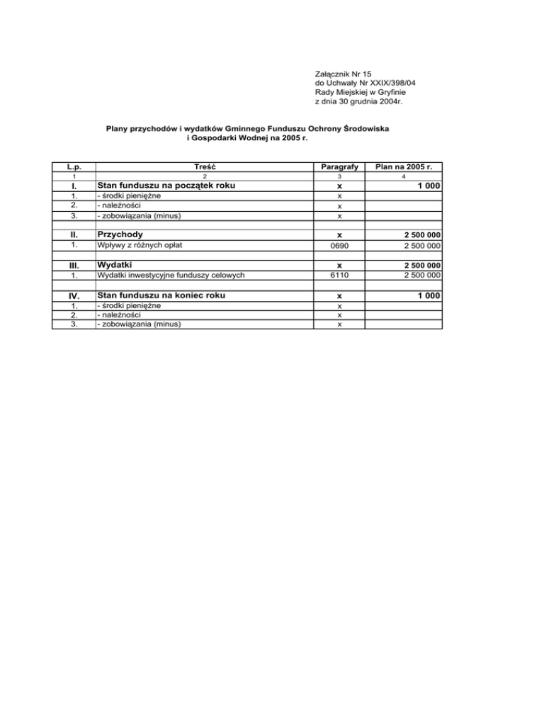 Załącznik Nr 15 do Uchwały Nr XXIX/398/04 Rady Miejskiej w Gryfinie z dnia 30 grudnia 2004r. Plany przychodów i wydatków Gminnego Funduszu Ochrony Środowiska i Gospodarki Wodnej na 2005 r. L.p. Treść Paragrafy Plan na 2005 r. 1 2 3 4 I. Stan funduszu na początek roku x 1. 2. 3. - środki pieniężne - należności - zobowiązania (minus) x x x II. Przychody 1. Wpływy z różnych opłat III. Wydatki 1. Wydatki inwestycyjne funduszy celowych x 0690 x 6110 IV. Stan funduszu na koniec roku x 1. 2. 3. - środki pieniężne - należności - zobowiązania (minus) x x x 1 000 2 500 000 2 500 000 2 500 000 2 500 000 1 000
