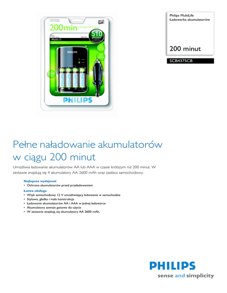 Philips MultiLife Ładowarka akumulatorów 200 minut SCB4375CB Pełne naładowanie akumulatorów w ciągu 200 minut Umożliwia ładowanie akumulatorów AA lub AAA w czasie krótszym niż 200 minut. W zestawie znajdują się 4 akumulatory AA 2600 mAh oraz zasilacz samochodowy. Najlepsza wydajność • Ochrona akumulatorów przed przeładowaniem Łatwa obsługa • Wtyk samochodowy 12 V umożliwiający ładowanie w samochodzie • Stylowa, gładka i mała konstrukcja • Ładowanie akumulatorów AA i AAA w jednej ładowarce • Akumulatory zawsze gotowe do użycia • W zestawie znajdują się akumulatory AA 2600 mAh. SCB4375CB/12 Ładowarka akumulatorów 200 minut Dane techniczne Zalety produktu Zasilanie • Baterie w zestawie • Pojemność baterii: 2600 mAh • Zasilanie: 220–240 V Specyfikacja techniczna • Materiał obudowy: Tworzywo ABS Charakterystyka ekologiczna • Metale ciężkie: Bezkadmowe, Bezrtęciowy, Bezołowiowy • Materiały opakowaniowe: tworzywo PET • Rodzaj opakowania: Blister składany Wymiary • Wymiary blistra (SxGxW): 17 x 25 x 6 cm • Wymiary wewnętrzne kartonu (SxDxW): 17,7 x 27,2 x 19 cm • Ilość szt. w opakowaniu zbiorczym: 4 • Wymiary produktu (SxGxW): 12 x 7,5 x 2,35 cm • Waga produktu: 0,096 kg • Wtyk samochodowy 12 V Ładowarka jest wyposażona w specjalny adapter pasujący do gniazda zapalniczki samochodowej. Oznacza to, że ładowanie może odbywać się nie tylko w domowej sieci elektrycznej, ale także w podróży. Wyjątkowo mała konstrukcja Wyjątkowo stylowa i mała konstrukcja ułatwia podróż oraz uprzyjemnia korzystanie z ładowarki. Ładowanie akumulatorów AA i AAA Ładowarka umożliwia ładowanie akumulatorów AA i AAA. Inteligentna ochrona ładowania Specjalny czujnik wykrywa stan pełnego naładowania akumulatorów i przełącza ładowarkę w tryb powolnego ładowania, co pozwala utrzymać całkowicie naładowane akumulatory w gotowości do użycia. Ochrona przed przeładowaniem zwiększa żywotność akumulatorów i zapobiega ich uszkodzeniu. Powolne ładowanie Wszystkie akumulatory rozładowują się w miarę upływu czasu. Automatycznie uruchamiane powolne ładowanie pozwala na utrzymanie pełnej gotowości akumulatorów po umieszczeniu ich w ładowarce i podłączeniu do gniazdka elektrycznego. 2600 mAh MultiLife AA w zestawie Pojemność 2600 mAh pozwala na jeszcze dłuższe działanie aparatu cyfrowego i innych energochłonnych urządzeń. Data wydania 2008-04-04 © 2008 Koninklijke Philips Electronics N.V. Wszelkie prawa zastrzeżone. Wersja: 2.0.5 Dane techniczne mogą ulec zmianie bez powiadomienia. Znaki towarowe są własnością Koninklijke Philips Electronics N.V. lub własnością odpowiednich firm. 12 NC: 8670 000 28919 EAN: 87 12581 32919 8 www.philips.com