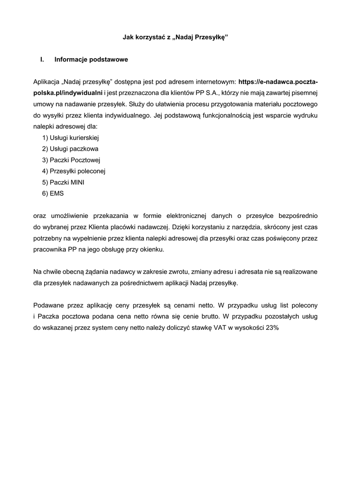 Jak korzystać z „Nadaj Przesyłkę” I. Informacje podstawowe Aplikacja „Nadaj przesyłkę” dostępna jest pod adresem internetowym: https://e-nadawca.pocztapolska.pl/indywidualni i jest przeznaczona dla klientów PP S.A., którzy nie mają zawartej pisemnej umowy na nadawanie przesyłek. Służy do ułatwienia procesu przygotowania materiału pocztowego do wysyłki przez klienta indywidualnego. Jej podstawową funkcjonalnością jest wsparcie wydruku nalepki adresowej dla: 1) Usługi kurierskiej 2) Usługi paczkowa 3) Paczki Pocztowej 4) Przesyłki poleconej 5) Paczki MINI 6) EMS oraz umożliwienie przekazania w formie elektronicznej danych o przesyłce bezpośrednio do wybranej przez Klienta placówki nadawczej. Dzięki korzystaniu z narzędzia, skrócony jest czas potrzebny na wypełnienie przez klienta nalepki adresowej dla przesyłki oraz czas poświęcony przez pracownika PP na jego obsługę przy okienku. Na chwile obecną żądania nadawcy w zakresie zwrotu, zmiany adresu i adresata nie są realizowane dla przesyłek nadawanych za pośrednictwem aplikacji Nadaj przesyłkę. Podawane przez aplikację ceny przesyłek są cenami netto. W przypadku usług list polecony i Paczka pocztowa podana cena netto równa się cenie brutto. W przypadku pozostałych usług do wskazanej przez system ceny netto należy doliczyć stawkę VAT w wysokości 23% II. Obsługa aplikacji Po uruchomieniu programu na ekranie pojawia się okno Profil Nadawcy (Rys. 1), który należy zasilić danymi nadawcy. Wypełnienie wszystkich wymaganych pól umożliwi korzystanie z aplikacji. Wymagane pola zaznaczone są kolorem czerwonym. Rys. 1. Okno Profil nadawcy po uruchomieniu Nadaj przesyłkę Po zakończeniu wprowadzania danych konieczne jest każdorazowe wprowadzenie żądanej przez system informacji do mechanizmu „Captcha”, w celu ich potwierdzenia. -2- Rys. 2. Okno po ustawieniu Profilu nadawcy W wymaganych polach formularza należy podać dziewięć cyfr numeru telefonu w sieci operatora krajowego z tym, że w przypadku numeru telefonu w sieci telefonii stacjonarnej należy podać numer telefonu wraz z numerem kierunkowym. Po wypełnieniu wszystkich wymaganych pozycji w oknie Profil nadawcy możliwe jest przejście do zakładki Nowa przesyłka, w której możliwe jest przygotowanie przesyłki do nadania (Rys. 3). -3- Rys. 3. Okno Nowa przesyłka W celu przygotowania nalepki adresowej i wysłania informacji do PP S.A. konieczne jest wybranie rodzaju usługi (Rys. 3a) ewentualnych usług komplementarnych oraz wypełnienia danych adresata (Rys. 4). -4- Rys. 3a. Okno Nowa przesyłka -5- Rys. 4. Okno Nowa przesyłka po wybraniu usługi i uzupełnieniu wymaganych pozycji Po zakończeniu wprowadzania danych przesyłki poprzez wybór przycisku „Pobierz nalepkę & Wyślij” albo „Pobierz książkę nadawczą” dokonuje się wysłanie danych do PP S.A. oraz wydruk nalepki adresowej albo książki nadawczej. Operacje te poprzedzone są pojawieniem się komunikatu potwierdzającego chęć pobrania nalepki adresowej/książki nadawczej i wysłania danych do UP (Rys.5). Plik nalepki adresowej/plik książki nadawczej może być otwarty lub zapisany (Rys. 6) do późniejszego wydruku (Rys. 7, Rys. 7a). -6- Rys. 5. Komunikat o przekazaniu danych do UP Rys. 6. Okno pobierania pliku PDF -7- Rys. 7. Widok nalepki adresowej Rys. 7a. Widok książki nadawczej Po wprowadzeniu danych o przesyłce i wyborze przycisku Dalej, wprowadzona przesyłka zostaje uwidoczniona w panelu Przesyłki znajdującym się po lewej stronie okna. Przesyłki do momentu wyboru przycisku „Pobierz nalepkę & Wyślij” albo „Pobierz książkę nadawczą” można dowolnie edytować. Po przekazaniu danych do UP możliwy jest wyłącznie podgląd wprowadzonej przesyłki (Rys. 8). -8- Rys. 8. Okno podglądu wprowadzonej przesyłki Po wypełnieniu wszystkich wymaganych pól i akceptacji ich zawartości Klient we własnym zakresie drukuje właściwą nalepkę adresową. Przesyłkę oraz nalepkę adresową Klient dostarcza do wskazanej przez siebie placówki pocztowej w terminie siedmiu dni, licząc od dnia dokonania wydruku nalepki adresowej. Przekroczenie terminu skutkować będzie usunięciem informacji z Nadaj Przesyłkę i brakiem możliwości nadania przesyłki przy zastosowaniu wydrukowanej nalepki adresowej. -9- III. Ogólne zasady użytkowania Klient ma obowiązek korzystania z Nadaj Przesyłkę zgodnie z powszechnie obowiązującymi przepisami prawa, w sposób nieutrudniający jej funkcjonowania, w tym poprzez użycie oprogramowań lub urządzeń niepowodujących zakłócenia pracy aplikacji lub jej uszkodzenia. Placówce pocztowej nadawczej przysługuje prawo do zmian treści nalepki adresowej w zakresie masy i opłaty przesyłki tak, aby jej treść była zgodna ze stanem faktycznym. Potwierdzeniem nadania przesyłki jest przekazanie Klientowi z Nadaj Przesyłkę raportu dziennego. Przekazanie następuje w dniu następnym po dniu nadania przesyłki drogą elektroniczną. Na żądanie Klienta, placówka pocztowa nadawcza dokonuje potwierdzenia nadania przesyłki, przy zastosowaniu odcinka nalepki adresowej. W tym celu Klient ma obowiązek dostarczyć dwa egzemplarze nalepki adresowej. Przy ponownym korzystaniu z funkcjonalności Nadaj przesyłkę system wykorzystuje mechanizm plików cookie dla ułatwienia procesu nadawania. Nieprawidłowości związane z funkcjonowaniem Nadaj Przesyłkę Klient winien przekazywać pocztą elektroniczną na adres: [email protected] W sprawach nieuregulowanych powyższymi zapisami mają zastosowanie przepisy powszechnie obowiązujące oraz regulaminy i cenniki Poczty Polskiej S.A. dotyczące usług pocztowych obsługiwanych przez funkcjonalność Nadaj przesyłkę. - 10 -