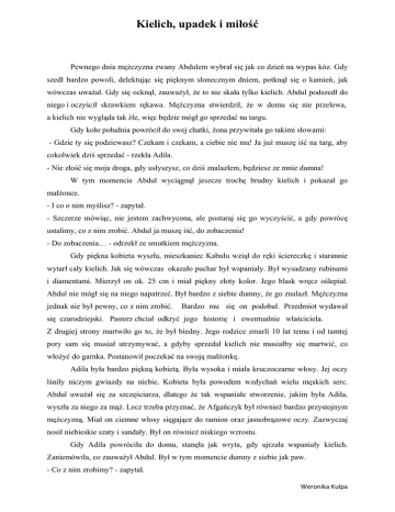 Kielich, upadek i miłość Pewnego dnia mężczyzna zwany Abdulem wybrał się jak co dzień na wypas kóz. Gdy szedł bardzo powoli, delektując się pięknym słonecznym dniem, potknął się o kamień, jak wówczas uważał. Gdy się ocknął, zauważył, że to nie skała tylko kielich. Abdul podszedł do niego i oczyścił skrawkiem rękawa. Mężczyzna stwierdził, że w domu się nie przelewa, a kielich nie wygląda tak źle, więc będzie mógł go sprzedać na targu. Gdy koło południa powrócił do swej chatki, żona przywitała go takimi słowami: - Gdzie ty się podziewasz? Czekam i czekam, a ciebie nie ma! Ja już muszę iść na targ, aby cokolwiek dziś sprzedać - rzekła Adila. - Nie złość się moja droga, gdy usłyszysz, co dziś znalazłem, będziesz ze mnie dumna! W tym momencie Abdul wyciągnął jeszcze trochę brudny kielich i pokazał go małżonce. - I co o nim myślisz? - zapytał. - Szczerze mówiąc, nie jestem zachwycona, ale postaraj się go wyczyścić, a gdy powrócę ustalimy, co z nim zrobić. Abdul ja muszę iść, do zobaczenia! - Do zobaczenia… - odrzekł ze smutkiem mężczyzna. Gdy piękna kobieta wyszła, mieszkaniec Kabulu wziął do ręki ściereczkę i starannie wytarł cały kielich. Jak się wówczas okazało puchar był wspaniały. Był wysadzany rubinami i diamentami. Mierzył on ok. 25 cm i miał piękny złoty kolor. Jego blask wręcz oślepiał. Abdul nie mógł się na niego napatrzeć. Był bardzo z siebie dumny, że go znalazł. Mężczyzna jednak nie był pewny, co z nim zrobić. Bardzo mu się on podobał. Przedmiot wydawał się czarodziejski. Pasterz chciał odkryć jego historię i ewentualnie właściciela. Z drugiej strony martwiło go to, że był biedny. Jego rodzice zmarli 10 lat temu i od tamtej pory sam się musiał utrzymywać, a gdyby sprzedał kielich nie musiałby się martwić, co włożyć do garnka. Postanowił poczekać na swoją małżonkę. Adila była bardzo piękną kobietą. Była wysoka i miała kruczoczarne włosy. Jej oczy lśniły niczym gwiazdy na niebie. Kobieta była powodem wzdychań wielu męskich serc. Abdul uważał się za szczęściarza, dlatego że tak wspaniałe stworzenie, jakim była Adila, wyszła za niego za mąż. Lecz trzeba przyznać, że Afgańczyk był również bardzo przystojnym mężczyzną. Miał on ciemne włosy sięgające do ramion oraz jasnobrązowe oczy. Zazwyczaj nosił niebieskie szaty i sandały. Był on również niskiego wzrostu. Gdy Adila powróciła do domu, stanęła jak wryta, gdy ujrzała wspaniały kielich. Zaniemówiła, co zauważył Abdul. Był w tym momencie dumny z siebie jak paw. - Co z nim zrobimy? - zapytał. Weronika Kulpa - Nie wiem - odparła kobieta z przysłoniętymi jakby mgłą oczami - najpierw zrobię kolację, a potem porozmawiamy. Abdul podszedł i położył przy desce do krojenia puchar. Adila zaczęła kroić cebulę, wtedy mimowolnie poleciały jej łzy z oczu. Jedna z nich wleciała do kielicha. Wtedy stało się coś, co odmieniło losy małżeństwa. Kielich rozbłysnął jak piec, gdy dorzucono do ognia kawałek drewna. Gdy mężczyzna zajrzał do niego, zauważył perłę, lecz niestety nie była ona tak piękna jak te, które są sprzedawane na targu. Perełka była malutka, koloru kremowego, lecz nie błyszczała. Para nie rozmawiała o tym, co się wydarzyło tego wieczoru, lecz każde z nich rozważało to w swoim sercu. Z dnia na dzień bywało coraz gorzej, ponieważ Abdul dwoił się i troił, aby z kielicha wydobyć wspaniałą perłę. Za pieniądze, które otrzymywał na targu za malutkie perełki, wynajmował ludzi i kazał im wymyślić coś, co mogło go przybliżyć do wyjaśnienia tajemnicy. Jego żona nie mogła tego znieść, ponieważ jej mąż nie zwracał prawie w ogóle na nią uwagi i nie powiedział jej jednej ważnej rzeczy. Więc pewnego dnia kobieta rzekła do Abdula: -Do widzenia Abdul! Wychodzę i raczej nie wrócę… -Adila! Czemu? Za co? Co się stało? -Jeżeli nie wiesz za co, to jesteś głupcem, a nie mężczyzną, za którego wyszłam. Do widzenia! Jak powiedziała, tak uczyniła. Teraz Abdul miał nowy problem, lecz dopiero wtedy zrozumiał, co zrobił nie tak. Dlatego dzień w dzień chodził za małżonką, kupował jej kwiaty, śpiewał serenady, lecz to nic nie pomagało. Kobieta była nieugięta. Gdy pewnego dnia wrócił do domu, usiadł na krześle i dopiero wtedy spostrzegł, że bez Adily nie ma niczego. Wtem olśniło go! Wsadził kielich pod szatę, aby nikt go nie ukradł i pobiegł jak najprędzej do domu, gdzie przebywała piękna kobieta i rzekł: -Kocham cię! Gdy kobieta usłyszała te słowa, rzuciła mu się na szyję i zaszlochała: - Właśnie o to mi chodziło! Też cię kocham, Abdul! Gdy jedna łza skapnęła do kielicha, zaświeciła się i wydobyła się z niego piękna, duża, błyszcząca perła. Okazało się, że kielich daje takie piękne perełki tylko wtedy, gdy wpadnie do niego łza miłości. Od tamtej pory Abdul i Alida żyli w dostatku, ale używali perły tylko w razie potrzeby. Weronika Kulpa, klasa I a Weronika Kulpa