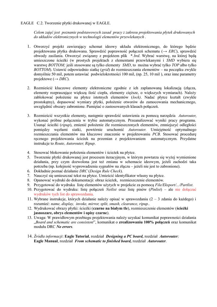 EAGLE C.2. Tworzenie płytki drukowanej w EAGLE. Celem zajęć jest poznanie podstawowych zasad pracy z zakresu projektowania płytek drukowanych do układów elektronicznych w technologii elementów przewlekanych . 1. Otworzyć projekt zawierający schemat ideowy układu elektronicznego, do którego będzie projektowana płytka drukowana. Sprawdzić poprawność połączeń schematu (→ ERC), sprawdzić obwody zasilania. Otworzyć związany z projektem plik *.brd. Wybrać warstwę, na której będą umieszczone ścieżki (w prostych projektach z elementami przewlekanymi i SMD wybiera się warstwę BOTTOM; jeśli stosowane są tylko elementy SMD, to można wybrać tylko TOP albo tylko BOTTOM). Ustawić odpowiednio siatkę (grid) do rozmieszczania elementów – na początku zwykle domyślnie 50 mil, potem ustawiać podwielokrotności 100 mil, (np. 25, 10 mil ), oraz inne parametry projektowe (→ DRC). 2. Rozmieścić kluczowe elementy elektroniczne zgodnie z ich zaplanowaną lokalizacją (złącza, elementy rozpraszające większą ilość ciepła, elementy cięższe, o większych wymiarach). Należy zablokować położenie na płytce istotnych elementów (lock). Nadać płytce kształt (zwykle prostokątny), dopasować wymiary płytki, położenie otworów do zamocowania mechanicznego, uwzględnić obszary zabronione. Pamiętać o zastosowanych klasach połączeń. 3. Rozmieścić wszystkie elementy, następnie sprawdzić ustawienia za pomocą narzędzia Autorouter, wykonać próbne połączenia w trybie automatycznym. Przeanalizować wyniki pracy programu. Usunąć ścieżki (ripup), zmienić położenie źle rozmieszczonych elementów, zmniejszyć odległości pomiędzy węzłami siatki, powtórnie uruchomić Autorouter. Umiejętność optymalnego rozmieszczania elementów ma kluczowe znaczenie w projektowaniu PCB. Stosować procedurę ręcznego projektowania ścieżek na przemian z projektowaniem automatycznym. Przydatne instrukcje to Route, Autorouter, Ripup. 4. Stosować blokowanie położenia elementów i ścieżek na płytce. 5. Tworzenie płytki drukowanej jest procesem iteracyjnym, w którym powtarza się wyżej wymienione działania, przy czym dozwolona jest też zmiana w schemacie ideowym, jeżeli zachodzi taka potrzeba (np. kolejność wyprowadzenia sygnałów na złączu – jeżeli nie jest to zabronione). 6. Dokładnie poznać działanie DRC (Design Rule Check). 7. Nauczyć się umieszczać tekst na płytce. Umieścić identyfikator własny na płytce. 8. Opanować wydruki do dokumentacji: obraz ścieżek, rozmieszczenie elementów. 9. Przygotować do wydruku listę elementów użytych w projekcie za pomocą File/Eksport/.../Partlist. 10. Przygotować do wydruku: listę połączeń Netlist oraz listę pinów (Pinlist) – ale nie dołączać wydruków tych list do sprawozdania. 11. Wybrane instrukcje, których działanie należy opisać w sprawozdaniu (2 – 3 zdania do każdego) i rozumieć: name, display, invoke, mirror, split, smash, clearance, ripup.. 12. Wydrukować obrazy płytki: ścieżki (czarne na białym tle), rozmieszczenie elementów (ścieżki jasnoszare, obrys elementów i opisy czarne). 13. Uwaga: W prawidłowym przebiegu projektowania należy uzyskać komunikat poprawności działania „Board and schematic are consistent”, komunikat o zrealizowaniu 100% połączeń oraz komunikat modułu DRC No errors. 14. Źródła informacji: Eagle Tutorial, rozdział Designing a PC board, rozdział Autorouter; Eagle Manual, rozdział From schematic to finished board, rozdział Autorouter.