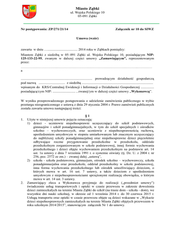 Miasto Ząbki ul. Wojska Polskiego 10 05-091 Ząbki Nr postępowania: ZP/271/21/14 Załącznik nr 10 do SIWZ Umowa (wzór) zawarta w dniu ….................................. 2014 roku w Ząbkach pomiędzy: Miastem Ząbki z siedzibą w 05–091 Ząbki ul. Wojska Polskiego 10, posiadającym NIP: 125-133-22-95, zwanym w dalszej części umowy „Zamawiającym”, reprezentowanym przez: ……………………………….………………………………………………………………………..…………… a ................................................................................. prowadzącym działalność gospodarczą pod nazwą .............................. z siedzibą ................................................................................. wpisanym do KRS/Centralnej Ewidencji i Informacji o Działalności Gospodarczej ............... posiadającą/cym NIP: .......................... , zwanej/ym w dalszej części umowy „Wykonawcą”. W wyniku przeprowadzonego postępowania o udzielenie zamówienia publicznego w trybie przetargu nieograniczonego z ustawą z dnia 29 stycznia 2004 r. Prawo zamówień publicznych została zawarta umowa następującej treści: 1. 2. §1 Użyte w niniejszej umowie pojęcia oznaczają: 1) dzieci - uczniowie niepełnosprawni uczęszczający do szkół podstawowych, gimnazjów i szkół ponadgimnazjalnych, w tym do szkół specjalnych i ośrodków szkolno – wychowawczych, oraz uczniowie z niepełnosprawnością ruchową, upośledzeniem umysłowym w stopniu umiarkowanym lub znacznym uczęszczający do najbliższej szkoły ponadgimnazjalnej oraz niepełnosprawne dzieci pięcioletnie odbywające roczne przygotowanie przedszkolne w przedszkolu, oddziale przedszkolnym zorganizowanym w szkole podstawowej, innej formie wychowania przedszkolnego i dzieci objęte wychowaniem przedszkolnym na podstawie art. 14 ust. 1a ustawy z dnia 7 września 1991 r. o systemie oświaty (tj. Dz. U. z 2004 r. nr 256, poz. 2572 ze zm.) – zwanej dalej „ustawą”, 2) szkoła - szkoła podstawowa, gimnazjum, ośrodek szkolno – wychowawczy, szkoła ponadgimnazjalna oraz przedszkole, oddział przedszkolny w szkole podstawowej, inna forma wychowania przedszkolnego lub ośrodek umożliwiający dzieciom, o których mowa w art. 16 ust. 7 ustawy, a także dzieciom z upośledzeniem umysłowym z niepełnosprawnościami sprzężonymi realizację obowiązku, o którym mowa w art. 14 ust. 3 ustawy. Zamawiający zleca a Wykonawca przyjmuje do realizacji („przedmiot umowy”) świadczenie usług transportowych i opieki w czasie przewozu w zakresie dowożenia dzieci zamieszkałych na terenie Miasta Ząbki do szkół (na trasie dom - szkoła - dom), we wszystkie dni nauki szkolnej, w okresie od 1 września 2014 r. do 30 czerwca 2015 r. Usługą transportu oraz opieki w czasie przewozu objęte są dzieci wskazane w „Wykazie dzieci niepełnosprawnych zamieszkałych na terenie Miasta Ząbki objętych przewozem w roku szkolnym 2014/2015”, stanowiącym załącznik Nr 1 do umowy. Miasto Ząbki ul. Wojska Polskiego 10 05-091 Ząbki 3. Wykonawca w ramach realizacji umowy zobowiązany jest w szczególności: 1) zapewnić przewóz dzieci przystosowanymi do tego celu pod względem technicznym samochodami, które będą: a) odpowiednio oznakowane, zgodnie z art. 58 ust. 1 ustawy z dnia 20 czerwca 1997 r. Prawo o ruchu drogowym (Dz. U. z 2012 r. poz. 1137 z późn. zm.), b) umożliwiać dotarcie opiekuna do dziecka potrzebującego pomocy podczas jazdy, c) specjalnie przystosowane do przewozu osób niepełnosprawnych, tzn. wyposażone w specjalistyczny sprzęt: szyny do mocowania wózków dla osób niepełnosprawnych oraz windy umożliwiające wjazd wózkiem z osobą niepełnosprawną do samochodu, d) posiadać atestowane pasy zaczepne do mocowania wózków inwalidzkich, e) wyposażone w foteliki samochodowe dostosowane do wieku i wzrostu dziecka, f) posiadać komplet pasów bezpieczeństwa dla wszystkich niepełnosprawnych dzieci, g) miały otwierane bądź uchylne szyby boczne, chyba że samochód posiada funkcję klimatyzacji, h) wyprodukowane w roku 2006 lub później, i) zgłoszone do aktualnej licencji na wykonywanie krajowego transportu drogowego osób, j) sprawne technicznie, utrzymywane w porządku i czystości oraz posiadające przez cały okres obowiązywania umowy ważne badania techniczne, 2) zapewnić zatrzymanie samochodów w miejscu możliwie najbliższym budynkowi, w którym zamieszkuje przewożone dziecko niepełnosprawne oraz w miejscu możliwie najbliższym szkole, 3) poinformować rodziców o miejscu postoju samochodu, 4) zapewnić dla przewożonych dzieci opiekunów, którzy są zobowiązani: a) odbierać dzieci od rodziców/opiekunów spod domu i po odwiezieniu na zajęcia przekazywać pod opiekę pracownikom szkół, b) po odebraniu dzieci od rodziców/opiekunów - pomagać dzieciom w przemieszczeniu się do/od samochodu, c) pomóc w zdjęciu lub zdjąć z dzieci zewnętrzne ubrania w celu zapobiegnięciu pocenia się dzieci w trakcie dowożenia, w szczególności w przypadku włączenia w samochodzie ogrzewania, d) zapewnić opiekę przewożonym dzieciom oraz w przypadku takiej potrzeby pierwszą pomoc, e) po zakończeniu zajęć - odbierać dzieci od pracowników szkół i po odwiezieniu pod dom przekazywać pod opiekę rodziców/opiekunów, 5) zapewnić dla opiekunów dzieci telefony komórkowe dostępne dla rodziców dowożonych dzieci, dyrektorów szkół, do których dowozi się dzieci, lub jego upoważnionych przedstawicieli oraz dla Zamawiającego, 6) przed przystąpieniem do realizacji usługi opracować w ciągu 7 dni od zawarcia umowy – w oparciu o ustalenia z rodzicami/opiekunami prawnymi dowożonych dzieci – godzinowy rozkład jazdy z podziałem na samochody, mając na uwadze jak najkrótszy czas przebywania dziecka w podróży (do 1,5 h) i z uwzględnieniem następujących założeń: a) dziecko powinno być dowiezione do szkoły