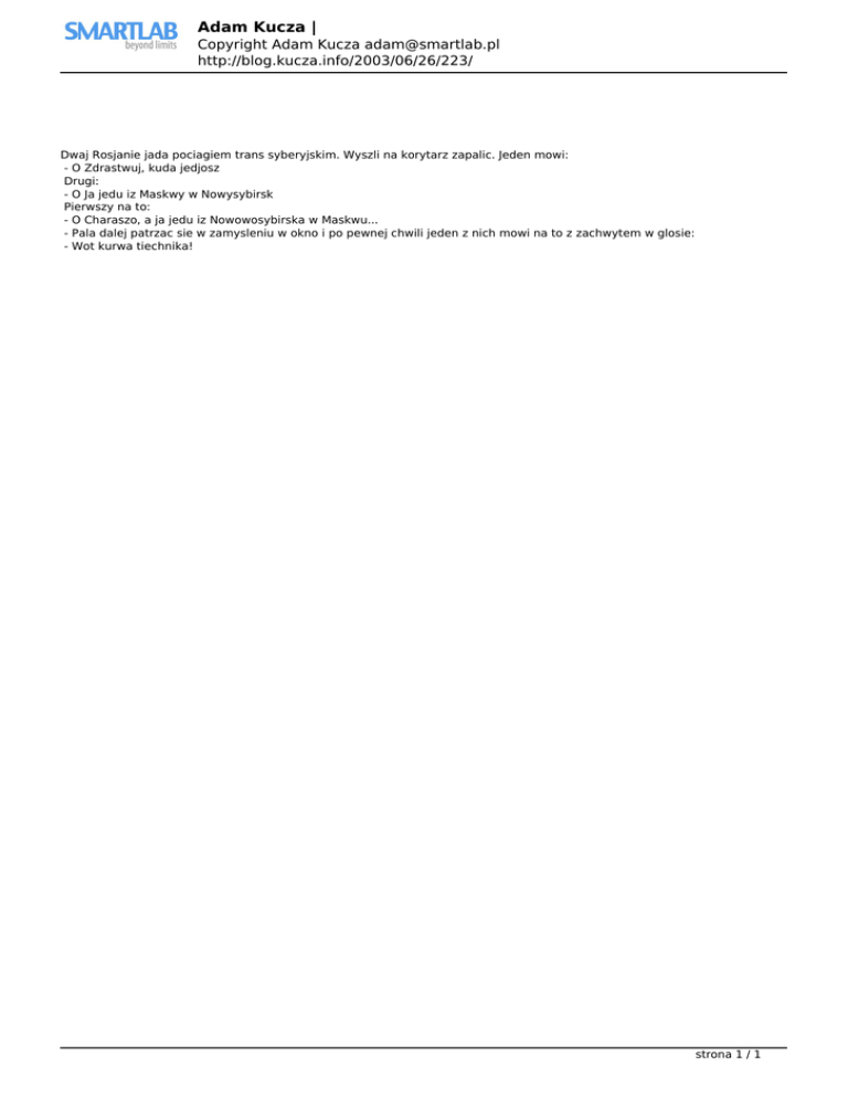 Adam Kucza | Copyright Adam Kucza [email protected] http://blog.kucza.info/2003/06/26/223/ Dwaj Rosjanie jada pociagiem trans syberyjskim. Wyszli na korytarz zapalic. Jeden mowi: - O Zdrastwuj, kuda jedjosz Drugi: - O Ja jedu iz Maskwy w Nowysybirsk Pierwszy na to: - O Charaszo, a ja jedu iz Nowowosybirska w Maskwu... - Pala dalej patrzac sie w zamysleniu w okno i po pewnej chwili jeden z nich mowi na to z zachwytem w glosie: - Wot kurwa tiechnika! strona 1 / 1
