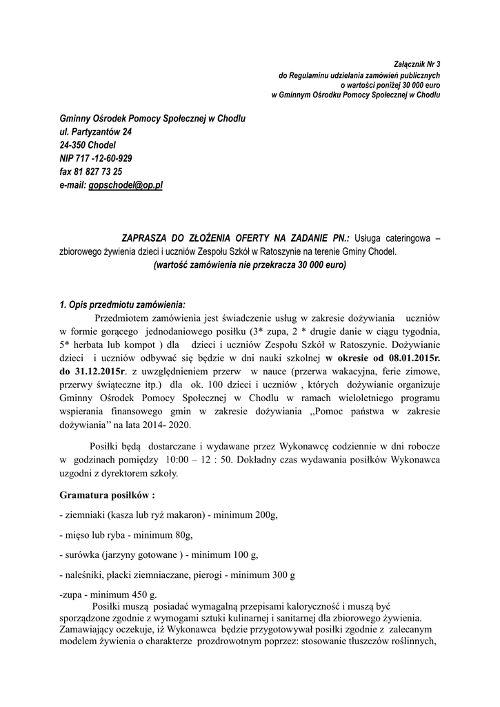 Załącznik Nr 3 do Regulaminu udzielania zamówień publicznych o wartości poniżej 30 000 euro w Gminnym Ośrodku Pomocy Społecznej w Chodlu Gminny Ośrodek Pomocy Społecznej w Chodlu ul. Partyzantów 24 24-350 Chodel NIP 717 -12-60-929 fax 81 827 73 25 e-mail: [email protected] ZAPRASZA DO ZŁOŻENIA OFERTY NA ZADANIE PN.: Usługa cateringowa – zbiorowego żywienia dzieci i uczniów Zespołu Szkół w Ratoszynie na terenie Gminy Chodel. (wartość zamówienia nie przekracza 30 000 euro) 1. Opis przedmiotu zamówienia: Przedmiotem zamówienia jest świadczenie usług w zakresie dożywiania uczniów w formie gorącego jednodaniowego posiłku (3* zupa, 2 * drugie danie w ciągu tygodnia, 5* herbata lub kompot ) dla dzieci i uczniów Zespołu Szkół w Ratoszynie. Dożywianie dzieci i uczniów odbywać się będzie w dni nauki szkolnej w okresie od 08.01.2015r. do 31.12.2015r. z uwzględnieniem przerw w nauce (przerwa wakacyjna, ferie zimowe, przerwy świąteczne itp.) dla ok. 100 dzieci i uczniów , których dożywianie organizuje Gminny Ośrodek Pomocy Społecznej w Chodlu w ramach wieloletniego programu wspierania finansowego gmin w zakresie dożywiania ,,Pomoc państwa w zakresie dożywiania’’ na lata 2014- 2020. Posiłki będą dostarczane i wydawane przez Wykonawcę codziennie w dni robocze w godzinach pomiędzy 10:00 – 12 : 50. Dokładny czas wydawania posiłków Wykonawca uzgodni z dyrektorem szkoły. Gramatura posiłków : - ziemniaki (kasza lub ryż makaron) - minimum 200g, - mięso lub ryba - minimum 80g, - surówka (jarzyny gotowane ) - minimum 100 g, - naleśniki, placki ziemniaczane, pierogi - minimum 300 g -zupa - minimum 450 g. Posiłki muszą posiadać wymagalną przepisami kaloryczność i muszą być sporządzone zgodnie z wymogami sztuki kulinarnej i sanitarnej dla zbiorowego żywienia. Zamawiający oczekuje, iż Wykonawca będzie przygotowywał posiłki zgodnie z zalecanym modelem żywienia o charakterze prozdrowotnym poprzez: stosowanie tłuszczów roślinnych, ograniczone stosowanie tłuszczów zwierzęcych, stosowanie mięsa drobiowego, umiarkowane stosowanie jaj, cukru i soli, udział warzyw w posiłkach, w tym nasion strączkowych. Zamawiający nie dopuszcza ,ażeby w ciągu tygodnia ( 5 dni) wystąpiła powtarzalność tego samego rodzaju posiłku. Wykonawca jest zobowiązany wykonać usługę cateringową zgodnie z wymogami ustawy z dnia 25 sierpnia 2006 roku o bezpieczeństwie żywności i żywienia (Dz. U. z 2010 r., Nr 136, poz. 914 z późn. zm.). Wykonawca jest zobowiązany spełniać warunki zgodnie z instrukcją dobrej praktyki higienicznej i produkcyjnej oraz systemem HACCAP oraz ponosi pełną odpowiedzialność za ich przestrzeganie. Posiłki powinny być przewożone w termosach gastronomicznych zapewniających utrzymanie temperatury spożywania potraw oraz posiadających odpowiednie atesty Państwowego Zakładu Higieny lub innych pojemnikach, naczyniach o analogicznych właściwościach. Posiłki wykonawca będzie dostarczać na własny koszt specjalistycznym transportem, zgodnie z wymogami ustawy z dnia 25 sierpnia 2006 roku o bezpieczeństwie żywności i żywienia (Dz. U. z 2010 r., Nr 136, poz. 914 z późn. zm.). Wykonawca ponosi także koszty załadunku i rozładunku wszystkich dostaw. Dla potrzeb badań żywności przez Sanepid codziennie muszą być dostarczone próbki po 150g, każdej składowej części potrawy w tym zup , mięs, potraw mięsnych i rybnych, jarzyn gotowanych, sosów, potraw mącznych lub mlecznych, sałatek, surówek , wyrobów garmażeryjnych, wędlin i wyrobów wędliniarskich ( w jednym kawałku), zgodnie z § 3 Rozporządzenia Ministra Zdrowia z dnia 17 kwietnia 2007 r. w sprawie pobierania i przechowywania próbek żywności przez zakłady żywienia zbiorowego typu zamkniętego ( Dz. U. Nr 80, poz.545) Ekspedycja i spożywanie posiłków odbywały się będą na terenie Zespołu Szkół w Ratoszynie. Przed rozpoczęciem działalności Wykonawca dokona dostosowania pomieszczeń ( wymogów Państwowego Powiatowego Inspektora Sanitarnego oraz uzyskania w /w stosowanej zgody na prowadzenie działalności gastronomicznej , także na dopuszczenie do pracy w kuchni i stołówce personelu (personel przygotowujący posiłki musi posiadać ważne książeczki do celów sanitarno-epidemiologicznych).Po zakończeniu działalności dokona zwrotu użytkowanych pomieszczeń w stanie niepogorszonym uwzględniającym warunki normalnego zużycia. Wykonawcy nie przysługuje roszczenie zwrotu nakładów poniesionych na adaptację pomieszczeń w celu przystosowania ich do realizacji niniejszej umowy. Ceny pakietu obiadowego będą niezmienne przez cały okres obowiązania umowy. Cena posiłków winna zawierać również koszt dowozu posiłków do placówki oraz koszt naczyń i sztućców w przypadku cateringu naczyń i sztućców jednorazowych. W ramach wykonanej usługi Wykonawca zadba o wydanie, asystowanie podasz konsumpcji posiłków oraz czystość pomieszczeń w których wydawane i spożywanie będą posiłki. Wykonawca na własny koszt dokona odbioru zużytych naczyń jednorazowych i resztek po posiłkach . Ilość sporządzanych i dostarczanych dziennie posiłków do w/w szkoły może ulegać zmianie ( zwiększeniu lub zmniejszeniu) stosowanie do liczby uczniów objętych pomocą w formie dożywiana. O każdej dziennej zmianie co do ilości posiłków, które należy dostarczyć do szkoły, Wykonawca będzie informowany przez Dyrektora szkoły lub innego upoważnionego pracownika w formie telefonicznej , pisemnej ( w tym faksem). W przypadku zmniejszenia się liczby dożywianych uczniów , Wykonawca nie może mieć w stosunku do Zamawiającego żadnych roszczeń z powodu realizacji umowy w mniejszym zakresie. Liczba dzieci w ciągu roku może ulec zmianie i będzie ona zależna od spełnionych przepisami prawa uprawnień do korzystania z pomocy w formie dożywiana oraz zmian ilości innych chętnych do dożywiania uczni