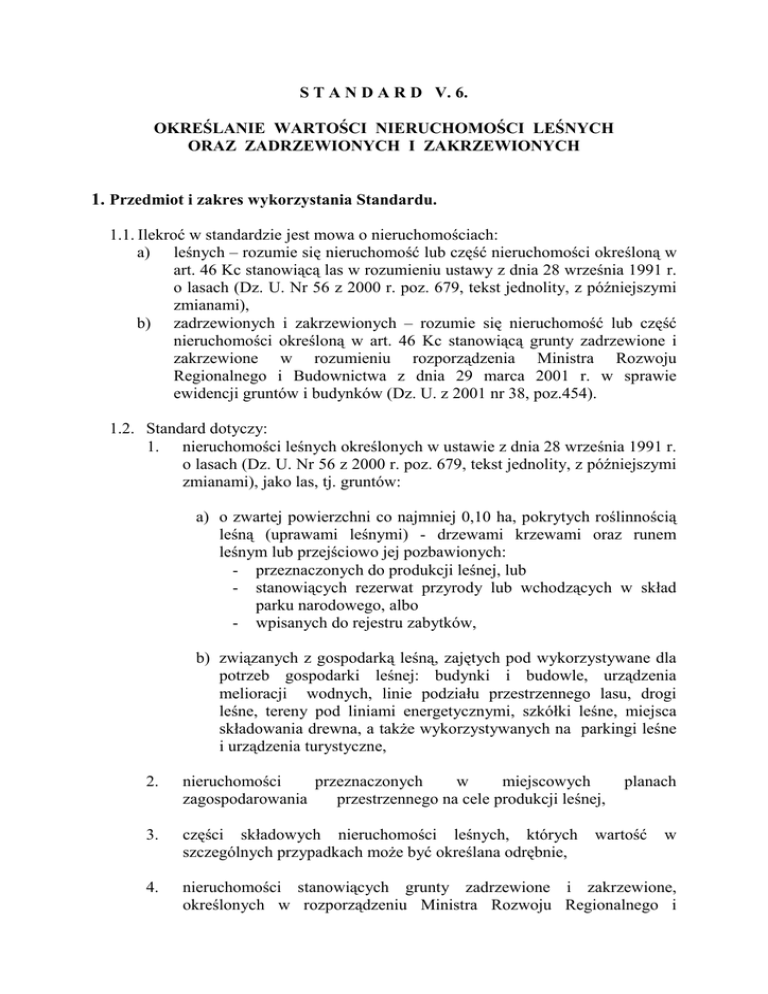 S T A N D A R D V. 6. OKREŚLANIE WARTOŚCI NIERUCHOMOŚCI LEŚNYCH ORAZ ZADRZEWIONYCH I ZAKRZEWIONYCH 1. Przedmiot i zakres wykorzystania Standardu. 1.1. Ilekroć w standardzie jest mowa o nieruchomościach: a) leśnych – rozumie się nieruchomość lub część nieruchomości określoną w art. 46 Kc stanowiącą las w rozumieniu ustawy z dnia 28 września 1991 r. o lasach (Dz. U. Nr 56 z 2000 r. poz. 679, tekst jednolity, z późniejszymi zmianami), b) zadrzewionych i zakrzewionych – rozumie się nieruchomość lub część nieruchomości określoną w art. 46 Kc stanowiącą grunty zadrzewione i zakrzewione w rozumieniu rozporządzenia Ministra Rozwoju Regionalnego i Budownictwa z dnia 29 marca 2001 r. w sprawie ewidencji gruntów i budynków (Dz. U. z 2001 nr 38, poz.454). 1.2. Standard dotyczy: 1. nieruchomości leśnych określonych w ustawie z dnia 28 września 1991 r. o lasach (Dz. U. Nr 56 z 2000 r. poz. 679, tekst jednolity, z późniejszymi zmianami), jako las, tj. gruntów: a) o zwartej powierzchni co najmniej 0,10 ha, pokrytych roślinnością leśną (uprawami leśnymi) - drzewami krzewami oraz runem leśnym lub przejściowo jej pozbawionych: - przeznaczonych do produkcji leśnej, lub - stanowiących rezerwat przyrody lub wchodzących w skład parku narodowego, albo - wpisanych do rejestru zabytków, b) związanych z gospodarką leśną, zajętych pod wykorzystywane dla potrzeb gospodarki leśnej: budynki i budowle, urządzenia melioracji wodnych, linie podziału przestrzennego lasu, drogi leśne, tereny pod liniami energetycznymi, szkółki leśne, miejsca składowania drewna, a takŜe wykorzystywanych na parkingi leśne i urządzenia turystyczne, 2. nieruchomości przeznaczonych w miejscowych zagospodarowania przestrzennego na cele produkcji leśnej, planach 3. części składowych nieruchomości leśnych, których szczególnych przypadkach moŜe być określana odrębnie, 4. nieruchomości stanowiących grunty zadrzewione i zakrzewione, określonych w rozporządzeniu Ministra Rozwoju Regionalnego i wartość w Budownictwa, wymienionym w p.1.1.b, tj. gruntów pokrytych roślinnością leśną, których pole powierzchni jest mniejsze od 0,10 ha , a takŜe: a) śródpolne skupiska drzew i krzewów niezaliczone do lasów, b) tereny torfowisk, pokrytych częściowo kępami krzewów i drzew karłowatych, c) grunty porośnięte wikliną w stanie naturalnym oraz krzewiastymi formami wierzb w dolinach rzek i obniŜeniach terenu, d) przylegające do wód powierzchniowych grunty porośnięte drzewami lub krzewami, stanowiące biologiczną strefę ochronną cieków i zbiorników wodnych, e) jary i wąwozy pokryte drzewami i krzewami w sposób naturalny lub sztuczny w celu zabezpieczenia przed erozją, niezaliczone do lasów, f) wysypiska kamieni i gruzowiska porośnięte drzewami i krzewami, g) zadrzewione i zakrzewione tereny nieczynnych cmentarzy, poza zwartymi kompleksami lasów, h) skupiska drzew i krzewów mające charakter parku, ale niewyposaŜone w urządzenia i budowle słuŜące rekreacji wypoczynkowi. 1.3. Wartość nieruchomości gruntowych wykorzystywanych aktualnie na cele produkcji leśnej, a przeznaczonych w miejscowych planach zagospodarowania przestrzennego na inne cele, określa się jak nieruchomości innego niŜ leśne przeznaczenia z uwzględnieniem celu na jakie są przeznaczone w miejscowym planie zagospodarowania przestrzennego. 1.4. Wycena na potrzeby ustalania strat i odszkodowań wynikających z utraty albo ograniczenia wartości uŜytkowej gruntów na których prowadzona jest gospodarka leśna oraz określanie wartości drzew i drzewostanów, oraz plantacji drzew, szkółek leśnych i zadrzewieniowych następuje na zasadach przewidzianych w niniejszym Standardzie. 1.5. Wartość nieruchomości gruntowych przeznaczonych w miejscowym planie zagospodarowania przestrzennego na cele inne niŜ leśne a zabudowanych budynkami i innymi urządzeniami wykorzystywanymi dla potrzeb gospodarki leśnej moŜe być określana według zasad przewidzianych w niniejszym Standardzie jeŜeli wynika to z celu wyceny lub z właściwych przepisów. 1.6. Wartość nieruchomości zabudowanych budynkami i innymi urządzeniami, połoŜonych na terenach przeznaczonych w miejscowych planach zagospodarowania przestrzennego na cele produkcji leśnej (siedziby nadleśnictw, leśnictwa, osady robotników leśnych), które są lub mogą być wykorzystywane na cele nie związane z prowadzeniem działalności leśnej a zgodnie z obowiązującymi przepisami zostały wyłączone z gospodarstwa leśnego określa się z uwzględnieniem zasad stosowanych dla aktualnego sposobu uŜytkowania - jeŜeli występuje zgodność realizowanej funkcji w szczególności z przepisami o zagospodarowaniu przestrzennym, o ochronie gruntów rolnych i leśnych oraz przepisami prawa budowlanego. 1.7. Przedmiotem wyceny według zasad niniejszego Standardu jest nieruchomość leśna lub nieruchomość stanowiąca grunt zadrzewiony i zakrzewiony jako przedmiot prawa własności lub jako przedmiot prawa uŜytkowania wieczystego, prawa uŜytkowania oraz prawa uŜytkowania wkładu gruntowego w rolniczej spółdzielni produkcyjnej. 1.8. Zasady określone w niniejszym Standardzie stosuje się odpowiednio do wyceny na potrzeby ustalania strat i odszkodowań wynikających ze zniszczenia gruntu oraz określania wartości drzew, drzewostanów i krzewów (z wyjątkiem plantacji kultur wieloletnich) zlokalizowanych na gruntach wykorzystywanych jako pracownicze ogrody działkowe, ogrody przydomowe oraz działki przyzagrodowe członków rolniczej spółdzielni produkcyjnej. 1.9. Budynki mieszkalne wchodzące w skład gospodarstwa leśnego podlegają wycenie na zasadach przewidzianych w niniejszym Standardzie. 2. Nieruchomości leśne, zadrzewione i zakrzewione oraz ich cechy mające wpływ na wartość. 2.1. Do nieruchomości leśnych stanowiących drzewostany i plantacje drzew. grunty zalesione zalicza się 2.1.1. Drzewost