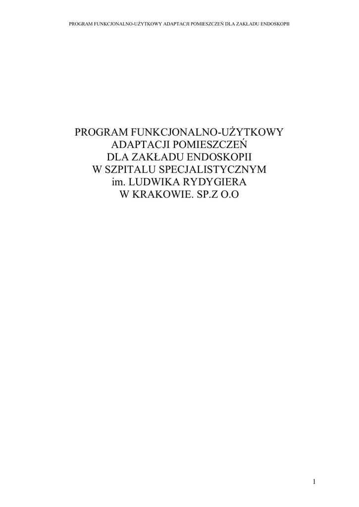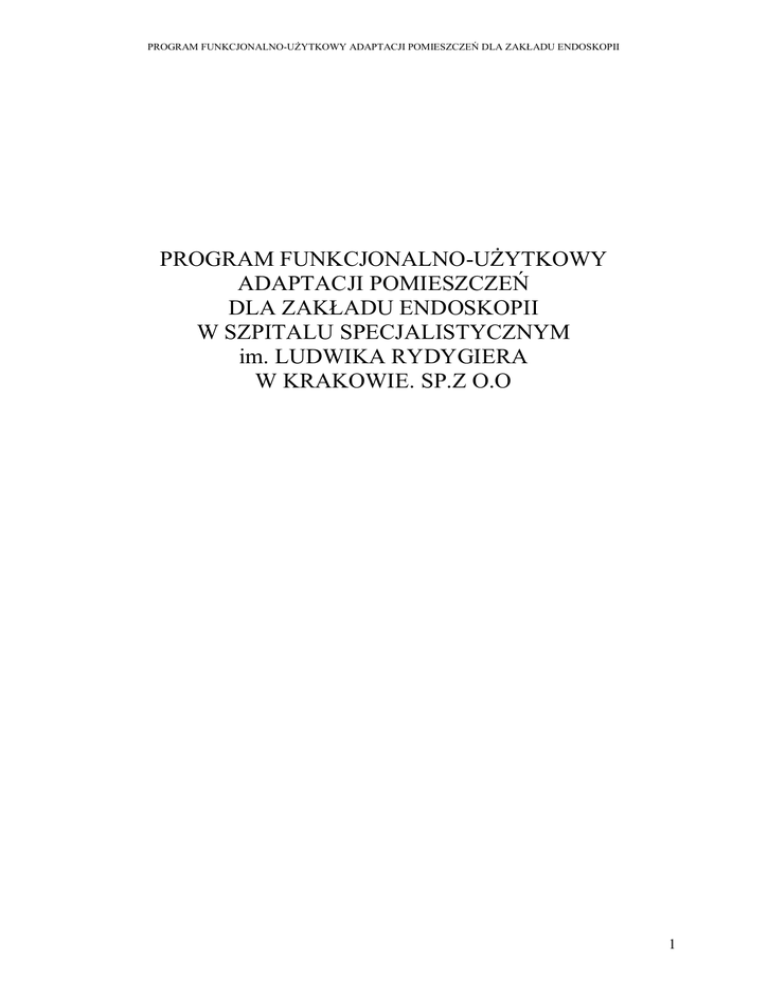 PROGRAM FUNKCJONALNO-UŻYTKOWY ADAPTACJI POMIESZCZEŃ DLA ZAKŁADU ENDOSKOPII PROGRAM FUNKCJONALNO-UŻYTKOWY ADAPTACJI POMIESZCZEŃ DLA ZAKŁADU ENDOSKOPII W SZPITALU SPECJALISTYCZNYM im. LUDWIKA RYDYGIERA W KRAKOWIE. SP.Z O.O 1 PROGRAM FUNKCJONALNO-UŻYTKOWY ADAPTACJI POMIESZCZEŃ DLA ZAKŁADU ENDOSKOPII SPIS TREŚCI: DANE OGÓLNE Dane ewidencyjne Nazwa nadana zamówieniu przez Zamawiającego Adres obiektu budowlanego Nazwa i adres Inwestora Jednostka projektowa Podstawa opracowania Cel opracowania Wstęp Przedmiot opracowania Efekt inwestycji Kody robót budowlanych wg Numerycznego Słownika Głównego wspólnego słownika zamówień (CPV). II. CZĘŚĆ OPISOWA 5. Opis ogólny przedmiotu zamówienia 6. Charakterystyczne parametry określające wielkość pomieszczeń i zakres robót budowlanych 6.1 Lokalizacja 6.2 Podstawowa dane liczbowe 6.3 Wytyczne projektowe 7. Aktualne uwarunkowania wykonania przedmiotu zamówienia 7.1 Dokumenty formalno-prawne 7.2 Uwarunkowania wynikające z lokalizacji inwestycji 7.2.1 Zagospodarowanie terenu 7.2.2 Uzbrojenie terenu i zasilania w media 7.3 Uwarunkowania techniczne 7.4 Organizacja budowy 7.5 Inwestor Zastępczy 8. Ogólne właściwości funkcjonalno-użytkowe 9. Szczegółowe właściwości funkcjonalno-użytkowe 9.1 Zestawienie powierzchni pomieszczeń wraz z określeniem ich funkcji 9.2 Dane techniczne przebudowywanych pomieszczeń szpitala 9.3 Wskaźniki powierzchniowo-kubaturowe 9.4 Zestawienie technologiczne- wymagania minimalne 9.5 Określenie wielkości możliwych przekroczeń lub pomniejszych przyjętych parametrów powierzchni i kubatury lub wskaźników 10. Wymagania Zamawiającego w stosunku do przedmiotu zamówienia 10.1 Przygotowanie terenu budowy 10.2 Ogólna charakterystyka przedsięwzięcia 10.3 Wymagania z zakresu konstrukcji 10.4 Wymagania dotyczące architektury i wykończenia 10.4.1 Rozwiązania materiałowe 10.4.2 Wymagania dotyczące wykończenia wnętrz 10.5 Wymagania w zakresie instalacji wod-kan 10.5.1 Projektowane wewnętrzne instalacje wod-kan 10.5.1.1 Opis ogólny I 1. 1.1 1.2 1.3 1.4 2. 3. 3.1 3.2 3.3 4. 2 PROGRAM FUNKCJONALNO-UŻYTKOWY ADAPTACJI POMIESZCZEŃ DLA ZAKŁADU ENDOSKOPII 10.5.1.2 10.5.1.3 10.5.1.4 10.5.1.5 10.5.1.6 10.5.2 10.6 10.6.1 10.6.2 10.6.3 10.7 10.8 10.9 10.10 10.10.1 10.10.2 10.10.3 10.11 10.12 10.13 10.14 11. 11.1 11.2 11.3 11.4 11.5 11.6 11.7 11.8 11.9 11.10 11.11 11.12 11.13 11.14 11.15 III 12. 12.1 12.2 12.3 IV. 13. V. 14. Instalacja wodociągowa Instalacja p.poż Kanalizacja sanitarna Wyposażenie i montaż przyborów i urządzeń sanitarnych Zabezpieczenia ognioochronne Uwagi ogólne Wymagania w zakresie instalacji centralnego ogrzewania Instalacja centralnego ogrzewania Próba ciśnieniowa i płukanie zładu, izolacja Uwagi końcowe Wymagania w zakresie wentylacji mechanicznej i klimatyzacji Wymagania w zakresie instalacji gazów medycznych Wymagania dotyczące instalacji elektrycznych Wymagania dotyczące sieci teletechnicznych Instalacja sieci telefonicznych Instalacja sieci komputerowej Instalacja kodów dostępu Instalacja sygnalizacji pożarowej Rozwiązania funkcyjno-technologiczne Wymagania dotyczące przygotowania terenu Uwagi ogólne Ogólne warunki wykonania i odbioru robót budowlanych Zakres prac projektowych Warunki odbioru prac projektowych Wymagania ogólne odbioru robót budowlanych Ogólne wymagania dotyczące robót Wymagania dotyczące właściwości wyrobów i materiałów budowlanych oraz urządzeń Wymagania dotyczące wykonania robót Dokumentacja budowy Odbiory Podstawa płatności Ochrona środowiska w czasie wykonania robót Ochrona przeciwpożarowa w czasie wykonywania robót Ochrona własności publicznej i prywatnej Bezpieczeństwo i higiena pracy przy wykonywaniu robót Stosowanie się do przepisów prawa Dokumenty odniesienia CZĘŚĆ INFORMACYJNA Informacje ogólne Dokumenty administracyjno-techniczne Prace projektowe Istniejące opracowania projektowe PRZEPISY PRAWNE I NORMY ZWIĄZANE Z PROJEKTEM I WYKONANIEM ZAMÓWIENIA Przepisy związane ZAŁACZNIKI Rysunki 3 PROGRAM FUNKCJONALNO-UŻYTKOWY ADAPTACJI POMIESZCZEŃ DLA ZAKŁADU ENDOSKOPII I. DANE OGÓLNE 1. Dane ewidencyjne: 1.1 Nazwa nadana zamówieniu przez Zamawiającego: Adaptacja pomieszczeń w seg. C- 1 poz. 0 na Zakład Endoskopii 1.2 Adres obiektu budowlanego: os. Złotej Jesieni 1 31-826 Kraków 1.3 Nazwa i adres Inwestora: Szpital Specjalistyczny im. Ludwika Rydygiera w Krakowie sp z o.o. os. Złotej Jesieni 1 31-826 Karków 1.4 Jednostka projektowa Dział Infrastruktury Szpitalnej 2. Podstawa opracowania: - Rozporządzenie Ministra Infrastruktury z dn. 02.09.2004r (Dz. U. z 2004r nr 202 poz. 2072 z póź. zm.) w sprawie szczegółowego zakresu i formy dokumentacji projektowej, specyfikacji technicznych wykonania i odbioru robót budowlanych oraz program funkcjonalno-użytkowy. - wizja lokalna. - uzgodnienia z użytkownikiem - obowiązujące normy i przepisy. 3. Cel opracowania: 3.1Wstęp Szpital Specjalistyczny im. Ludwika Rydygiera w Krakowie sp. z o.o. jest wieloprofilowym i wysokospecjalistycznym podmiotem medycznym udzielającym świadczeń zdrowotnych w większości rodzajów świadczeń kontraktowanych przez Narodowy Fundusz Zdrowia. Jest jednym z największych szpitali w Małopolsce, posiada 597 łóżek. Posiada 22 oddziały w pełnym przekroju specjalizacji, na których w ostatnich latach hospitalizowanych jest corocznie ok. 30 000 pacjentów, oraz zespół przyszpitalnych poradni specjalistycznych obsługujących rocznie ok. 150 000 pacjentów ambulatoryjnych. Misją Szpitala jest kompleksowe i na wysokim poziomie jakości zaspokajanie najbardziej złożonych potrzeb zdrowotnych pacjentów, przy zastosowaniu wysokospecjalistycznych technologii diagnostycznych i leczniczych oraz przy uwzględnieniu wysokiej efektywności wykorzystania posiadanych zasobów kadrowych i rzeczowych. 4 PROGRAM FUNKCJONALNO-UŻYTKOWY ADAPTACJI POMIESZCZEŃ DLA ZAKŁADU ENDOSKOPII 3.2 Przedmiot opracowania Przedm