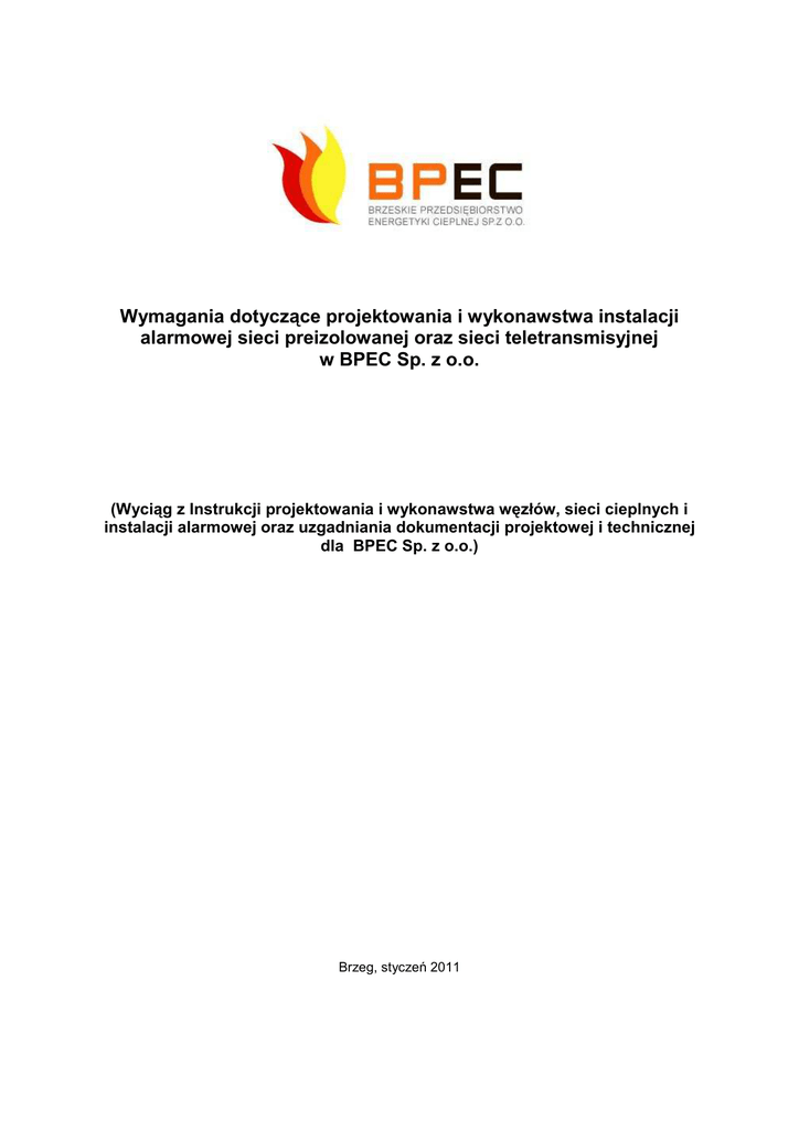Wymagania dotyczące projektowania i wykonawstwa instalacji alarmowej sieci preizolowanej oraz sieci teletransmisyjnej w BPEC Sp. z o.o. (Wyciąg z Instrukcji projektowania i wykonawstwa węzłów, sieci cieplnych i instalacji alarmowej oraz uzgadniania dokumentacji projektowej i technicznej dla BPEC Sp. z o.o.) Brzeg, styczeń 2011 Wymagania dotyczące projektowania i wykonawstwa instalacji alarmowej sieci preizolowanej oraz sieci teletransmisyjnej w BPEC Sp. z o.o. I. Wymagania dotyczące Impulsowej instalacji alarmowej sieci preizolowanej 1. Projektowanie 1.1. Dokumentacja projektowa sieci cieplnej z systemem alarmowym ma uwzględniać wymagania normy PN-EN 14419:2009 – Sieci ciepłownicze. System preizolowanych zespolonych rur do wodnych sieci ciepłowniczych układanych bezpośrednio w gruncie. System kontroli i sygnalizacji zagroŜenia stanów awaryjnych, oraz powinna być wykonana zgodnie szczególności: z obowiązującymi Prawem Budowlanym, przepisami, Prawem w tym w Energetycznym, Polskimi Normami, przepisami BHP i PpoŜ. oraz stosownymi przepisami wykonawczymi. 1.2. Sieci ciepłownicze preizolowane muszą być wyposaŜone w instalację do sygnalizowania zawilgocenia izolacji, przewidzianą do doraźnej kontroli usterek za pomocą odpowiedniego przyrządu przeznaczonego do pomiarów sieci ciepłowniczych preizolowanych zawierających impulsowy system alarmowy (np. Miernik LX 9024 prod. LEVR s.c. Warszawa) oraz przenośnego reflektometru impulsowego. 1.3. Impulsowy system alarmowy składa się z następujących elementów: obwodu nieizolowanych drutów miedzianych umieszczonych wewnątrz izolacji poliuretanowej rur, sygnalizatora uszkodzeń – detektora, komponentów instalacji alarmowej, schemat systemu alarmowego, 1.4. Impulsowy system alarmowy stanowią dwa nieizolowane druty miedziane o przekroju 1,5 mm2, umieszczone wewnątrz pianki poliuretanowej równolegle do rury przewodowej i w zaleŜności od producenta rur preizolowanych: przesunięte wzajemnie o kąt 120° lub 180° i umieszczone w pozycji odpowiadaj ącej połoŜeniu godzin 1000 i 1400 lub 900 i 1500 na tarczy zegara. Aby zapewnić właściwe połączenie ~2~ Wymagania dotyczące projektowania i wykonawstwa instalacji alarmowej sieci preizolowanej oraz sieci teletransmisyjnej w BPEC Sp. z o.o. w czasie montaŜu, jeden z drutów jest pobielany o srebrnoszarej powierzchni (umownie zwany białym), a drugi ma kolor czystej miedzi (umownie zwany czerwonym). 1.5. Instalacja alarmowa powinna być zaprojektowana oraz wykonana zgodnie z niniejszą instrukcją oraz zaleceniami producenta rur preizolowanych. 1.6. NaleŜy projektować układ zamknięty tzn. zapętlenie drutów alarmowych na kaŜdym zakończeniu przyłącza (węzeł) a w miejscu pomiarowym wprowadzić obydwa druty (biały i czerwony) do detektora. Połączenie elementów preizolowanych przewidzieć z wykorzystaniem muf zalewanych. 1.7. Projektując nową pętle alarmową naleŜy uwzględnić istniejący juŜ system alarmowy znajdujący się w obszarze projektowym oraz przewidzieć w miejscu połączenia sieci (jeŜeli będzie w dostępnym pomieszczeniu) moŜliwość wykonania pomiarów kontrolnych na nowobudowanym odcinku sieci oraz na istniejącej sieci preizolowanej. W miejscu połączenia istniejącej sieci z nowobudowaną siecią preizolowaną stosować rozdzielenie systemów alarmowych, ostateczna decyzja jest zastrzeŜona dla słuŜb technicznych BPEC. 1.8. Pętlę alarmową naleŜy projektować w taki sposób, aby miejsce pomiarowe znajdowało się w węźle cieplnym lub innym ogólnodostępnym pomieszczeniu. NaleŜy unikać zapętlenia systemu w piwnicach lokatorskich. Dopuszcza się po uzgodnieniu z BPEC wykonanie punktów pomiarowych w komorach ciepłowniczych w przypadku swobodnego dostępu do nich. 1.9. Na nowobudowanej sieci przewidzieć zakończenie instalacji alarmowej na puszkach przyłączeniowych [rys. 6.1.1] (np.: typu UPP wg ZPU Międzyrzecz lub typu 67LV25 prod. LEVR s.c. Warszawa), które naleŜy zabudować na płaskowniku ze stali nierdzewnej (uziemieniu np.: 67LV11 prod. LEVR s.c. Warszawa) przyspawanym do rury stalowej w miejscu wyjścia systemu alarmowego z rury preizolowanej [rys. 6.1.2]. Do puszek przyłączeniowych podłączyć specjalny kabel koncentryczny o impedancji Zo ≥ 125Ω (np.: typu K wg ZPU Międzyrzecz lub typu KE-001 prod. LEVR s.c. Warszawa) celem ~3~ Wymagania dotyczące projektowania i wykonawstwa instalacji alarmowej sieci preizolowanej oraz sieci teletransmisyjnej w BPEC Sp. z o.o. zamknięcia pętli systemu alarmowego. Przewody alarmowe powinny być zaizolowane. Odstępstwo od tej zasady dotyczy miejsc o duŜej wilgotności oraz przypadków gdzie zakończenie sieci jest w miejscu niedostępnym i występuje konieczność przedłuŜenia drutów alarmowych wyprowadzonych spod zakończenia termokurczliwego przewodem YDY 3x1,5 mm2 ułoŜonym na izolacji tradycyjnej do miejsc pomiarowych zastosować ogólnodostępnych, puszki instalacyjne w takim przypadku hermetyczne IP55 ze naleŜy złączką elektryczną skręcaną. W przypadku zastosowania odcinków przewodu typu YDY 3x1,5 mm2 naleŜy połączyć drut alarmowy pobielany z przewodem niebieskim a drut miedziany łączymy z przewodem zaś brązowym, przewód Ŝółto-zielony łączymy z rurą, końce przewodów oznaczyć kolorami odpowiednio dla kaŜdego przewodu alarmowego Miejsca łączenia przewodów naleŜy zabezpieczyć koszulkami termokurczliwymi odpowiedniego koloru: czerwonego – drut miedziany, białego – drut pobielany. W miejscu wyprowadzenia przewodów alarmowych spod end-capy zamontować uziemienie i podłączyć przewód Ŝółto-zielony. 1.10. Detektory oraz puszki instalacyjne hermetyczne powinny być umiejscowione na wysokości 1,4 – 1,6 m w miejscach łatwo dostępnych. Puszki przyłączeniowe [rys. 6.1.1] (np.: typu UPP wg ZPU Międzyrzecz lub typu 67LV45 prod. LEVR s.c. Warszawa) montować w miejscach łatwo dostępnych. Rys.1.1. Przykłado