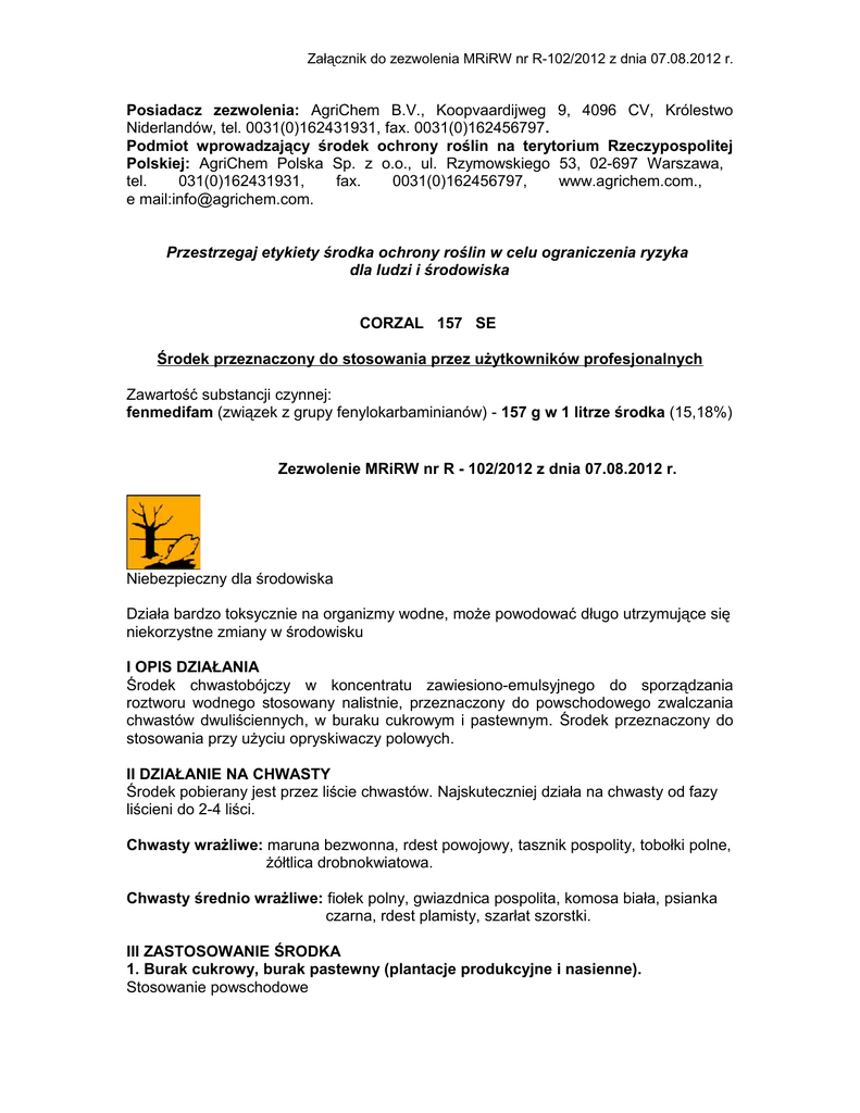 Załącznik do zezwolenia MRiRW nr R-102/2012 z dnia 07.08.2012 r. Posiadacz zezwolenia: AgriChem B.V., Koopvaardijweg 9, 4096 CV, Królestwo Niderlandów, tel. 0031(0)162431931, fax. 0031(0)162456797. Podmiot wprowadzający środek ochrony roślin na terytorium Rzeczypospolitej Polskiej: AgriChem Polska Sp. z o.o., ul. Rzymowskiego 53, 02-697 Warszawa, tel. 031(0)162431931, fax. 0031(0)162456797, www.agrichem.com., e mail:[email protected]. Przestrzegaj etykiety środka ochrony roślin w celu ograniczenia ryzyka dla ludzi i środowiska CORZAL 157 SE Środek przeznaczony do stosowania przez użytkowników profesjonalnych Zawartość substancji czynnej: fenmedifam (związek z grupy fenylokarbaminianów) - 157 g w 1 litrze środka (15,18%) Zezwolenie MRiRW nr R - 102/2012 z dnia 07.08.2012 r. Niebezpieczny dla środowiska Działa bardzo toksycznie na organizmy wodne, może powodować długo utrzymujące się niekorzystne zmiany w środowisku I OPIS DZIAŁANIA Środek chwastobójczy w koncentratu zawiesiono-emulsyjnego do sporządzania roztworu wodnego stosowany nalistnie, przeznaczony do powschodowego zwalczania chwastów dwuliściennych, w buraku cukrowym i pastewnym. Środek przeznaczony do stosowania przy użyciu opryskiwaczy polowych. II DZIAŁANIE NA CHWASTY Środek pobierany jest przez liście chwastów. Najskuteczniej działa na chwasty od fazy liścieni do 2-4 liści. Chwasty wrażliwe: maruna bezwonna, rdest powojowy, tasznik pospolity, tobołki polne, żółtlica drobnokwiatowa. Chwasty średnio wrażliwe: fiołek polny, gwiazdnica pospolita, komosa biała, psianka czarna, rdest plamisty, szarłat szorstki. III ZASTOSOWANIE ŚRODKA 1. Burak cukrowy, burak pastewny (plantacje produkcyjne i nasienne). Stosowanie powschodowe Załącznik do zezwolenia MRiRW nr R-102/2012 z dnia 07.08.2012 r. Corzal 157 SE + Oblix 500 SC Pierwszy zabieg na chwasty w fazie liścieni. Zalecana dawka dla jednorazowego zastosowania: Corzal 157 SE 2,5 l/ha + Oblix 500 SC 1 l/ha. Maksymalna dawka dla jednorazowego zastosowania: Corzal 157 SE 2,5 l/ha + Oblix 500 SC 1 l/ha. Drugi zabieg wykonać po 5-10 dniach. Zalecana dawka dla jednorazowego zastosowania: Corzal 157 SE 2,5 l/ha + Oblix 500 SC 1 l/ha. Maksymalna dawka dla jednorazowego zastosowania: Corzal 157 SE 2,5 l/ha + Oblix 500 SC 1 l/ha. Maksymalna liczba zabiegów w sezonie wegetacyjnym:2 Odstęp między zabiegami: 5-10 dni Zalecana ilość wody 200-400 l/ha. UWAGI: 1. Niekorzystny przebieg pogody (wysoka temperatura) może spowodować przejściowe zahamowanie wzrostu lub żółknięcie liści buraków. 2. PRZECIWWSKAZANIA Nie należy wykonywać zabiegów na rośliny chore lub osłabione. Podczas stosowania środka nie dopuścić do: - znoszenia cieczy użytkowej na sąsiednie rośliny uprawne, - nakładania się cieczy użytkowej na stykach pasów zabiegowych i uwrociach. 3. NASTĘPSTWO ROŚLIN Środek rozkłada się w ciągu okresu wegetacji nie stwarzając zagrożenia dla roślin uprawianych następczo. W przypadku wcześniejszego zaorania plantacji buraka z powodu uszkodzeń roślin przez choroby lub szkodniki, można uprawiać buraki (cukrowe pastewne, ćwikłowe) lub kukurydzę. 4. OKRES OD OSTATNIEGO ZASTOSOWANIA ŚRODKA NA ROŚLINY DO DNIA W KTÓRYM MOŻNA SIAĆ LUB SADZIĆ ROŚLINY UPRAWIANE NASTĘPCZO Nie dotyczy IV SPORZĄDZANIE CIECZY UŻYTKOWEJ Przed przystąpieniem do sporządzania cieczy użytkowej ustalić potrzebną jej ilość. Odmierzoną ilość środka wlać do zbiornika opryskiwacza napełnionego częściowo wodą (z włączonym mieszadłem) i uzupełnić wodą do potrzebnej ilości. Po wlaniu środka do zbiornika opryskiwacza nie wyposażonego w mieszadło hydrauliczne, ciecz w zbiorniku mechanicznie wymieszać. Opróżnione opakowania przepłukać trzykrotnie wodą, a popłuczyny wlać do zbiornika opryskiwacza z cieczą użytkową. W przypadku przerw w opryskiwaniu, przed ponownym przystąpieniem do pracy, dokładnie wymieszać ciecz użytkową w zbiorniku opryskiwacza. Po pracy aparaturę dokładnie wymyć. Załącznik do zezwolenia MRiRW nr R-102/2012 z dnia 07.08.2012 r. V ŚRODKI OSTROŻNOŚCI 1. OKRES OD ZASTOSOWANIA ŚRODKA DO DNIA, W KTÓRYM NA OBSZAR, NA KTÓRYM ZASTOSOWANO ŚRODEK MOGĄ WEJŚĆ LUDZIE ORAZ ZOSTAĆ WPROWADZONE ZWIERZĘTA. Nie dotyczy 2. OKRES PREWENCJI DLA PSZCZÓŁ (okres zapobiegający zatruciu) Nie dotyczy 3. OKRES OD OSTATNIEGO ZASTOSOWANIA ŚRODKA DO DNIA ZBIORU ROŚLINY UPRAWNEJ (okres karencji) Nie dotyczy 4. OKRES OD OSTATNIEGO ZASTOSOWANIA ŚRODKA NA ROŚLINY PRZEZNACZONE NA PASZĘ DO DNIA W KTÓRYM ZWIERZĘTA MOGĄ BYĆ KARMIONE TYMI ROŚLINAMI (okres karencji dla pasz) Nie dotyczy 5. OCHRONA STOSUJĄCEGO ŚRODEK OCHRONY ROŚLIN Nie jeść i nie pić oraz nie palić tytoniu podczas stosowania produktu. Nosić odpowiednią odzież ochronną i rękawice ochronne. W razie połknięcia niezwłocznie zasięgnąć porady lekarza i pokazać mu opakowanie lub etykietę. 6. OCHRONA ŚRODOWISKA Zabrania się stosowania środka w strefie bezpośredniej ochrony ujęć wody. Nie zanieczyszczać wód środkiem ochrony roślin lub jego opakowaniem. Nie myć aparatury w pobliżu wód powierzchniowych. Unikać zanieczyszczania wód poprzez rowy odwadniające z gospodarstw i dróg. Przed zastosowaniem środka należy poinformować o tym fakcie wszystkie zainteresowane strony, które mogą być narażone na znoszenie cieczy roboczej i które zwróciły się o taką informację. Resztki cieczy użytkowej rozcieńczyć wodą i wypryskać na powierzchni poprzednio opryskiwanej. Wodę użytą do mycia aparatury wypryskać na powierzchni uprzednio opryskiwanej, stosując te same środki ochrony osobistej. Środek i opakowanie usuwać jako odpad niebezpieczny. Opróżnione opakowanie po środku zwrócić do sprzedawcy, u którego środek został zakupiony. Używać odpowiednich pojemników zapobiegających skażeniu środowiska. Zabrania się spalania opakowań po środku we własnym zakresie. Zabrania się wykorzy