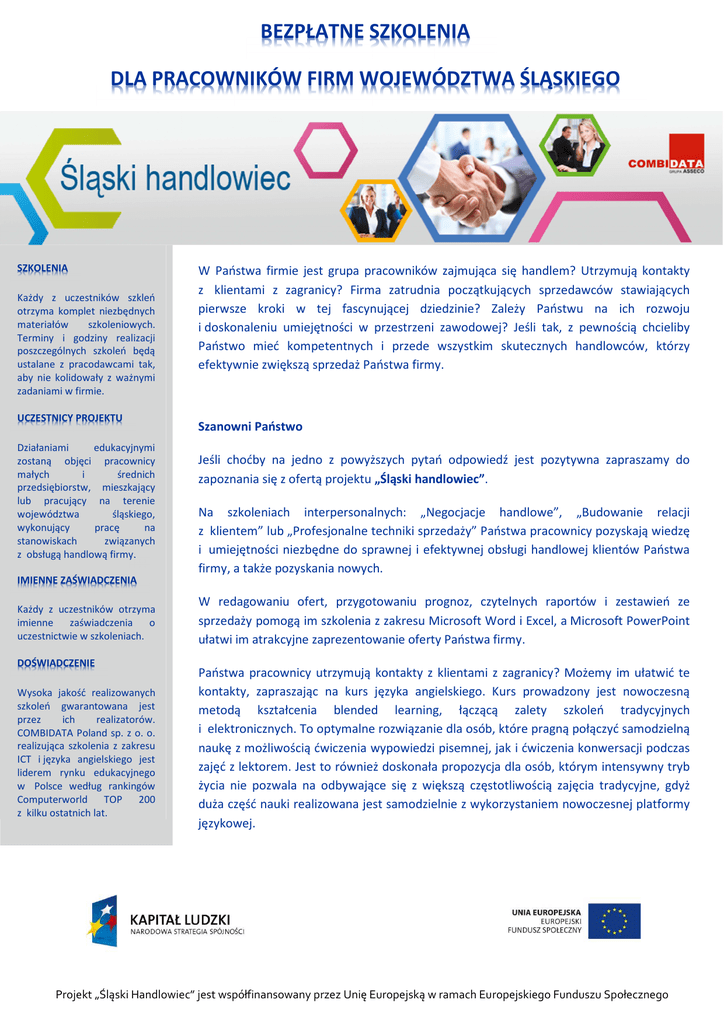 BEZPŁATNE SZKOLENIA DLA PRACOWNIKÓW FIRM WOJEWÓDZTWA ŚLĄSKIEGO SZKOLENIA Każdy z uczestników szkleń otrzyma komplet niezbędnych materiałów szkoleniowych. Terminy i godziny realizacji poszczególnych szkoleń będą ustalane z pracodawcami tak, aby nie kolidowały z ważnymi zadaniami w firmie. UCZESTNICY PROJEKTU Działaniami edukacyjnymi zostaną objęci pracownicy małych i średnich przedsiębiorstw, mieszkający lub pracujący na terenie województwa śląskiego, wykonujący pracę na stanowiskach związanych z obsługą handlową firmy. W Państwa firmie jest grupa pracowników zajmująca się handlem? Utrzymują kontakty z klientami z zagranicy? Firma zatrudnia początkujących sprzedawców stawiających pierwsze kroki w tej fascynującej dziedzinie? Zależy Państwu na ich rozwoju i doskonaleniu umiejętności w przestrzeni zawodowej? Jeśli tak, z pewnością chcieliby Państwo mieć kompetentnych i przede wszystkim skutecznych handlowców, którzy efektywnie zwiększą sprzedaż Państwa firmy. Szanowni Państwo Jeśli choćby na jedno z powyższych pytań odpowiedź jest pozytywna zapraszamy do zapoznania się z ofertą projektu „Śląski handlowiec”. Na szkoleniach interpersonalnych: „Negocjacje handlowe”, „Budowanie relacji z klientem” lub „Profesjonalne techniki sprzedaży” Państwa pracownicy pozyskają wiedzę i umiejętności niezbędne do sprawnej i efektywnej obsługi handlowej klientów Państwa firmy, a także pozyskania nowych. IMIENNE ZAŚWIADCZENIA Każdy z uczestników otrzyma imienne zaświadczenia o uczestnictwie w szkoleniach. DOŚWIADCZENIE Wysoka jakość realizowanych szkoleń gwarantowana jest przez ich realizatorów. COMBIDATA Poland sp. z o. o. realizująca szkolenia z zakresu ICT i języka angielskiego jest liderem rynku edukacyjnego w Polsce według rankingów Computerworld TOP 200 z kilku ostatnich lat. W redagowaniu ofert, przygotowaniu prognoz, czytelnych raportów i zestawień ze sprzedaży pomogą im szkolenia z zakresu Microsoft Word i Excel, a Microsoft PowerPoint ułatwi im atrakcyjne zaprezentowanie oferty Państwa firmy. Państwa pracownicy utrzymują kontakty z klientami z zagranicy? Możemy im ułatwić te kontakty, zapraszając na kurs języka angielskiego. Kurs prowadzony jest nowoczesną metodą kształcenia blended learning, łączącą zalety szkoleń tradycyjnych i elektronicznych. To optymalne rozwiązanie dla osób, które pragną połączyć samodzielną naukę z możliwością ćwiczenia wypowiedzi pisemnej, jak i ćwiczenia konwersacji podczas zajęć z lektorem. Jest to również doskonała propozycja dla osób, którym intensywny tryb życia nie pozwala na odbywające się z większą częstotliwością zajęcia tradycyjne, gdyż duża część nauki realizowana jest samodzielnie z wykorzystaniem nowoczesnej platformy językowej. Projekt „Śląski Handlowiec” jest współfinansowany przez Unię Europejską w ramach Europejskiego Funduszu Społecznego DOGODNA LOKALIZACJA ŚCIEŻKI SZKOLENIOWE Szkolenia będą realizowane w ośrodku szkoleniowym w Katowicach. Istnieje możliwość zorganizowania zamkniętych grup szkoleniowych w innych dogodnych dla uczestników lokalizacjach. CATERING Uczestnicy w trakcie ośmiogodzinnych szkoleń będą mieli zapewniony obiad i przerwy kawowe. PRZYJAZNY HARMONOGRAM Godziny zajęć stacjonarnych zostaną dostosowane do potrzeb pracodawców i skierowanych na szkolenia pracowników. Harmonogram planowanych szkoleń będzie publikowany na portalu projektu: http://slaskihandlowiec.eduportal.pl Działania edukacyjne realizowane w projekcie zgrupowano w postaci ścieżek szkoleniowych. Każda ze ścieżek realizowana będzie z uwzględnieniem potrzeb szkoleniowych uczestników/-czek zbadanych na etapie procesu rekrutacji. W ramach projektu pracownicy firm mogą wziąć udział nawet w 3 atrakcyjnych, bezpłatnych szkoleniach dostarczających kompetencje pożądane u pracowników pracujących na stanowiskach związanych z obsługą handlową firmy. KONTAKT: 3 SZKOLENIA DO WYBORU SPOŚRÓD: Tel. 58 522 28 35 Fax. 58 550 95 51 e-mail: [email protected] szczegółoweinformacjeoprojekcie http://slaskihanlowiec.eduportal.pl • Jedno szkolenie z umiejętności osobistych: o • • Negocjacje Handlowe o Profesjonalne techniki sprzedaży o Prowadzenie publicznych wystąpień o Budowanie relacji z klientem Jedno szkolenie aplikacyjne: o Microsoft Word – poziom podstawowy o Microsoft Word – poziom zaawansowany o Microsoft Excel – poziom podstawowy o Microsoft Excel – poziom zaawansowany o Analiza danych w Microsoft Excel o Microsoft PowerPoint Szkolenie językowe: o Język angielski – jeden z 6 poziomów zaawansowania zgodnych z Common European Framework (CEF) Projekt „Śląski Handlowiec” jest współfinansowany przez Unię Europejską w ramach Europejskiego Funduszu Społecznego REALIZATOR PROJEKTU COMBIDATA Poland – projektodawca i realizator szkoleń Combidata zajmuje się procesami edukacyjnymi w ich najbardziej rozwiniętej formie, tj. od analizy procesów biznesowych i określania potrzeb kompetencyjnych, do dostarczania wiedzy i umiejętności w różnych technologiach edukacyjnych. Doświadczenia i kompetencje COMBIDATA w zakresie wszystkich stosowanych na świecie technologii edukacyjnych stawiają COMBIDATA w roli lidera na polskim rynku edukacyjnym, co potwierdza ranking czasopisma „Computerworld TOP 200” w kategorii największa firma świadcząca usługi szkoleniowe w kilku ostatnich latach. COMBIDATA jest partnerem biznesowym i dostawcą rozwiązań edukacyjnych takich partnerów jak: Microsoft, Oracle, NIL, CISCO, Novell, Exin, Prometric, VUE, Autodesk, Altova. ZAPRASZAMY DO UCZESTNICTWA W PROJEKCIE COMBIDATA POLAND sp. z o.o. ul. Francuska 35-37 40-027 Katowice Tel. 58 522 28 35 Fax. 58 550 95 51 e-mail: [email protected] http://slaskihandlowiec.eduportal.pl Projekt „Śląski Handlowiec” jest współfinansowany przez Unię Europejską w rama