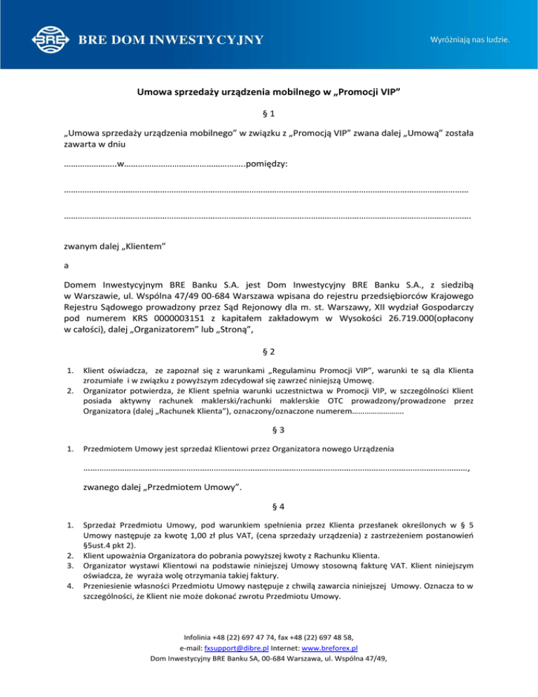 Umowa sprzedaży urządzenia mobilnego w „Promocji VIP” §1 „Umowa sprzedaży urządzenia mobilnego” w związku z „Promocją VIP” zwana dalej „Umową” została zawarta w dniu …………………..w……………………………………………..pomiędzy: …………………………………………………………………………………………………………………………………………………………… ……………………………………………………………………………………………………………………………………………………………. zwanym dalej „Klientem” a Domem Inwestycyjnym BRE Banku S.A. jest Dom Inwestycyjny BRE Banku S.A., z siedzibą w Warszawie, ul. Wspólna 47/49 00-684 Warszawa wpisana do rejestru przedsiębiorców Krajowego Rejestru Sądowego prowadzony przez Sąd Rejonowy dla m. st. Warszawy, XII wydział Gospodarczy pod numerem KRS 0000003151 z kapitałem zakładowym w Wysokości 26.719.000(opłacony w całości), dalej „Organizatorem” lub „Stroną”, §2 1. 2. Klient oświadcza, ze zapoznał się z warunkami „Regulaminu Promocji VIP”, warunki te są dla Klienta zrozumiałe i w związku z powyższym zdecydował się zawrzeć niniejszą Umowę. Organizator potwierdza, że Klient spełnia warunki uczestnictwa w Promocji VIP, w szczególności Klient posiada aktywny rachunek maklerski/rachunki maklerskie OTC prowadzony/prowadzone przez Organizatora (dalej „Rachunek Klienta”), oznaczony/oznaczone numerem……………………. §3 1. Przedmiotem Umowy jest sprzedaż Klientowi przez Organizatora nowego Urządzenia ……………………………………………………………………………………………………………………………………………………, zwanego dalej „Przedmiotem Umowy”. §4 1. 2. 3. 4. Sprzedaż Przedmiotu Umowy, pod warunkiem spełnienia przez Klienta przesłanek określonych w § 5 Umowy następuje za kwotę 1,00 zł plus VAT, (cena sprzedaży urządzenia) z zastrzeżeniem postanowień §5ust.4 pkt 2). Klient upoważnia Organizatora do pobrania powyższej kwoty z Rachunku Klienta. Organizator wystawi Klientowi na podstawie niniejszej Umowy stosowną fakturę VAT. Klient niniejszym oświadcza, że wyraża wolę otrzymania takiej faktury. Przeniesienie własności Przedmiotu Umowy następuje z chwilą zawarcia niniejszej Umowy. Oznacza to w szczególności, że Klient nie może dokonać zwrotu Przedmiotu Umowy. Infolinia +48 (22) 697 47 74, fax +48 (22) 697 48 58, e-mail: [email protected] Internet: www.breforex.pl Dom Inwestycyjny BRE Banku SA, 00-684 Warszawa, ul. Wspólna 47/49, §5 1. Strony postanawiają, że nabycie Przedmiotu Umowy za cenę wskazaną w § 4 Umowy następuje na warunkach określonych w niniejszym paragrafie. 2. W związku z podpisaniem Umowy, Klient wyraża zgodę na to, aby Organizator Promocji dokonał blokady środków pieniężnych w kwocie równej …………………………………..zł (słownie: …………………………………………………………złotych) na Rachunku numerze…………………………………………………………………………………………… Klienta o na okres od………………………………. Do………………………………. na warunkach określonych w ust. 3 -6 niniejszego paragrafu. Zwolnienie blokady środków pieniężnych może jednakże nastąpić przed upływem terminu wskazanego powyżej – a mianowicie po zakończeniu miesiąca kalendarzowego, w którym spełnione zostały przez Klienta przesłanki nabycia Przedmiotu Umowy za cenę wskazaną w § 4. Klient przez podpisanie niniejszej Umowy zleca Organizatorowi oraz udziela mu pełnomocnictwa do dokonania blokady środków pieniężnych na warunkach określonych w niniejszym paragrafie. Jeżeli nie spełnią się przesłanki nabycia Przedmiotu Umowy za cenę wskazaną w § 4, klient zobowiązany będzie do zapłaty pełnej ceny urządzenia pomniejszonej o uprzednio zapłaconą cenę sprzedaży urządzenia, tj. kwotę równą blokadzie środków określoną w niniejszym punkcie. 3. 4. Zablokowana kwota środków pieniężnych, o której mowa w ust. 2 może być wykorzystywana przez Klienta jako Depozyt Zabezpieczający transakcje zawierane w ramach Umowy OTC na Rachunku Klienta, nie może zostać jednak wypłacona z rachunku, przelana na innych rachunek ani wykorzystana przez Klienta w jakikolwiek inny sposób. Po okresie wskazanym w ust. 2 nastąpi: 1) Zwolnienie blokady środków pieniężnych, pod warunkiem że sumaryczny wolumen obrotu na instrumentach finansowych biorących udział w Promocji, których lista została określona w Załączniku 1 do niniejszej Umowy, wyniósł na Rachunku/Rachunkach Klienta o numerze:………………………………………………………………………………………………………………………………………… …… w trakcie nieprzerwanego uczestnictwa w Promocji co najmniej 400 (słownie: czterysta) Lotów, albo 2) kwota zablokowanych środków zostanie pobrana przez Organizatora Promocji z Rachunku Klienta jako potrącenie rozliczeń przysługujących Organizatorowi tytułem zapłaty za urządzenie , w sytuacji gdy suma wolumenu obrotu na instrumentach określonych w Załączniku 1 na ww. Rachunku/Rachunkach Klienta w trakcie nieprzerwanego uczestnictwa w Promocji wyniesie mniej niż 400 (słownie: czterysta) Lotów. Klient nieodwołanie upoważnia Organizatora do pobrania (potrącenia) powyższej kwoty z Rachunku Klienta. 5. 6. Klient oświadcza, iż zobowiązuje się uzupełnić kwotę na Rachunku maklerskim OTC w sytuacji, kiedy saldo okaże się niższe od blokady wskazanej w § 5 pkt. 2, w terminie 7 dni od daty otrzymania wezwania od Organizatora. W przypadku, gdy Organizator (zgodnie z postanowieniami „Regulaminu Promocji VIP”) wykluczy Klienta z promocji, kwota zablokowanych ś