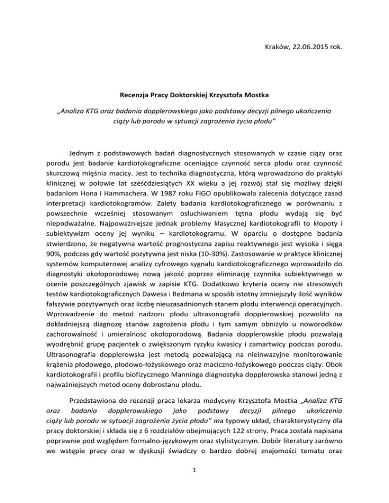 Kraków, 22.06.2015 rok. Recenzja Pracy Doktorskiej Krzysztofa Mostka „Analiza KTG oraz badania dopplerowskiego jako podstawy decyzji pilnego ukończenia ciąży lub porodu w sytuacji zagrożenia życia płodu” Jednym z podstawowych badań diagnostycznych stosowanych w czasie ciąży oraz porodu jest badanie kardiotokograficzne oceniające czynność serca płodu oraz czynność skurczową mięśnia macicy. Jest to technika diagnostyczna, którą wprowadzono do praktyki klinicznej w połowie lat sześćdziesiątych XX wieku a jej rozwój stał się możliwy dzięki badaniom Hona i Hammachera. W 1987 roku FIGO opublikowała zalecenia dotyczące zasad interpretacji kardiotokogramów. Zalety badania kardiotokograficznego w porównaniu z powszechnie wcześniej stosowanym osłuchiwaniem tętna płodu wydają się być niepodważalne. Najpoważniejsze jednak problemy klasycznej kardiotokografii to kłopoty i subiektywizm oceny jej wyniku – kardiotokogramu. W oparciu o dostępne badania stwierdzono, że negatywna wartość prognostyczna zapisu reaktywnego jest wysoka i sięga 90%, podczas gdy wartość pozytywna jest niska (10-30%). Zastosowanie w praktyce klinicznej systemów komputerowej analizy cyfrowego sygnału kardiotokograficznego wprowadziło do diagnostyki okołoporodowej nową jakość poprzez eliminację czynnika subiektywnego w ocenie poszczególnych zjawisk w zapisie KTG. Dodatkowo kryteria oceny nie stresowych testów kardiotokograficznych Dawesa i Redmana w sposób istotny zmniejszyły ilość wyników fałszywie pozytywnych oraz liczbę nieuzasadnionych stanem płodu interwencji operacyjnych. Wprowadzenie do metod nadzoru płodu ultrasonografii dopplerowskiej pozwoliło na dokładniejszą diagnozę stanów zagrożenia płodu i tym samym obniżyło u noworodków zachorowalność i umieralność okołoporodową. Badania dopplerowskie płodu pozwalają wyodrębnić grupę pacjentek o zwiększonym ryzyku kwasicy i zamartwicy podczas porodu. Ultrasonografia dopplerowska jest metodą pozwalającą na nieinwazyjne monitorowanie krążenia płodowego, płodowo-łożyskowego oraz maciczno-łożyskowego podczas ciąży. Obok kardiotokografii i profilu biofizycznego Manninga diagnostyka dopplerowska stanowi jedną z najważniejszych metod oceny dobrostanu płodu. Przedstawiona do recenzji praca lekarza medycyny Krzysztofa Mostka „Analiza KTG oraz badania dopplerowskiego jako podstawy decyzji pilnego ukończenia ciąży lub porodu w sytuacji zagrożenia życia płodu” ma typowy układ, charakterystyczny dla pracy doktorskiej i składa się z 6 rozdziałów obejmujących 122 strony. Praca została napisana poprawnie pod względem formalno-językowym oraz stylistycznym. Dobór literatury zarówno we wstępie pracy oraz w dyskusji świadczy o bardzo dobrej znajomości tematu oraz 1 samodzielności naukowej autora. Szczególnie dyskusja zasługuje na wyróżnienie, ponieważ autor w sposób bardzo krytyczny odniósł się do wyników swoich badań w aspekcie prawidłowo dobranego krajowego i zagranicznego piśmiennictwa, co świadczy o umiejętności wykorzystania źródeł. W pracy określono jeden główny cel badawczy – ocenę przydatności zapisów kardiotokograficznych jako metody, która w połączeniu z badaniem dopplerowskim stanowi podstawę do decyzji pilnego ukończenia ciąży lub porodu w sytuacji zagrożenia życia płodu. Cel pracy realizowano poprzez analizę zapisów kardiotokograficznych, analizę badań dopplerowskich, ocenę stanu pourodzeniowego noworodka oraz przeprowadzenie analizy statystycznej oraz porównanie czułości i swoistości diagnostycznej, pozytywnej i negatywnej wartości predykcji oraz dokładności badania kardiotokograficznego i ultrasonografii dopplerowskiej. Oceniając metodykę, należy stwierdzić, że została ona zaplanowana w sposób prawidłowy. Zarówno zastosowane metody jak i narzędzia badawcze nie budzą żadnych zastrzeżeń. Badanie ma charakter retrospektywny i zostało przeprowadzone w oparciu o dokumentację medyczną na grupie 481 pacjentek w ciążach donoszonych, które urodziły w Oddziale Położniczo-Ginekologicznym Wojewódzkiego Szpitala Zespolonego w Kaliszu w latach 2011-2013. Pacjentki podzielono na dwie grupy. Do grupy pierwszej włączono 241 pacjentki, u których na podstawie oceny zapisu KTG i/lub badania dopplerowskiego wystąpiły wskazania do pilnego ukończenia ciąży i porodu. Ciężarne z tej grupy zostały podzielone na dwie podgrupy: 99 pacjentek, u których wykonano badania kardiotokograficzne i badania dopplerowskie oraz 142 pacjentki u których wykonano tylko badania kardiotokograficzne. Grupę kontrolną stanowiło 240 ciężarnych, u których rutynowo wykonane zapisy KTG i badania dopplerowskie były prawidłowe i których ciąże ukończono w sposób planowy (porodem drogami natury lub cięciem cesarskim). Kardiotokogramy oceniano według skali NICE z 2001 roku i podzielono je na prawidłowe, podejrzane oraz patologiczne. Badania dopplerowskie przeprowadzono oceniając przepływy w tętnicy środkowej mózgu (MCA), tętnicy pępowinowej (UA) i żyle pępowinowej (UV). Za nieprawidłową wartość wskaźnika mózgowo-pępowinowego przyjęto wartość CPR<1.08. Na podstawie dokumentacji medycznej dokonano oceny stanu noworodka po porodzie (skala Apgar, równowaga kwasowo-zasadowa krwi pępowinowej oraz pH-metria). Jako kryterium złego stanu noworodka po porodzie przyjęto wystąpienie przynajmniej jednego z następujących parametrów: pH<7.2, BE<-12 lub Apgar<7 punktów w pierwszej lub piątej minucie życia noworodka. Na przeprowadzone badanie uzyskano zgodę Komisji Bioetycznej przy Uniwersytecie Medycznym im. Karola Marcinkowskiego w Poznaniu (391/13). Otrzymane wyniki zostały poddane analizie statystycznej przy użyciu programu GraphPad InStat 3, zastosowano test dokładny Fischera. Hipotezy statystyczne weryfikowane były na poziomie istotności statystycznej p<0.05. Wyniki zaprezentowano b