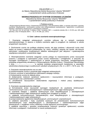 ZAŁĄCZNIK nr 1 do Statutu Niepublicznej Szkoły Muzycznej I stopnia "MOZART" z uprawnieniami szkoły publicznej w Krakowie WEWNĄTRZSZKOLNY SYSTEM OCENIANIA UCZNIÓW Niepublicznej Szkoły Muzycznej I stopnia "MOZART" z uprawnieniami szkoły publicznej w Krakowie I. Podstawa prawna - Rozporządzenie Ministra Kultury i Dziedzictwa Narodowego z dnia 08 kwietnia 2008 r. w sprawie warunków i sposobu oceniania, klasyfikowania i promowania uczniów oraz przeprowadzania sprawdzianów i egzaminów w publicznych szkołach i placówkach artystycznych z późniejszymi zmianami - Art. 32a ust.4, Art. 22 ust.2 pkt. 4 Ustawy z dnia 7 września 1991 r. o systemie oświaty (Dz. U. Nr 95, poz. 425; tekst jednolity z dnia 19 listopada 2004 r. – Dz. U. Nr 256, poz. 2572) II. Cele i zakres oceniania wewnątrzszkolnego 1. Ocenianie osiągnięć edukacyjnych uczniów odbywa się w ramach oceniania wewnątrzszkolnego, w oparciu o kryteria oceniania ujęte w przyjętych do realizacji w szkole programach nauczania. 2. Zachowanie ucznia nie podlega odrębnej ocenie, ale jego postawa i aktywność może mieć wpływ na ocenę z niektórych przedmiotów, np. chóru, orkiestry, zespołu lub rytmiki, dla których warunkiem uzyskiwania oczekiwanych efektów edukacyjnych jest aktywna i systematyczna współpraca wszystkich uczestników zajęć. 3. Wewnątrzszkolne ocenianie osiągnięć ucznia polega na rozpoznawaniu przez nauczycieli poziomu i postępów w opanowaniu przez ucznia wiadomości i umiejętności, w stosunku do wymagań wynikających z realizowanych w szkole programów nauczania, uwzględniających podstawę programową określoną w Rozporządzeniu Ministra Kultury i Dziedzictwa Narodowego z dnia......................................... w sprawie podstaw programowych kształcenia w zawodach szkolnictwa artystycznego w publicznych szkołach artystycznych ( Dz. U. z 2011 r. Nr15, poz. 70) 4. Ocenianie wewnątrzszkolne ma na celu: a) poinformowanie ucznia o poziomie jego osiągnięć edukacyjnych; b) pomoc uczniowi w samodzielnym planowaniu swojego rozwoju; c) motywowanie ucznia do dalszej pracy; d) dostarczenie rodzicom (prawnym opiekunom) i nauczycielom informacji o postępach, trudnościach oraz uzdolnieniach uczniów; e) umożliwienie nauczycielom doskonalenia organizacji i metod pracy dydaktycznowychowawczej. 5. Ocenianie wewnątrzszkolne obejmuje: a) formułowanie przez nauczycieli wymagań niezbędnych do uzyskania śródrocznych i końcoworocznych ocen z obowiązkowych i nadobowiązkowych zajęć edukacyjnych; b) ocenianie bieżące i ustalanie śródrocznych ocen klasyfikacyjnych z obowiązkowych i nadobowiązkowych zajęć edukacyjnych według form przyjętych w szkole; c) ustalanie końcoworocznych (semestralnych) ocen klasyfikacyjnych z obowiązkowych i nadobowiązkowych zajęć edukacyjnych, d) przeprowadzanie egzaminów klasyfikacyjnych, promocyjnych i poprawkowych; e) ustalanie warunków i trybu uzyskania wyższych niż przewidywane końcoworocznych (semestralnych) ocen klasyfikacyjnych z obowiązkowych i nadobowiązkowych zajęć edukacyjnych, z wyjątkiem oceny ustalonej w trybie egzaminu promocyjnego; f) ustalanie warunków i sposobu przekazywania rodzicom (prawnym opiekunom) uczniów informacji o postępach i trudnościach w nauce podopiecznych. 1 III. Komunikacja z rodzicami i uczniami 1. Nauczyciele na początku każdego roku szkolnego informują uczniów oraz rodziców (prawnych opiekunów) o: a) wymaganiach edukacyjnych niezbędnych do uzyskania poszczególnych śródrocznych i końcoworocznych (semestralnych) ocen klasyfikacyjnych z obowiązkowych i nadobowiązkowych zajęć edukacyjnych, wynikających z realizowanego programu nauczania; b) sposobach sprawdzania osiągnięć edukacyjnych uczniów; c) warunkach i trybie uzyskania wyższej niż przewidywana końcoworocznej (semestralnej) oceny klasyfikacyjnej z obowiązkowych i nadobowiązkowych zajęć edukacyjnych, z wyjątkiem oceny ustalonej w trybie egzaminu promocyjnego; 2. Oceny są jawne zarówno dla ucznia, jak i jego rodziców (prawnych opiekunów). 3. Na wniosek ucznia lub jego rodziców (prawnych opiekunów) nauczyciel uzasadnia ustaloną ocenę. 4. Na wniosek ucznia lub jego rodziców (prawnych opiekunów) sprawdzone i ocenione pisemne prace kontrolne są udostępniane uczniowi i jego rodzicom (prawnym opiekunom). 5. Wszystkie oceny są uwidocznione w dzienniku lekcyjnym. 6. Nauczyciele informują ucznia oraz jego rodziców o przewidywanych ocenach okresowych/rocznych w terminie 30 dni przed klasyfikacyjnym śródrocznym oraz końcoworocznym posiedzeniem Rady Pedagogicznej. 7. Nauczyciele w formie pisemnej informują ucznia oraz jego rodziców (prawnych opiekunów) za zwrotnym potwierdzeniem odbioru pisma o przewidywanej niepromującej ocenie okresowej/rocznej w terminie 30 dni przed klasyfikacyjnym śródrocznym/końcoworocznym posiedzeniem Rady Pedagogicznej. IV. Formy i sposób oceniania 1. Ocenianie bieżące 1.1 Nauczyciele poszczególnych przedmiotów systematycznie dokonują oceny postępów edukacyjnych ucznia, porównując stopień opanowania przez niego materiału do wymagań, określonych w zatwierdzonych do użytku szkolnego programach nauczania. 1.2 Nauczyciele przedmiotu głównego dokonują oceny postępów ucznia nie rzadziej niż raz w miesiącu, biorąc pod uwagę: stopień realizacji pracy domowej, zaangażowanie i aktywność na zajęciach, posiadany przez ucznia stopień umiejętności względem oczekiwanego na danym poziomie edukacyjnym. W rubryce „uwagi” oceniają w formie opisowej lub za pomocą stopni. 1.3 Nauczyciele przedmiotów ogólnomuzycznych na bieżąco wystawiają oceny cząstkowe w skali 1 do 6 z plusami i minusami. Dokonują oceny postępów edukacyjnych ucznia stosując wynikające ze specyfiki nauczanego przedmiotu formy: dyktanda, testu, pracy klasowej, ustnego sprawdzenia znajomości opracowywanych zagadnień, sprawdzenia zadań domowych. 2. Ocenianie śródroczne i końcoworo