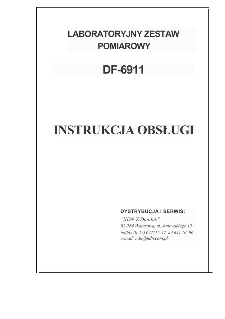 LABORATORYJNY ZESTAW POMIAROWY DF-6911 INSTRUKCJA OBSŁUGI DYSTRYBUCJA I SERWIS: "NDN-Z.Daniluk" 02-784 Warszawa, ul. Janowskiego 15 tel/fax (0-22) 641^15-47, tel 641-61-96 e-mail: [email protected] DF-6911 Zestaw pomiarowy DF6911 jest przeznaczony do zastosowa w laboratoriach badawczych i szkolnych. W skład zestawu wchodz: generator funkcyjny 10MHz, czsto ciomierz 2,4GHz, zasilacz prdu stałego, multimetr cyfrowy oraz wzmacniacz akustyczny. Widok przedniej cz ci zestawu 1 Generator funkcyjny 4 Zasilacz DC 2 Czsto ciomierz 5 Wzmacniacz akustyczny 3 Multimetr cyfrowy 1. Generator funkcyjny 1.1 Charakterystyka Szerokie pasmo czstotliwoci, ró ne przebiegi wyj ciowe, liniowe i logarytmiczne przemiatanie czstotliwo ci wyj ciowej. 1.2 Parametry elektryczne 1.2.1 Czstotliwo 0,1 Hz ~ 10MHz w 8 zakresach 1.2.2 Przebiegi sinus, trójkt, prostokt, piła, impuls oraz sygnały o poziomie CMOS i TTL 1.2.3 Przebieg sinusoidalny zniekształcenia: <1% (<100kHz) liniowo amplitudy: <0,3dB (<1MHz) 1.2.4 Czas narastania przebiegu prostok tnego: < 50ns 1.2.5 Czas narastania impulsów TTL: < 30ns 1.2.6 Wyj cie sygnału impedancja: 50Q ±10% amplituda: 0,2 ~ 20Vpp tłumienie: 20dB symetria: 20 : 80 (regulowana) składowa stała: 0V ~ +10V 1.2.7 Wej cie VCF (napiciowa regulacja czstotliwo ci) napicie wej ciowe: -5V ~ 0V zakres regulacji: maksymalnie 100:1 1.2.8 Przemiatanie czstotliwo ci okres: 20ms ~ 2s charakterystyka: logarytmiczna (LOG) i liniowa (LIN) DF-6911 1.3 Płyta czołowa i regulatory DQDDQ (1) (2) (3) (4) (5) (6) (7) (8) (9) (10) (11) (12) (13) (14) Przyciski funkcji przemiatania. Aby ustawi czstotliwo startow przemiatania, nale y nacisn przyciski SET i ON jednoczenie z przyciskiem (6) START-ADJ. Przycisk LOG/LNR słu y do wyboru charakterystyki przemiatania. Naci niciem przycisku ON uruchamia si przemiatanie czstotliwo ci wyj ciowej generatora. Przyciski mno nika czstotliwo ci. Przyciski wyboru kształtu przebiegu. Przycisk tłumika wyj ciowego -20dB. Pokrtło ustawiania, wraz z przyciskami (2), czstotliwoci wyj ciowej. W trybie przemiatania słu y do usta wiania czstotliwo ci ko cowej przemiatania. Pokrtło ustawiania czstotliwoci pocztkowej przemiatania (patrz (1)). Aby zako czy ustawianie czstotli wo ci, nale y zwolni przycisk SET. Pokrtło regulacji szybko ci przemiatania. Pokrtło regulacji symetrii przebiegu wyj ciowego w pozycji wycignitej. Wej cie zewntrznego sygnału regulacji czstotliwo ci (VCF). Pokrtło regulacji poziomu CMOS sygnału w pozycji wycignitej. Po wci niciu pokrtła na wyjcie (11) po dawany jest sygnał TTL. Gniazdo wyj ciowe sygnału o poziomie TTL i CMOS. Pokrtło regulacji składowej stałej sygnału wyjciowego w pozycji wycignitej. W pozycji wci nitej składo wa stała sygnału wynosi 0V. Gniazdo wyj ciowe. Pokrtło regulacji amplitudy wyj ciowej i, po wycigniciu, odwracania przebiegu. 2. Cz sto ciom ierz 2.1 Charakterystyka Przyrz d wielofunkcyjny, sterowanie mikroprocesorowe, szeroki zakres pomiaru, 8-cyfrowy wywietlacz LED o du ej jasno ci. Funkcje pomiarowe: - czstotliwo : A, B, C, - okres: A, B, - zliczanie: A, B, A+B, A-B, A/B, A-» B, czstotliwo wewntrzna, - pomiary A i B z tłumikiem i filtrem dolnoprzepustowym. 2.2 Parametry elektryczne 2.2.1 Zakres cz stotliwoci CH CHB: 10Hz~100MHz CHC: 100MHz~2400MHZ 2.2.2 Zakres pomiaru okresu: 10Hz ~ 10MHz (tylko A i B) 2.2.3 Zliczanie: 108-1 (10Hz~10MHz) 2.2.4 A/B, A-B, A+B: 10Hz - 10MHz 2.2.5 A->B: 100ns~0,1s (fA=fB) 2.2.6 Impedancja wej ciowa CHA, CHB: 1MQ//35pF CHC: 50Q DF-6911 2.2.7 Czuło CHA, CHB: CHC: <35mVrms <70mVrms <50mVrms (10Hz~80MHz) (80MHz ~ 1OOMHz) (1 OOMHz ~2400MHz) 2.2.8 Bramka: 0,1s, 1s, 10s oraz hołd 2.2.9 Tłumik: 0do20dB 2.2.10 Filtr dolnoprzepustówy: 100kHz(-3dB) 2.2.11 Maksymalny poziom sygnału wej ciowego CHA, CHB: 250V (DC+ACrms z tłumikiem 20dB) CHC: 3V 2.2.12 Dokładno ± dokładno podstawy czasu ± błd wyzwalania x mierzona czstotliwo (lub okres) ± LSD LSD = 100ns / bramka x mierzona czstotliwo lub okres 2.2.13 Podstawa czasu dokładno: 1 x 10"5 (20°C) stabilno temperaturowa: +3x10"5 (0~40°C) stabilno długookresowa: ±3x10" 6/rok 2.2-14 Wywietlacz 8-cyfrowy LED, automatyczna kropka dziesitna, wskaniki jednostek, bramki, tłumika i kanału 2.3 Płyta czołowa (1) (2) (3) Gniazdo wej ciowe kanału A. Gniazdo wej ciowe kanału B. Gniazdo wej ciowe kanału C. (4) Przycisk ATTEN tłumika kanału A i B. Po naci niciu przycisku zapala si dioda (20) i sygnały wej ciowe A i B s tłumione 20dB. (5) Przycisk CHAN wyboru kanału. Naci niciami przycisku kolejno wybiera si dany kanał (A, B, C). Wybra nie danego kanału sygnalizowane jest zapaleniem si odpowiadajcej mu diody LED (18). Przycisk GATE wyboru bramki pomiarowej. Naci niciami przycisku kolejno wybiera si dan szeroko bramki. Ustawienie sygnalizowane jest zapaleniem si odpowiedniej diody LED (19). Przycisk pamici bie cego odczytu HOŁD. Nacinicie przycisku zatrzymuje bie cy odczyt na wy wietla czu. Aby wróci do wy wietlania aktualnego pomiaru, nale y zwolni przycisk. (6) (7) (8) Przycisk FREQ funkcji pomiaru czstotliwo ci. (9) Przycisk PERI funkcji pomiaru okresu. (10) Przycisk A/B. Pomiar stosunku sygnału kanału A do sygnału kanału B. (11) Przycisk A-^B. Pomiar przesunicia czasowego faz sygnałów kanałów A i B. (12) Przycisk A-B. Pomiar ró nicy impulsów sygnałów kanałów A i B. Ilo impulsów kanału A musi by wiksza ni kanału B. (13) Przycisk A+B. Pomiar sumy impulsów kanałów A i B. (14) Przycisk funkcji zliczania TOT. Po naci niciu przycisku rozpoczyna si zliczanie impulsów. Kolejnym naci niciem resetuje si odczyt. Gdy odczyt przekroczy warto 99999999 wywietlany jest komunikat przekro czenia zakresu OVER. DF-6911 (15) Przycisk wyboru ródła mierzonego sygnału. Po wci niciu przycisku mierzony jest sygnał wewntrzny (INT). Aby mierzy sygnał zewntrzny, nale y zwolni przycisk. (16) Przycisk filtru kanału A. W celu zwikszenia odpornoci sygnału na zakłócenia interferencyjne nale y w tor sygnału włczy filtr dolnoprze