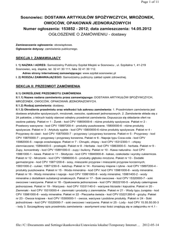 Page 1 of 11 Sosnowiec: DOSTAWA ARTYKUŁÓW SPOśYWCZYCH, MROśONEK, OWOCÓW, OPAKOWAŃ JEDNORAZOWYCH Numer ogłoszenia: 153852 - 2012; data zamieszczenia: 14.05.2012 OGŁOSZENIE O ZAMÓWIENIU - dostawy Zamieszczanie ogłoszenia: obowiązkowe. Ogłoszenie dotyczy: zamówienia publicznego. SEKCJA I: ZAMAWIAJĄCY I. 1) NAZWA I ADRES: Samodzielny Publiczny Szpital Miejski w Sosnowcu , ul. Szpitalna 1, 41-219 Sosnowiec, woj. śląskie, tel. 32 41 30 111, faks 32 41 30 112. Adres strony internetowej zamawiającego: www.szpital.sosnowiec.pl I. 2) RODZAJ ZAMAWIAJĄCEGO: Samodzielny publiczny zakład opieki zdrowotnej. SEKCJA II: PRZEDMIOT ZAMÓWIENIA II.1) OKREŚLENIE PRZEDMIOTU ZAMÓWIENIA II.1.1) Nazwa nadana zamówieniu przez zamawiającego: DOSTAWA ARTYKUŁÓW SPOśYWCZYCH, MROśONEK, OWOCÓW, OPAKOWAŃ JEDNORAZOWYCH. II.1.2) Rodzaj zamówienia: dostawy. II.1.3) Określenie przedmiotu oraz wielkości lub zakresu zamówienia: 1. Przedmiotem zamówienia jest dostawa artykułów spoŜywczych, mroŜonek, owoców, opakowań jednorazowych. 2. Zamówienie składa się z 24 pakietów, z których kaŜdy stanowi odrębny przedmiot zamówienia. Dopuszcza się składanie ofert na osobne pakiety. Pakiet nr 1 - śurek - kod CPV 15800000-6 - róŜne produkty spoŜywcze. Pakiet nr 2 Przetwory warzywne - kod CPV 15897200-4 - produkty puszkowane; 15800000-6 - róŜne produkty spoŜywcze. Pakiet nr 3 - Artykuły sypkie - kod CPV 15800000-6 róŜne produkty spoŜywcze. Pakiet nr 4 Przyprawy do ciast - kod CPV 15870000-7 - przyprawy i przyprawy korzenne. Pakiet nr 5 - Przyprawy - kod CPV 15870000-7 - przyprawy i przyprawy korzenne. Pakiet nr 6 - Napoje typu Coca-cola - kod CPV 15982000-5 - napoje orzeźwiające. Pakiet nr 7 - Chrupki, chipsy - kod CPV 15312300-1 - chipsy ziemniaczane; 15894400-5 - przekąski. Pakiet nr 8 - Herbata - kod CPV 15863000-5 - herbata. Pakiet nr 9 Zupy, koncentraty - kod CPV 15891000-0 - zupy i buliony. Pakiet nr 10 - Kawa naturalna - kod CPV 15861000-1 - kawa. Pakiet nr 11 - Słodycze - kod CPV 15840000-8 - kakao, czekolada i wyroby cukiernicze. Pakiet nr 12 - MroŜonki - kod CPV 15896000-5 - produkty głęboko mroŜone. Pakiet nr 13 - Dodatki garmaŜeryjne - kod CPV 15871200-6 - sosy, mieszanki przypraw i mieszanki przypraw korzennych; 15831000-2 - cukier; 15871230-5 - ketchup. Pakiet nr 14 - Konserwy mięsne i rybne - kod CPV 15897200-4 produkty puszkowane. Pakiet nr 15 - Woda mineralna - kod CPV: kod CPV 15981000-8 - wody mineralne. Pakiet nr 16 - Wody mineralne i napoje - kod CPV 15981000-8 - wody mineralne; 15981400-2 - wody mineralne z dodatkiem substancji smakowych. Pakiet nr 17 - Soki owocowe - kod CPV 15320000-7 - soki owocowe i warzywne. Pakiet nr 18 - Opakowania jednorazowe - kod CPV 39222100-5 - artykuły cateringowe jednorazowe. Pakiet nr 19 - Warzywa - kod CPV 15331140-0 - warzywa liściaste i kapustne. Pakiet nr 20 Ziemniaki - kod CPV 15310000-4 - ziemniaki i produkty z ziemniaków. Pakiet nr 21 - Wody typu Jurajska - kod CPV 15981000-8 - wody mineralne. Pakiet nr 22 - Pieczarka świeŜa - kod CPV 03221260-6 - grzyby. Pakiet nr 23 - Owoce krajowe - kod CPV 15300000-1 - owoce, warzywa i podobne produkty. Pakiet nr 24 - Soki jednodniowe - kod CPV 15320000-7 - soki owocowe i warzywne. Pakiet nr 25 - Lody - kod CPV 15.55.50.00-3 - lody 3. Szczegółowy opis przedmiotu zamówienia - asortyment oraz ilości znajdują się w załączniku nr 4.1 - file://C:\Documents and Settings\ikankowska\Ustawienia lokalne\Temporary Internet ... 2012-05-14 Page 2 of 11 4.25 SIWZ. Zamawiający dopuszcza składanie ofert zawierających rozwiązania równowaŜne. Za towar równowaŜny Zamawiający uwaŜa towar o parametrach jakościowych takich samych lub zbliŜonych, niŜ określone w opisie przedmiotu zamówienia, którego skład jest toŜsamy z zamawianym przez Zamawiającego lub o parametrach i wartościach nie mniejszych i nie gorszych pod względem ilości i wartości odŜywczych produktu. Dla kaŜdego produktu Ŝywnościowego walory smakowe muszą być takie same lub zbliŜone. 4. Wymagania dotyczące zamówienia: 4.1 Wykonawca zobligowany jest do przestrzegania ustawy z dnia 25 sierpnia 2006r. o bezpieczeństwie Ŝywności i Ŝywienia tj. Dz. U. z 2010, Nr 136, poz. 914; 4.2 Wykonawca zobowiązany jest do sukcesywnej dostawy przedmiotu zamówienia wraz z rozładunkiem do wskazanych obiektów szpitalnych tj. przy ul. Szpitalnej 1 i lub ul. Zegadłowicza 3, zgodnie z wyborem Zamawiającego, ściśle wg zamówień telefonicznych; 4.3 Środek transportu dopuszczony do przewozu art. Ŝywnościowych przez Państwową Inspekcję Sanitarną; 4.4 Wszystkie dostawy odbywać się będą na koszt Wykonawcy; 4.5 Oznakowania artykułów Ŝywnościowych, zgodne z dyrektywami Unii Europejskiej i wytycznymi Kodeksu śywnościowego obowiązującego w Europie: - nazwa środka spoŜywczego, - data minimalnej trwałości lub termin przydatności do spoŜycia, - zawartość netto lub liczbę sztuk w opakowaniu, - warunki przechowywania - przy znakowaniu terminem przydatności do spoŜycia oraz w przypadku, gdy jakość środka spoŜywczego w istotny sposób zaleŜy od warunków jego przechowywania, - nazwę i adres producenta, - dane wprowadzające środek spoŜywczy do obrotu w kraju, - kraj w którym wyprodukowano środek spoŜywczy, klasę jakości handlowej lub inny wyróŜnik jakości handlowej o ile określono klasyfikację jakościową, oznakowanie partii produkcyjnej umoŜliwiającej identyfikację środka spoŜywczego. 5. Wymagania szczegółowe: Pakiet nr 1 - zamówienia telefoniczne składane z jednodniowym wyprzedzeniem wg potrzeb, dostawy 1 x w tygodniu wg potrzeb, - art. Ŝywnościowy powinien posiadać oznakowanie terminu przydatności do spoŜycia min. 2 tygodnie w dniu dostawy. Pakiet nr 2 - zamówienia telefonicznie z jednodniowym wyprzedzeniem - dostawy nie rzadziej niŜ raz na tydzień - termin przydatności do spoŜycia nie krótszy niŜ 6 miesięcy w dniu dostawy Pakiet 3, 4, 5 - zamó