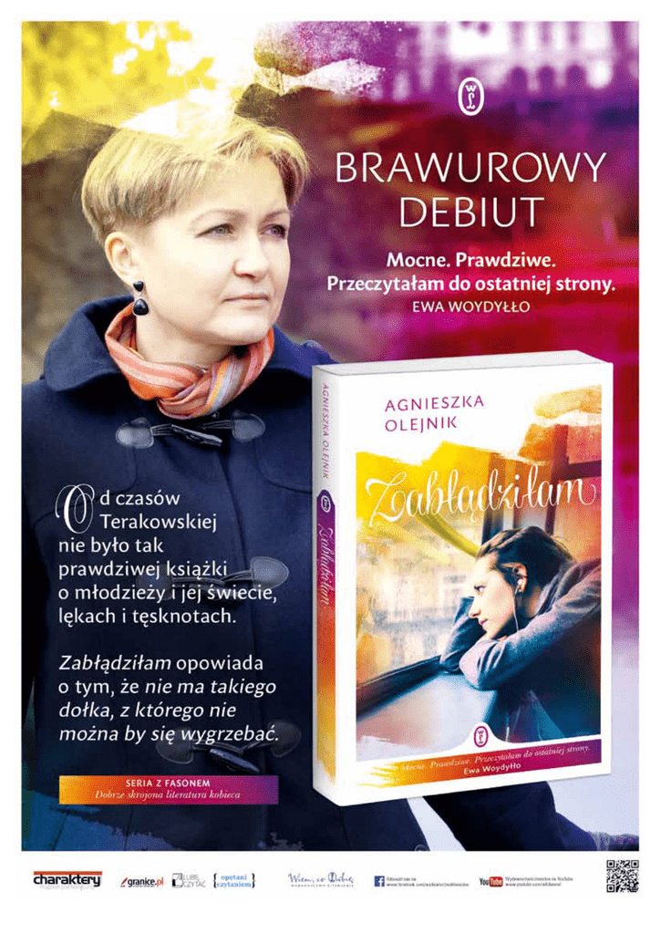 Agnieszki Olejnik to mocny powieściowy debiut, powieść obyczajowa o współczesnej młodzieży – o jej pragnieniach i lękach, o tym, o czym milczy przed dorosłymi. Odważnie podejmująca bardzo trudne, traumatyczne tematy, jak: samobójstwo rodzeństwa, gwałt, depresja rodziców, ale i piękne, i ważne: pierwsza miłość, dorastanie do niej, fizyczność i erotyka. Książka porywająca, przejmująca, autentyczna, porażająca swoją empatycznością, wnikliwością. Napisana niezwykle sprawnie, wręcz filmowo, „wciąga” – czyta się ją po prostu od deski do deski. To powieść, w której odnajdzie się i pokolenie młodzieży, i pokolenie rodziców. KSIĄŻKA, KTÓRA WARTA JEST TEGO, BY USŁYSZAŁO O NIEJ I PRZECZYTAŁO JĄ JAK NAJWIĘCEJ CZYTELNIKÓW. Agnieszka Olejnik wyrazisty debiut agnieszka olejnik Mocne. Prawdziwe. Przeczytałam do ostatniej strony. Ewa Woydyłło Polonistka, anglistka, pedagog. Pochodzi z rodziny „lotniczej”, sama poprzestała na szybownictwie. zakochana w tatrach i jaskiniach Jury Krakowsko-Częstochowskiej. Mama trzech synów. Hoduje wyżły weimarskie, które obok literatury i podróży, są największą jej pasją. Gdy najstarszy syn przeżywał pierwsze miłości, powstała powieść zabłądziłam. Kiedy przeczytał książkę powiedział: Jest świetna. Cholernie prawdziwa, ludzka. smutna, ale podnosząca na duchu. wyjątkowa. to nie jest powieść, to jest jak zeszyt zostawiony po kimś. Przekonująca psychologicznie historia. trudne tematy: bolesne doświadczenia, które dotykają całych pokoleń. skomplikowane relacje między rodzicami i nastolatkami. Pierwsze miłości i budząca się cielesność. Młodzieńcza ciąża i usilne próby wyjścia z traumatycznej przeszłości. wiara w to, że nie ma takiego dołka, z którego nie można by się wygrzebać. Mocne. Prawdziwe. Przeczytałam do ostatniej strony. Ewa Woydyłło ROZMOWA O KSIĄŻCE ZABŁĄDZIŁAM Z AUTORKĄ AGNIESZKĄ OLEJNIK W pani książce odkrywamy świat młodych ludzi daleki od wyobrażeń beztroskiej młodości. Imprezy, alkohol, narkotyki, samobójstwa, gwałty i młodzieńcza ciąża. To nie patologia, wszystko dzieje się w środowisku klasy średniej. Co chciała pani przekazać czytelnikom? Jestem tylko opowiadaczem historii. Czy coś z niej wynika? Zapewne tak i zapewne dla każdego coś innego. Dla niektórych czytelników opowieść ta będzie potwierdzeniem przysłowia: „Nie ma tego złego…”, dla innych dowodem, że nigdy nie jest tak źle, żeby nie mogło być gorzej. I niech tak zostanie, niech każdy przemyśli i przeżyje tę książkę na własny sposób. Czy książka ma wątki autobiograficzne? Myślę, że każda książka je zawiera. Pisarz składa świat powieściowy z elementów sobie znanych, przeżytych albo zaobserwowanych. Nie da się inaczej. Ale tu akurat niewiele jest mojego życia, moich własnych doświadczeń. Może coś z klimatu młodzieńczego buntu – bo byłam okropną nastolatką, bardzo trudną, taką rebeliantką. Na szczęście powodów do tej rebelii miałam znacznie mniej niż Majka. Skąd miała pani tak dobre rozeznanie w gimnazjalno-licealnym środowisku? Nie wiem, czasem myślę, że wolałabym go nie mieć, bo to, co słyszę, nieco mnie przeraża. Jestem polonistką i anglistką, uczę dzieci i młodzież w różnym wieku. Cenię sobie zaufanie, którym mnie darzą moi uczniowie, lubię nasze szczere rozmowy. Z tego, jak bardzo chcą rozmawiać, wnoszę, że rzadko znajdują kogoś, kto by ich wysłuchał, a przy tym nie oceniał. Naprawdę lubię młodych ludzi i kontakt z nimi chyba mnie wewnętrznie odmładza, sprawia, że nie zapominam, jaka sama byłam jako nastolatka. Ale nie podobają mi się zmiany, które dostrzegam. Sporo agresji, wulgaryzacja tego, co powinno być piękne. Nie jest dobrze. Wcześniej pisała pani książki dla starszych dzieci. W tej powieści mamy prawie dorosłych nastolatków. Bohaterowie dorastają. Piszę dla czytelników, których nie da się zamknąć w konkretnym przedziale wiekowym. Jestem przekonana, że Zabłądziłam to książka, którą z jednakowym wzruszeniem przeczyta córka, matka i babcia; co więcej, córka pewnie poleci jej lekturę chłopakowi, a on przeczyta tę opowieść z pałającymi policzkami. Jak zareagowali pani synowie, uczniowie wiekowo bliscy bohaterom, na Zabłądziłam? Kto przeczytał pierwszy? Czy była jakaś wewnętrzna cenzura tekstu? Jedyną osobą z rodziny, której pokazałam tekst, był mój dwudziestoletni syn Wojtek. Nie chodziło mi o jego opinię, chciałam tylko czymś go zająć, bo przebywał wtedy za granicą i tęsknił za domem. Pomyślałam, że podeślę mu pierwsze sto stron. Wkrótce poprosił o całość. Jego opinia mnie zaskoczyła. Napisał mi w mailu: „Książka jest świetna. Cholernie prawdziwa, ludzka. Smutna, ale podnosząca na duchu. Wyjątkowa. To nie jest powieść, to jest jak zeszyt zostawiony po kimś. Takie mam wrażenie”. Rekomendacja Ewy Woydyłło Myślałam, że tylko przejrzę książkę. Tymczasem przeczytałam do ostatniej strony. Najczęstszym zmartwieniem rodziców jest dziś brak szczerych rozmów z dorastającymi dziećmi. „Moja córka nic o sobie nie mówi. Mój syn żyje w swoim świecie, o którym ja nic nie wiem” – skarży się wiele matek, wielu ojców. W tej powieści nastolatki mówią o sobie, zwierzają się, odkrywają sekrety duszy i ciała. Chociaż Majka, Alek, Mateusz nie są naszymi dziećmi, dowiadujemy się, co myśli, czuje, przeżywa niejeden nasz syn, niejedna córka. Mocne. Prawdziwe. Na szczęście to tylko zajrzenie przez dziurkę od klucza w życie powieściowych nastolatków, którym przytrafiły się straszne traumy. Poza tym wycinkowym polem widzenia jest też spokojne, nieburzliwe dorastanie. Dramatów na zapas nie należy się bać… ale poznać je warto. E wa Woy d y ł ło O D CZASÓW TERAKOWSKIEJ NIE BYŁO TAK MOCNEJ I PRAWDZIWEJ KSIĄŻKI O MŁODZIEŻY I 
