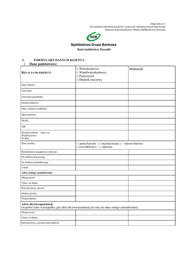Załączniki nr 3 do Instrukcji udzielania kredytów i pożyczek zabezpieczonych hipotecznie klientom indywidualnym w Banku Spółdzielczym Duszniki Bank Spółdzielczy Duszniki I. 1. FORMULARZ DANYCH KLIENTA Dane podstawowe: RELACJA DO KREDYTU □ Wnioskodawca □ Współwnioskodawca □ Poręczyciel □ Dłużnik rzeczowy Małżonek Imię /Imiona Nazwisko Nazwisko panieńskie Imiona rodziców Data i miejsce urodzenia Obywatelstwo PESEL NIP Dowód osobisty – seria i nr Wydany przez : W dniu : Stan cywilny □ panna/kawaler □ mężatka/żonaty □ wdowa/wdowiec □ rozwiedziony/a □ separacja Rozdzielność majątkowa ( tak/nie) Nr telefonu domowego Nr telefonu komórkowego e-mail Adres stałego zameldowania : Miejscowość Ulica i nr domu Kod pocztowy, poczta Gmina, powiat Województwo Adres dla korespondencji (wypełnić tylko w przypadku, gdy adres dla korespondencji jest inny niż adres stałego zameldowania) : Miejscowość Ulica i nr domu Kod pocztowy, poczta/województwo Status zajmowanego domu/lokalu oraz okres zamieszkiwania pod obecnym adresem □ własność □ spółdzielcze własnościowe prawo do lokalu mieszkalnego lub domu jednorodzinnego □ z rodzicami □ najem □ kwaterunkowe (komunalne) □ służbowe □ lokatorskie (spółdzielcze) □ inne |__ Wykształcenie □ □ □ □ □ □ □ podstawowe gimnazjalne zawodowe średnie/ pomaturalne inżynier/ licencjat wyższe inne __________ □ podstawowe □ gimnazjalne □ zawodowe □ średnie/pomaturalne □ inżynier/licencjat □ wyższe □ inne ________________ Stałe obciążenia dochodu z tytułu wyroków sądowych, świadczeń alimentacyjnych – wysokość obciążenia miesięcznego i ostateczny termin spłaty Miesięczne koszty eksploatacji domu/mieszkania (czynsz, woda ,gaz, energia ,c.o., telefon itp.) Miesięczne koszty utrzymania rodziny Liczba osób pozostających we wspólnym gospodarstwie domowym – wspólnie się utrzymujących Zobowiązania podatkowe – zaległe /kwota/ i bieżące /wysokość zobowiązania miesięcznego/ Nazwa i adres pracodawcy Nr telefonu Stanowisko/zawód/wykonywany Staż pracy Prowadzona działalność gospodarcza ( nazwa , rodzaj i forma działalności) Okres prowadzonej działalności Źródło dodatkowych dochodów i miesięczny dodatkowy dochód netto II. INFORMACJE O POSIADANYM MAJĄTKU : Wyszczególnienie Dom/mieszkanie ( adres, powierzchnia) Grunty ( położenie ,powierzchnia , forma własności) Grunty rolne________________________________________________________________________ Działki budowlane___________________________________________________________________ grunty po aktywizację gospodarczą _____________________________________________________ pozostałe grunty_____________________________________________________________________ Samochody ( marka, rok produkcji) Rachunki bankowe ( podać bank ,rodzaj rachunku: ROR ,bieżący, lokata terminowa) Udziały ,akcje w spółkach ( nazwa spółki, wielkość udziałów ,ilość akcji) Posiadane polisy na życie ( nazwa towarzystwa ubezpieczeniowego, suma ubezpieczenia) Wartość Posiadane jednostki uczestnictwa TFI (kwota ,nazwa Funduszu) III. POSIADANE ZOBOWIĄZANIA FINANSOWE 1. Zaciągnięte kredyty/ pożyczki Rodzaj kredytu/pożyczki* nazwa Banku /Oddziału 2. Miesięczna Data wysokość raty zaciągnięcia zobowiązania (data umowy) Data całkowitej spłaty zobowiązania Zabezpieczenie Przyznane limity kredytowe Kwota ,waluta przyznanego limitu 3. Kwota, waluta aktualnego zadłużenia Nazwa Banku /Oddziału Data zaciągnięcia zobowiązania(data umowy) Data spłaty zobowiązania (data z umowy) Zobowiązania z tytułu udzielonych poręczeń Kredyt/pożyczka* nazwa Banku /Oddziału Kwota, waluta aktualnego zadłużenia Miesięczna wysokość raty Data zaciągnięcia zobowiązania (data umowy) Data spłaty zobowiązania (data umowy) 4. Inne zobowiązania Tak/nie* ____________________________________________________________________________________________________ ( podać tytuł zobowiązania, rodzaj zobowiązania, kwotę obecnego zadłużenia, datę zaciągnięcia zobowiązania i datę spłaty) Ubiegam się o kredyt/pożyczkę w innym Banku tak/nie* ____________________________________________________________________________________________________ ( podać nazwę banku i adres oddziału) Korespondencja: zgoda tylko na materiały informacyjne brak ograniczeń brak zgody na materiały informacyjne Oświadczam, że moja kondycja finansowa jest/ nie jest uzależniona pośrednio lub bezpośredni od powiązania z członkiem organu banku (Zarządu, Rady Nadzorczej) lub osobą zajmującą stanowisko kierownicze w banku (pracownik banku podlegający bezpośrednio członkom Zarządu oraz dyrektorzy oddziałów banku, ich zastępcy i główni księgowi). Rodzaj powiązania_____________________________________________________________________________________ Bank Spółdzielczy Duszniki .zgodnie z art. 24 ust. 1 Ustawy z dnia 29 sierpnia 1997 r. o ochronie danych osobowych (j. t. Dz. U. z 2002 r., nr 101, poz. 926 z późn. zm.) informuje, iż jest Administratorem podanych przez Pana/ Panią danych osobowych. Dane będą przetwarzane przez bank w celu oceny zdolności kredytowej oraz analizy ryzyka kredytowego, zawierania i wykonywania czynności bankowych, a także w celu promocji i marketingu działalności prowadzonej przez Bank. Na podstawie art. 32 ustawy o ochronie danych osobowych ma Pan/Pani prawo do dostępu do treści oraz poprawiania swoich danych, w szczególności ich uaktualnienia, sprostowania, poprawienia. Podanie danych jest dobrowolne, jednakże ich podanie warunkuje wykonanie czynności bankowych. Bank informuje, iż: 1) na podstawie art. 105 ust. 4 ustawy z dnia 29 sierpnia 1997 r. Prawo bankowe (Dz. U. 2002 r. nr 72, poz. 665 z późn. zm.) podane przez Pana/Panią dane, Bank będzie przekazywał do Biura Informacji Kredytowej S.A. z siedzibą w Warszawie – Biuro Obsługi Klienta przy ul. Postępu 17