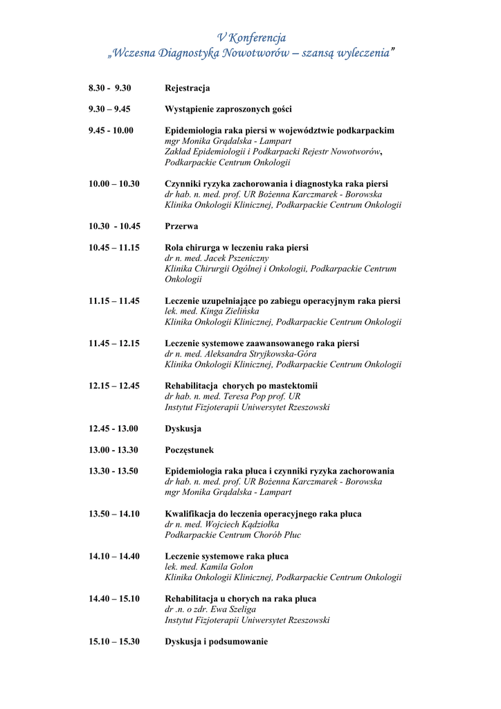 V Konferencja „Wczesna Diagnostyka Nowotworów – szansą wyleczenia” 8.30 - 9.30 Rejestracja 9.30 – 9.45 Wystąpienie zaproszonych gości 9.45 - 10.00 Epidemiologia raka piersi w województwie podkarpackim mgr Monika Grądalska - Lampart Zakład Epidemiologii i Podkarpacki Rejestr Nowotworów, Podkarpackie Centrum Onkologii 10.00 – 10.30 Czynniki ryzyka zachorowania i diagnostyka raka piersi dr hab. n. med. prof. UR Bożenna Karczmarek - Borowska Klinika Onkologii Klinicznej, Podkarpackie Centrum Onkologii 10.30 - 10.45 Przerwa 10.45 – 11.15 Rola chirurga w leczeniu raka piersi dr n. med. Jacek Pszeniczny Klinika Chirurgii Ogólnej i Onkologii, Podkarpackie Centrum Onkologii 11.15 – 11.45 Leczenie uzupełniające po zabiegu operacyjnym raka piersi lek. med. Kinga Zielińska Klinika Onkologii Klinicznej, Podkarpackie Centrum Onkologii 11.45 – 12.15 Leczenie systemowe zaawansowanego raka piersi dr n. med. Aleksandra Stryjkowska-Góra Klinika Onkologii Klinicznej, Podkarpackie Centrum Onkologii 12.15 – 12.45 Rehabilitacja chorych po mastektomii dr hab. n. med. Teresa Pop prof. UR Instytut Fizjoterapii Uniwersytet Rzeszowski 12.45 - 13.00 Dyskusja 13.00 - 13.30 Poczęstunek 13.30 - 13.50 Epidemiologia raka płuca i czynniki ryzyka zachorowania dr hab. n. med. prof. UR Bożenna Karczmarek - Borowska mgr Monika Grądalska - Lampart 13.50 – 14.10 Kwalifikacja do leczenia operacyjnego raka płuca dr n. med. Wojciech Kądziołka Podkarpackie Centrum Chorób Płuc 14.10 – 14.40 Leczenie systemowe raka płuca lek. med. Kamila Golon Klinika Onkologii Klinicznej, Podkarpackie Centrum Onkologii 14.40 – 15.10 Rehabilitacja u chorych na raka płuca dr .n. o zdr. Ewa Szeliga Instytut Fizjoterapii Uniwersytet Rzeszowski 15.10 – 15.30 Dyskusja i podsumowanie