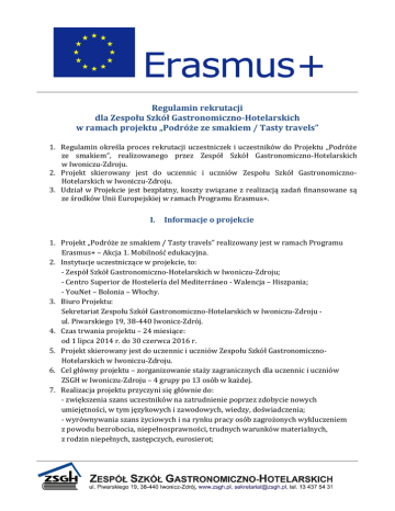 Regulamin rekrutacji dla Zespołu Szkół Gastronomiczno-Hotelarskich w ramach projektu „Podróże ze smakiem / Tasty travels” 1. Regulamin określa proces rekrutacji uczestniczek i uczestników do Projektu „Podróże ze smakiem”, realizowanego przez Zespół Szkół Gastronomiczno-Hotelarskich w Iwoniczu-Zdroju. 2. Projekt skierowany jest do uczennic i uczniów Zespołu Szkół GastronomicznoHotelarskich w Iwoniczu-Zdroju. 3. Udział w Projekcie jest bezpłatny, koszty związane z realizacją zadań finansowane są ze środków Unii Europejskiej w ramach Programu Erasmus+. I. Informacje o projekcie 1. Projekt „Podróże ze smakiem / Tasty travels” realizowany jest w ramach Programu Erasmus+ – Akcja 1. Mobilność edukacyjna. 2. Instytucje uczestniczące w projekcie, to: - Zespół Szkół Gastronomiczno-Hotelarskich w Iwoniczu-Zdroju; - Centro Superior de Hostelería del Mediterráneo - Walencja – Hiszpania; - YouNet – Bolonia – Włochy. 3. Biuro Projektu: Sekretariat Zespołu Szkół Gastronomiczno-Hotelarskich w Iwoniczu-Zdroju ul. Piwarskiego 19, 38-440 Iwonicz-Zdrój. 4. Czas trwania projektu – 24 miesiące: od 1 lipca 2014 r. do 30 czerwca 2016 r. 5. Projekt skierowany jest do uczennic i uczniów Zespołu Szkół GastronomicznoHotelarskich w Iwoniczu-Zdroju. 6. Cel główny projektu – zorganizowanie staży zagranicznych dla uczennic i uczniów ZSGH w Iwoniczu-Zdroju – 4 grupy po 13 osób w każdej. 7. Realizacja projektu przyczyni się głównie do: - zwiększenia szans uczestników na zatrudnienie poprzez zdobycie nowych umiejętności, w tym językowych i zawodowych, wiedzy, doświadczenia; - wyrównywania szans życiowych i na rynku pracy osób zagrożonych wykluczeniem z powodu bezrobocia, niepełnosprawności, trudnych warunków materialnych, z rodzin niepełnych, zastępczych, eurosierot; - podnoszenia umiejętności samodzielnego zdobywania wiedzy - uświadamianie korzyści, jakie daje rozwijanie umiejętności zawodowych i podnoszenie kwalifikacji, stosowanie zdobytej wiedzy w praktyce; - poznania smaków i przepisów kuchni regionalnych i narodowych, organizacji pracy i form promocji zagranicznych obiektów gastronomicznych i hotelarskich; - umiejętności radzenia sobie w nowych sytuacjach, w obcym kulturowo środowisku otwarcie na innych ludzi, kulturę, obyczaje - zwiększenie wiary we własne możliwości; - rozwijania umiejętności dzielenia się wiedzą i doświadczeniem w środowisku szkolnym i lokalnym. II. Warunki uczestnictwa w projekcie 1. Uczestnikami projektu mogą być uczennice i uczniowie Zespołu Szkół GastronomicznoHotelarskich w Iwoniczu-Zdroju. 2. Uczestnikiem stażu może być osoba, która: a) Dostarczyła do Biura Projektu: - Formularz zgłoszeniowy (Załącznik nr 1) - Deklarację uczestnictwa w projekcie (Załącznik nr 2) - Oświadczenie o wyrażeniu zgody na przetwarzanie danych osobowych (Załącznik nr 3) b) Została zakwalifikowana do udziału w projekcie przez Komisję Rekrutacyjną. 3. PROCEDURA NABORU: - podanie informacji o projekcie i zasadach naboru na tablicy ogłoszeń i szkolnej stronie internetowej: www.zsgh.pl; - przyjmowanie pisemnych zgłoszeń na specjalnie przygotowanych do celów projektu formularzach, podpisanych przez uczniów i ich opiekunów, z dołączoną opinią wychowawcy klasy i nauczyciela przedmiotów zawodowych; - kwalifikacja uczestników stażu przez komisję na podstawie złożonych formularzy zgłoszeniowych i rozmowy kwalifikacyjnej w języku angielskim; - ogłoszenie listy beneficjentów i listy rezerwowej na tablicy ogłoszeń i szkolnej stronie internetowej: www.zsgh.pl. 4. KRYTERIA NABORU: - dobre wyniki w nauce (średnia ocen); - dobra znajomość przedmiotów zawodowych (średnia ocen z przedmiotów zawodowych); - umiejętność komunikacji w języku angielskim (ocena z języka angielskiego); - stosunek do obowiązków szkolnych (frekwencja); - umiejętność komunikacji i pracy w grupie (opinia wychowawcy klasy); - wysokie umiejętności praktyczne (opinia nauczyciela przedmiotów zawodowych). 5. Średnie ocen uzyskane w ostatnim półroczu będą punktowane następująco: Średnia ocen Liczba punktów 4,75 – 6,00 5 4,50 – 4,74 4 4,00 – 4,49 3 3,50 – 3,99 2 3,00 – 3,49 1 1,00 – 2,99 0 6. Semestralna ocena z języka angielskiego będzie odpowiadała następującej liczbie punktów: Ocena Liczba punktów Celujący Bardzo dobry Dobry Dostateczny Dopuszczający Niedostateczny 5 4 3 2 1 0 7. Frekwencja zostanie przeliczona na punkty według tabeli: Frekwencja w % 95 - 100 90 - 94 85 - 89 80 - 84 75 - 79 70 - 74 Liczba punktów 5 4 3 2 1 0 8. Umiejętność komunikacji i pracy w grupie przedstawiona zostanie w formie opinii wychowawcy klasy i oceny punktowej w skali od 1 do 5 punktów. 9. Wysokie umiejętności praktyczne określi nauczyciel przedmiotów zawodowych w formie opinii i oceny punktowej w skali od 1 do 5 punktów. 10. Maksymalna ilość punktów do uzyskania – 30. 11. Do udziału w drugim etapie rekrutacji (rozmowa kwalifikacyjna w języku angielskim) zostaną zakwalifikowani uczniowie, którzy zdobędą największą ilość punktów (według podziału na zawody). 12. W każdej grupie wyjeżdżającej na staż znajdą się przedstawiciele różnych zawodów. III. Przebieg procesu rekrutacji 1. Informacja o naborze zostanie umieszczona na stronie internetowej projektu www.zsgh.pl, w Biurze Projektu oraz w gablocie poświęconej projektowi. 2. Rekrutacja prowadzona będzie w sposób bezstronny, z poszanowaniem zasady równości płci. 3. Rekrutacja do projektu będzie prowadzona cyklicznie. 4. Informacje o terminie rekrutacji dostępne będą na stronie internetowej ZSGH w Iwoniczu-Zdroju, w Biurze Projektu i w gablocie projektu. 5. Rekrutacja prowadzona będzie w następujących etapach: a) przyjmowanie formularzy zgłoszeniowych b) weryfikacja formalna złożonych dokumentów (sprawdzenie pod względem kompletności składanych załączników) c) ocena dok