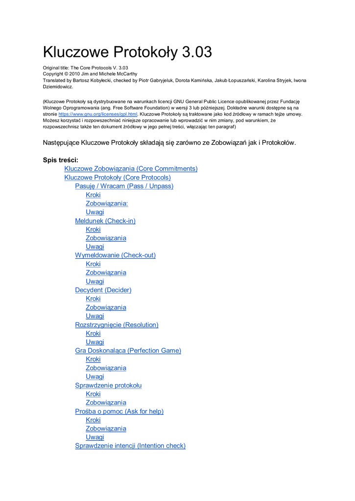 Kluczowe Protokoły 3.03 Original title: The Core Protocols V. 3.03 Copyright © 2010 Jim and Michele McCarthy Translated by Bartosz Kobyłecki, checked by Piotr Gabryjeluk, Dorota Kamińska, Jakub Łopuszański, Karolina Stryjek, Iwona Dziemidowicz. (Kluczowe Protokoły są dystrybuowane na warunkach licencji GNU General Public Licence opublikowanej przez Fundację Wolnego Oprogramowania (ang. Free Software Foundation) w wersji 3 lub późniejszej. Dokładne warunki dostępne są na stronie https://www.gnu.org/licenses/gpl.html. Kluczowe Protokoły są traktowane jako kod źródłowy w ramach tejże umowy. Możesz korzystać i rozpowszechniać niniejsze opracowanie lub wprowadzić w nim zmiany, pod warunkiem, że rozpowszechnisz także ten dokument źródłowy w jego pełnej treści, włączając ten paragraf) Następujące Kluczowe Protokoły składają się zarówno ze Zobowiązań jak i Protokołów. Spis treści: Kluczowe Zobowiązania (Core Commitments) Kluczowe Protokoły (Core Protocols) Pasuję / Wracam (Pass / Unpass) Kroki Zobowiązania: Uwagi Meldunek (Check-in) Kroki Zobowiązania Uwagi Wymeldowanie (Check-out) Kroki Zobowiązania Uwagi Decydent (Decider) Kroki Zobowiązania Uwagi Rozstrzygnięcie (Resolution) Kroki Uwagi Gra Doskonaląca (Perfection Game) Kroki Zobowiązania Uwagi Sprawdzenie protokołu Kroki Zobowiązania Prośba o pomoc (Ask for help) Kroki Zobowiązania Uwagi Sprawdzenie intencji (Intention check) Kroki Zobowiązania Uwagi Badanie (Investigate) Kroki Zobowiązania Uwagi Zestrojenie Osobiste (Personal Alignment) Kroki Zobowiązania Uwagi Kluczowe zastosowania (Core Apps) Spotkanie (Meet) Cel Kroki Zobowiązania Uwagi Wysłuchanie (Listen) Cel Kroki Zobowiązania Uwagi Kluczowe Zobowiązania (Core Commitments) 1. Zobowiązuję się do bycia zaangażowanym/ą podczas mojej obecności. ○ Aby wiedzieć i ujawnić i. czego chcę, ii. co myślę, iii. co czuję. ○ Zawsze szukać efektywnej pomocy. ○ Nie wysyłać niespójnych przekazów emocjonalnych i zarazem nie akceptować ich u innych. ○ Kiedy ja lub ktoś inny będzie mieć lepszy niż obecnie obowiązujący pomysł, wtedy natychmiast: i. Poddam go pod decydujące głosowanie, i/lub ii. Otwarcie będę poszukiwać jego usprawnień. ○ Będę osobiście wspierać najlepszy pomysł: i. niezależnie od jego źródła, ii. niezależnie jak dużą mam nadzieję, że później pojawi się lepszy pomysł, oraz iii. kiedy nie mam lepszego alternatywnego pomysłu. 2. Będę nastawiony/a na dostrzeganie innych bardziej niż na bycie dostrzeżonym/ą. 3. Wykorzystam pracę zespołową, szczególnie przy podejmowaniu trudnych zadań. 4. Będę mówić wtedy i tylko wtedy, gdy będę wierzył/a, że poprawi to ogólny stosunek rezultatów do wysiłku. 5. Będę zachowywał i komunikował się tylko w racjonalny i zorientowany na wyniki sposób. 6. Przestanę brać udział w mało produktywnych sytuacjach ○ Kiedy nie będę potrafił/a dotrzymać niniejszych Kluczowych Zobowiązań, ○ Kiedy moje zaangażowanie będzie bardziej potrzebne gdzie indziej. 7. Zrobię teraz to, co i tak musi być kiedyś zrobione, a już teraz może być zrobione efektywnie. 8. Będę zmierzać w kierunku konkretnego celu przez preferowanie działania ponad zachowawczość. 9. Będę korzystał/a z Kluczowych Zobowiązań (lub lepszych) kiedy to możliwe. ○ Będę oferować i akceptować adekwatne i właściwe użycie protokołu Sprawdzenie Protokołu bez uprzedzeń. 10. Nie skrzywdzę—ani nie będę tolerować krzywdzenia—nikogo za uznawanie tych Zobowiązań. 11. Nigdy nie zrobię celowo niczego głupiego. Kluczowe Protokoły (Core Protocols) Pasuję / Wracam (Pass / Unpass) Kroki 1. Kiedy zdecydowałeś/aś się w czymś nie uczestniczyć, mówisz: Pasuję. 2. W dowolnym momencie możesz to odwrócić i powiedzieć: „Wracam”, gdy wiesz, że chcesz ponownie uczestniczyć. Zobowiązania: ● ● Powody użycia Pasuję pozostaw dla siebie. Użyj Pasuję od razu, jak tylko się na to zdecydujesz - nie zwlekaj. Uwagi ● ● ● ● ● ● Nie będziesz w zgodzie z Kluczowymi Zobowiązaniami, jeśli będziesz ciągle używał/a Pasuję. Możesz użyć Pasuję względem dowolnej aktywności; niemniej, jeśli zaadoptowałeś/aś Kluczowe Zobowiązania, nie możesz użyć Pasuję podczas głosowania w protokole Decydent oraz musisz powiedzieć „Obecny/a”, gdy rozpocząłeś protokół Meldunek. Możesz użyć Pasuję nawet jeśli coś już zacząłeś/aś robić. Szanuj prawo innych do użycia Pasuję bez wytłumaczenia. Wspieraj innych, którzy użyli Pasuję, poprzez nie dyskutowanie o tym. Nie oceniaj, nie ośmieszaj, nie sprawiaj kłopotu, nie przesłuchuj i nie karz tych, którzy użyli Pasuję. Meldunek (Check-in) Użyj protokołu Meldunek, aby rozpocząć spotkanie lub kiedykolwiek, gdy indywidualne lub grupowe przyznanie obecności wniesie wartość w bieżącą interakcję zespołu. Kroki 1. Osoba mówi: „Jestem [jedno lub więcej słów z listy: ZŁY, SMUTNY, ZADOWOLONY, PRZESTRASZONY]”. Może dodać krótkie wytłumaczenie. Alternatywnie może powiedzieć Pasuję, jeśli inni już wcześniej się zameldowali. 2. Osoba mówi „Obecny/a”- to oznacza, że będzie swoim zachowaniem zgodna z Kluczowymi Zobowiązaniami. 3. Pozostali mówią: Cześć/Witaj. Zobowiązania ● ● ● ● Wyrażaj emocje bez żadnych warunków. Wyrażaj emocje, które dotyczą Ciebie. Zachowaj ciszę, podczas gdy inni wyrażają obecność. Nie odnoś się do wyrażania obecności innych osób bez jawnej zgody od nich. Uwagi ● ● ● ● ● W kontekście Kluczowych Protokołów, wszystkie emocje są wyrażane przez użycie kombinacji ZŁY, SMUTNY, ZADOWOLONY, PRZESTRASZONY. Na przykład „podekscytowany” może być kombinacją ZADOWOLONY i PRZESTRASZONY. Wykonaj protokół Meldunek najlepiej jak potrafisz. Używanie dwóch lub więcej emocji jest normą. Wnikliwość w wyrażeniu obecności przez grupę ma bezpośredni z
