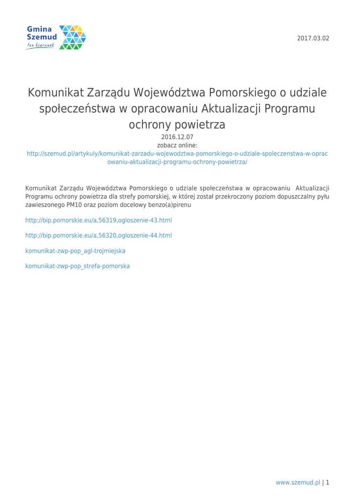 2017.03.02 Komunikat Zarządu Województwa Pomorskiego o udziale społeczeństwa w opracowaniu Aktualizacji Programu ochrony powietrza 2016.12.07 zobacz online: http://szemud.pl/artykuly/komunikat-zarzadu-wojewodztwa-pomorskiego-o-udziale-spoleczenstwa-w-oprac owaniu-aktualizacji-programu-ochrony-powietrza/ Komunikat Zarządu Województwa Pomorskiego o udziale społeczeństwa w opracowaniu Aktualizacji Programu ochrony powietrza dla strefy pomorskiej, w której został przekroczony poziom dopuszczalny pyłu zawieszonego PM10 oraz poziom docelowy benzo(a)pirenu http://bip.pomorskie.eu/a,56319,ogloszenie-43.html http://bip.pomorskie.eu/a,56320,ogloszenie-44.html komunikat-zwp-pop_agl-trojmiejska komunikat-zwp-pop_strefa-pomorska www.szemud.pl | 1