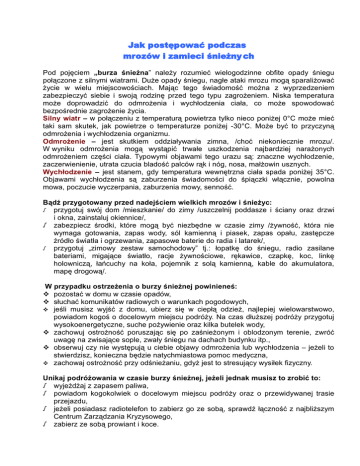 Jak postępować podczas mrozów i zamieci śnieżny ch Pod pojęciem „burza śnieżna” należy rozumieć wielogodzinne obfite opady śniegu połączone z silnymi wiatrami. Duże opady śniegu, nagłe ataki mrozu mogą sparaliżować życie w wielu miejscowościach. Mając tego świadomość można z wyprzedzeniem zabezpieczyć siebie i swoją rodzinę przed tego typu zagrożeniem. Niska temperatura może doprowadzić do odmrożenia i wychłodzenia ciała, co może spowodować bezpośrednie zagrożenie życia. Silny wiatr – w połączeniu z temperaturą powietrza tylko nieco poniżej 0°C może mieć taki sam skutek, jak powietrze o temperaturze poniżej -30°C. Może być to przyczyną odmrożenia i wychłodzenia organizmu. Odmrożenie – jest skutkiem oddziaływania zimna, /choć niekoniecznie mrozu/. W wyniku odmrożenia mogą wystąpić trwałe uszkodzenia najbardziej narażonych odmrożeniem części ciała. Typowymi objawami tego urazu są: znaczne wychłodzenie, zaczerwienienie, utrata czucia bladość palców rąk i nóg, nosa, małżowin usznych. Wychłodzenie – jest stanem, gdy temperatura wewnętrzna ciała spada poniżej 35°C. Objawami wychłodzenia są zaburzenia świadomości do śpiączki włącznie, powolna mowa, poczucie wyczerpania, zaburzenia mowy, senność. Bądź przygotowany przed nadejściem wielkich mrozów i śnieżyc: √ przygotuj swój dom /mieszkanie/ do zimy /uszczelnij poddasze i ściany oraz drzwi i okna, zainstaluj okiennice/, √ zabezpiecz środki, które mogą być niezbędne w czasie zimy /żywność, która nie wymaga gotowania, zapas wody, sól kamienną i piasek, zapas opału, zastępcze źródło światła i ogrzewania, zapasowe baterie do radia i latarek/, √ przygotuj „zimowy zestaw samochodowy” tj.: łopatkę do śniegu, radio zasilane bateriami, migające światło, racje żywnościowe, rękawice, czapkę, koc, linkę holowniczą, łańcuchy na koła, pojemnik z solą kamienną, kable do akumulatora, mapę drogową/. W przypadku ostrzeżenia o burzy śnieżnej powinieneś: pozostać w domu w czasie opadów, słuchać komunikatów radiowych o warunkach pogodowych, jeśli musisz wyjść z domu, ubierz się w ciepłą odzież, najlepiej wielowarstwowo, powiadom kogoś o docelowym miejscu podróży. Na czas dłuższej podróży przygotuj wysokoenergetyczne, suche pożywienie oraz kilka butelek wody, zachowuj ostrożność poruszając się po zaśnieżonym i oblodzonym terenie, zwróć uwagę na zwisające sople, zwały śniegu na dachach budynku itp., obserwuj czy nie występują u ciebie objawy odmrożenia lub wychłodzenia – jeżeli to stwierdzisz, konieczna będzie natychmiastowa pomoc medyczna, zachowaj ostrożność przy odśnieżaniu, gdyż jest to stresujący wysiłek fizyczny. Unikaj podróżowania w czasie burzy śnieżnej, jeżeli jednak musisz to zrobić to: √ wyjeżdżaj z zapasem paliwa, √ powiadom kogokolwiek o docelowym miejscu podróży oraz o przewidywanej trasie przejazdu, √ jeżeli posiadasz radiotelefon to zabierz go ze sobą, sprawdź łączność z najbliższym Centrum Zarządzania Kryzysowego, √ zabierz ze sobą prowiant i koce. Jeżeli utknąłeś w drodze: • pozostań w samochodzie, nie szukaj sam pomocy, chyba, że pomoc jest w widocznej odległości, • umocuj na antenie lub dachu samochodu jaskrawą część ubrania /najlepiej koloru czerwonego/ tak, aby była widoczna dla ratowników, • okryj się kocem i uruchamiaj silnik, co godzinę na 10 minut włączając ogrzewanie i zewnętrzne światła samochodu /aby, uniknąć zatrucia spalinami sprawdź czy rura wydechowa jest wolna od śniegu oraz dla wentylacji uchyl lekko okna/, • ogrzewanie samochodu wykorzystuj oszczędnie, uważając jednak by nie rozładować akumulatora, • siedząc w samochodzie, co jakiś czas poruszaj ramionami i nogami w celu utrzymania normalnego obiegu krwi. Zwracaj uwagę na oznaki odmrożeń lub wychłodzenia organizmu, • unikaj nadmiernego lub zbędnego wysiłku. Zimne otoczenie powoduje dodatkowe obciążenie dla serca. Nadmierny wysiłek, taki jak odgarnianie śniegu albo pchanie samochodu może spowodować zdrowotne dolegliwości. • jeżeli w samochodzie jest więcej osób to powinny się zgromadzić koło siebie dla utrzymania ciepła. Pamiętaj! Nie uznawaj pochopnie osoby wyziębionej za zmarłą. Udziel pomocy osobie wyziębionej, poszukaj natychmiastowej pomocy medycznej a przed nadejściem pomocy medycznej rozpocznij powolne ogrzewanie osoby, zdejmij przemarznięte ubrania, ułóż osobę na suchej tkaninie i okryj całe ciało kocem i folią aluminiową, ogrzewaj dodatkowo swoim ciałem. Przy odmrożeniach kończyn, zanurz je w letniej wodzie o temperaturze ciała zdrowego człowieka. Na inne odmrożenia ciała nakładaj ciepłe /nie gorące!/ okłady. Nie podawaj alkoholu i kawy osobie odmrożonej lub wychłodzonej, aby nie doprowadzić do większej utraty ciepłoty ciała. O wszystkich zdarzeniach, mających istotne znaczenie dla bezpieczeństwa ludzi informuj: Straż Pożarną tel.: - 998, Policję tel.: - 997, Pogotowie ratunkowe tel.: - 999, Telefon alarmowy dla wszystkich służb tel.: - 112 albo Urząd Gminy Oława tel. 0-71/3133044 w godzinach urzędowania, po godzinach pracy oraz w dni wolne tel.: 0516085641 lub 0516085643.