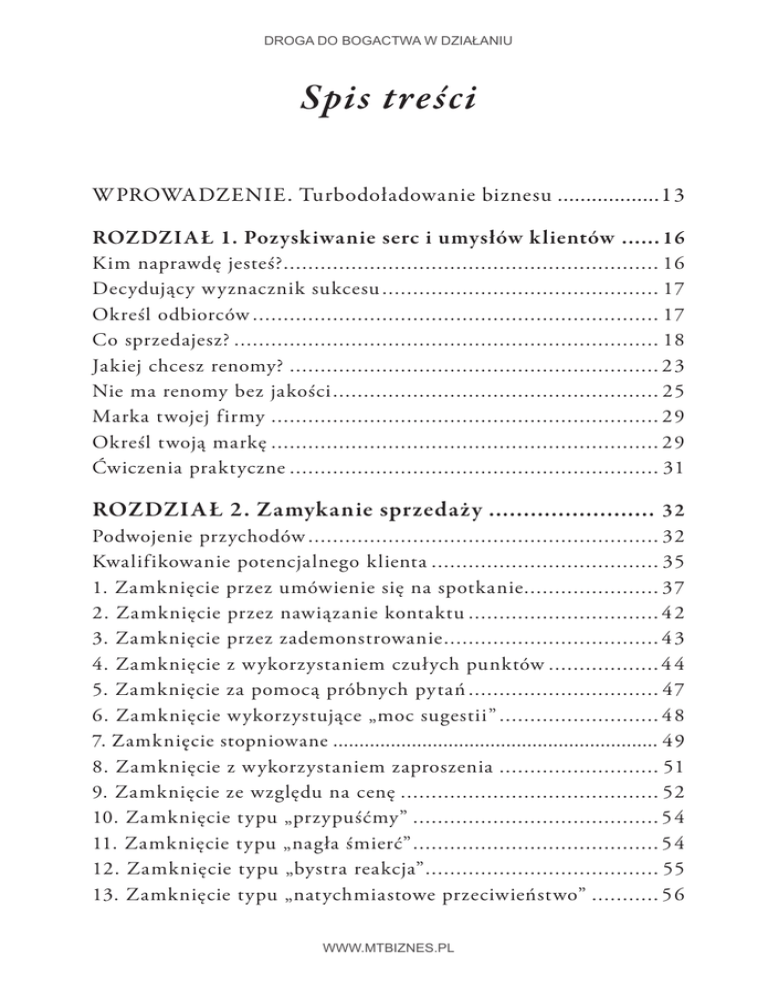 Droga do bogactwa w działaniu Spis treści WPROWADZENIE. Turbodoładowanie biznesu...................13 ROZDZIAŁ 1. Pozyskiwanie serc i umysłów klientów....... 16 Kim naprawdę jesteś?.. ............................................................ 16 Decydujący wyznacznik sukcesu.. ............................................ 17 Określ odbiorców................................................................... 17 Co sprzedajesz?...................................................................... 18 Jakiej chcesz renomy?............................................................. 2 3 Nie ma renomy bez jakości.. .................................................... 25 Marka twojej firmy................................................................ 29 Określ twoją markę................................................................ 29 Ćwiczenia praktyczne............................................................. 31 ROZDZIAŁ 2. Zamykanie sprzedaży......................... 3 2 Podwojenie przychodów.. ........................................................ 32 Kwalifikowanie potencjalnego klienta...................................... 35 1. Zamknięcie przez umówienie się na spotkanie...................... 37 2. Zamknięcie przez nawiązanie kontaktu................................ 4 2 3. Zamknięcie przez zademonstrowanie.. .................................. 4 3 4. Zamknięcie z wykorzystaniem czułych punktów................... 4 4 5. Zamknięcie za pomocą próbnych pytań.. .............................. 47 6. Zamknięcie wykorzystujące „moc sugestii”.. ......................... 4 8 7. Zamknięcie stopniowane............................................................... 4 9 8. Zamknięcie z wykorzystaniem zaproszenia........................... 51 9. Zamknięcie ze względu na cenę........................................... 52 10. Zamknięcie typu „przypuśćmy”......................................... 5 4 11. Zamknięcie typu „nagła śmierć”.. ....................................... 5 4 12. Zamknięcie typu „bystra reakcja”.. ..................................... 55 13. Zamknięcie typu „natychmiastowe przeciwieństwo”............ 5 6 www.mtbiznes.pl Droga do bogactwa w działaniu 14. Zamknięcie typu „zamieńmy się miejscami”....................... 57 15. Zamknięcie z drugorzędnego powodu.. ............................... 58 16. Zamknięcie alternatywne.................................................. 58 17. Zamknięcie preferencyjne.................................................. 59 18. Zamknięcie zakładające decyzję o zakupie.......................... 59 19. Zamknięcie typu „to ostatni egzemplarz”.. .......................... 6 0 20. Zamknięcie „na szczeniaka”.............................................. 61 21. Zamknięcie na wzór Bena Franklina.. ................................. 6 4 22. Zamknięcie podsumowujące....................................................... 6 6 23. Zamknięcie z użyciem formularza zamówienia.. ........................ 67 24. Zamknięcie z użyciem stosownej opowieści............................... 6 8 25. Zamknięcie z użyciem klamki.. ................................................... 6 8 26. Zamknięcie referencyjne............................................................. 6 9 Ćwiczenia praktyczne........................................................................ 7 3 ROZDZIAŁ 3. Nie ma firmy bez ludzi.............................. 74 Umiejętność budowania sieci kontaktów.. .........................................74 Początek drogi do bogactwa.............................................................. 76 Potęga mistrza umysłu....................................................................... 7 7 Znajdowanie właściwych ludzi.......................................................... 81 Złoty trójkąt naboru pracowników................................................... 8 3 Zasada trzech w naborze pracowników............................................ 8 6 Dwa wskaźniki sukcesu..................................................................... 9 0 Delegowanie i nadzorowanie – pięć kroków.. ....................................91 Zarządzanie i motywowanie – pięć czynników.. .............................. 9 2 Budowanie zespołu.. ........................................................................... 9 3 Znajdowanie najlepszych ludzi.......................................................... 9 8 Zwalnianie nieprzydatnych pracowników...................................... 10 0 Psychologia przywództwa................................................................ 103 Ćwiczenia praktyczne...................................................................... 10 4 ROZDZIAŁ 4. Wybór właściwej lokalizacji.. ................... 10 6 Lokalizacja firmy............................................................................. 106 www.mtbiznes.pl Droga do bogactwa w działaniu Celem jest większa sprzedaż............................................................ 108 Kupowanie musi być łatwe.............................................................. 109 Szukaj klientów tam, gdzie oni są....................................................110 Płyń z prądem.. ..................................................................................111 Pytania, które musisz sobie zadać................................................... 112 Sprzedaż w internecie...................................................................... 120 Ćwiczenia praktyczne...................................................................... 121 ROZDZIAŁ 5. Korzystny wygląd sprzyja zyskom............ 123 Efekty kupienia złego produktu...................................................... 123 Opakowanie twoich produktów i usług.......................................... 132 Twoje biuro a klienci.. ...................................................