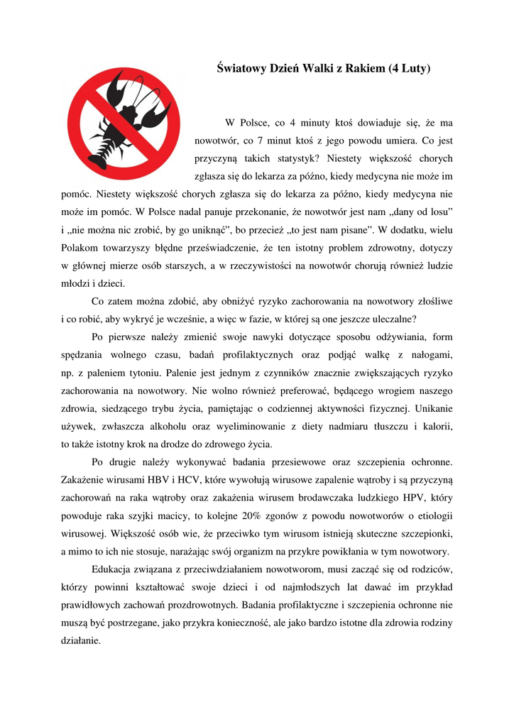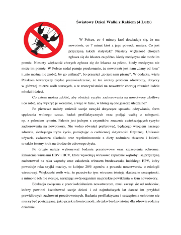 Światowy Dzień Walki z Rakiem (4 Luty) W Polsce, co 4 minuty ktoś dowiaduje się, że ma nowotwór, co 7 minut ktoś z jego powodu umiera. Co jest przyczyną takich statystyk? Niestety większość chorych zgłasza się do lekarza za późno, kiedy medycyna nie może im pomóc. Niestety większość chorych zgłasza się do lekarza za późno, kiedy medycyna nie może im pomóc. W Polsce nadal panuje przekonanie, że nowotwór jest nam „dany od losu” i „nie można nic zrobić, by go uniknąć”, bo przecież „to jest nam pisane”. W dodatku, wielu Polakom towarzyszy błędne przeświadczenie, że ten istotny problem zdrowotny, dotyczy w głównej mierze osób starszych, a w rzeczywistości na nowotwór chorują również ludzie młodzi i dzieci. Co zatem można zdobić, aby obniżyć ryzyko zachorowania na nowotwory złośliwe i co robić, aby wykryć je wcześnie, a więc w fazie, w której są one jeszcze uleczalne? Po pierwsze należy zmienić swoje nawyki dotyczące sposobu odżywiania, form spędzania wolnego czasu, badań profilaktycznych oraz podjąć walkę z nałogami, np. z paleniem tytoniu. Palenie jest jednym z czynników znacznie zwiększających ryzyko zachorowania na nowotwory. Nie wolno również preferować, będącego wrogiem naszego zdrowia, siedzącego trybu życia, pamiętając o codziennej aktywności fizycznej. Unikanie używek, zwłaszcza alkoholu oraz wyeliminowanie z diety nadmiaru tłuszczu i kalorii, to także istotny krok na drodze do zdrowego życia. Po drugie należy wykonywać badania przesiewowe oraz szczepienia ochronne. Zakażenie wirusami HBV i HCV, które wywołują wirusowe zapalenie wątroby i są przyczyną zachorowań na raka wątroby oraz zakażenia wirusem brodawczaka ludzkiego HPV, który powoduje raka szyjki macicy, to kolejne 20% zgonów z powodu nowotworów o etiologii wirusowej. Większość osób wie, że przeciwko tym wirusom istnieją skuteczne szczepionki, a mimo to ich nie stosuje, narażając swój organizm na przykre powikłania w tym nowotwory. Edukacja związana z przeciwdziałaniem nowotworom, musi zacząć się od rodziców, którzy powinni kształtować swoje dzieci i od najmłodszych lat dawać im przykład prawidłowych zachowań prozdrowotnych. Badania profilaktyczne i szczepienia ochronne nie muszą być postrzegane, jako przykra konieczność, ale jako bardzo istotne dla zdrowia rodziny działanie. 11 zasad Europejskiego Kodeksu Walki z Rakiem: Prowadząc zdrowy styl życia można poprawić ogólny stan zdrowia i zapobiec wielu zgonom z powodu nowotworów złośliwych. 1. Nie pal. 2. Wystrzegaj się otyłości. 3. Bądź codziennie aktywny. 4. Spożywaj więcej warzyw i owoców. 5. Ogranicz spożycie alkoholu. 6. Unikaj nadmiernej ekspozycji na słońce. 7. Unikaj substancji rakotwórczych. 8. Zaszczep się przeciwko wirusowemu zapaleniu wątroby (WZW) typu B. Weź udział w programach ochrony zdrowia publicznego: 9. Kobiety po 25. roku życia: badania w kierunku raka szyjki macicy. 10. Kobiety po 50. roku życia: badania w kierunku raka piersi. 11. Kobiety i mężczyźni po 50. roku życia: badania w kierunku raka jelita grubego. Źródło: http://www.dzieciecyszpital.pl/szpital/dla-mediow/284.html http://natemat.pl/49457,co-trzeci-polak-zachoruje-na-raka-co-czwarty-umrze-dzisiaj-4-lutego-obchodzimyswiatowy-dzien-walki-z-rakiem http://www.kodekswalkizrakiem.pl/