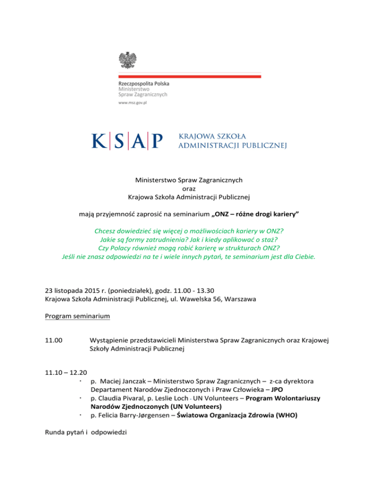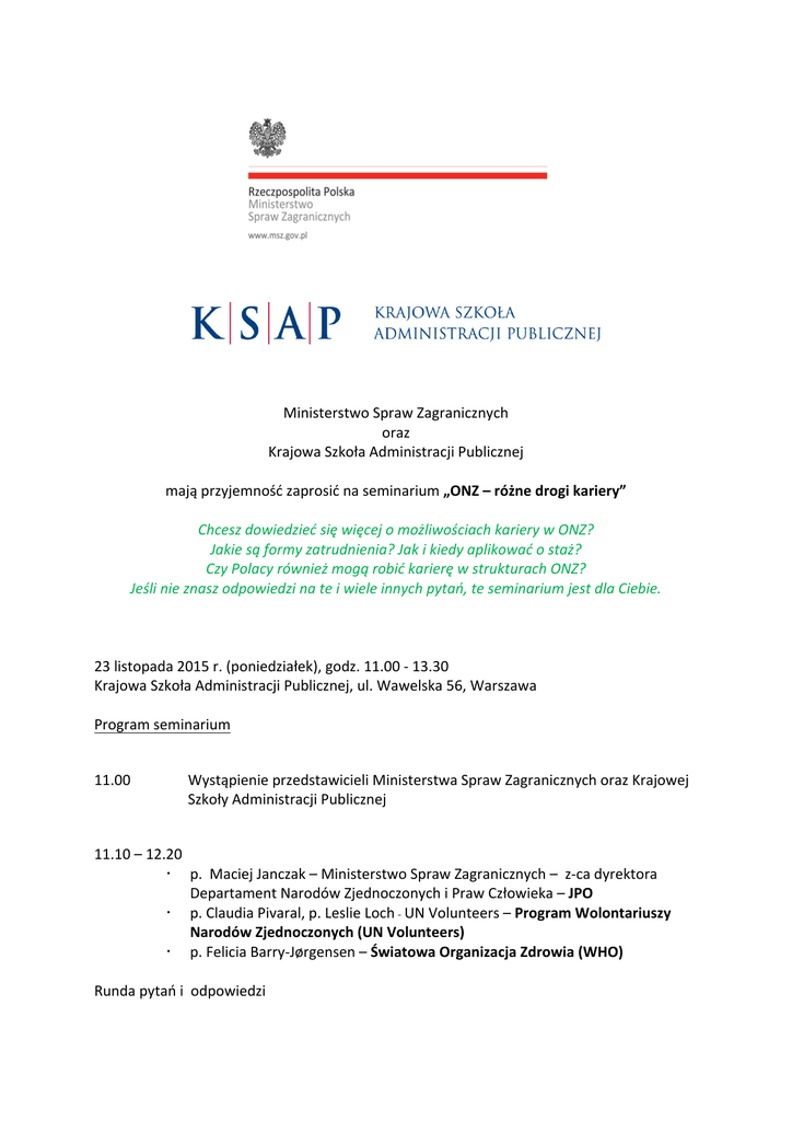 MinisterstwoSprawZagranicznych oraz KrajowaSzkołaAdministracjiPublicznej mająprzyjemnośćzaprosićnaseminarium„ONZ–różnedrogikariery” ChceszdowiedziećsięwięcejomożliwościachkarierywONZ? Jakiesąformyzatrudnienia?Jakikiedyaplikowaćostaż? CzyPolacyrównieżmogąrobićkarieręwstrukturachONZ? Jeślinieznaszodpowiedzinateiwieleinnychpytań,teseminariumjestdlaCiebie. 23listopada2015r.(poniedziałek),godz.11.00-13.30 KrajowaSzkołaAdministracjiPublicznej,ul.Wawelska56,Warszawa Programseminarium 11.00 WystąpienieprzedstawicieliMinisterstwaSprawZagranicznychorazKrajowej SzkołyAdministracjiPublicznej 11.10–12.20 p.MaciejJanczak–MinisterstwoSprawZagranicznych–z-cadyrektora DepartamentNarodówZjednoczonychiPrawCzłowieka–JPO p.ClaudiaPivaral,p.LeslieLoch - UNVolunteers–ProgramWolontariuszy NarodówZjednoczonych(UNVolunteers) p.FeliciaBarry-Jørgensen–ŚwiatowaOrganizacjaZdrowia(WHO) Rundapytańiodpowiedzi 12.20–12.40: Przerwanakawę/prezentacjafilmuzrealizowanegoprzezMSZpt.MojadrogadoONZ 12.40–13.30: p.MariolaRatschka-dyrektorOśrodkaInformacjiONZwWarszawie– działaniainformacyjneUNIC p.Ann-CarinÖst-BiuroKrajoweWysokiegoKomisarzaNZdoSpraw Uchodźców(UNHCR)wWarszawie p.MariaAndrzejewska-CentrumInformacjioŚrodowiskuUNEP/GRIDw Warszawie Rundapytańiodpowiedzi Quiz Podsumowanie Prosimyopotwierdzenieobecnoścido16listopada2015r. naadrese-mail:[email protected];[email protected] Seminariumbędzieprowadzonewjęzykupolskimiangielskim.Nieprzewidujesiętłumaczenia. Ilośćmiejscograniczona. Udziałwwydarzeniujestbezpłatny.